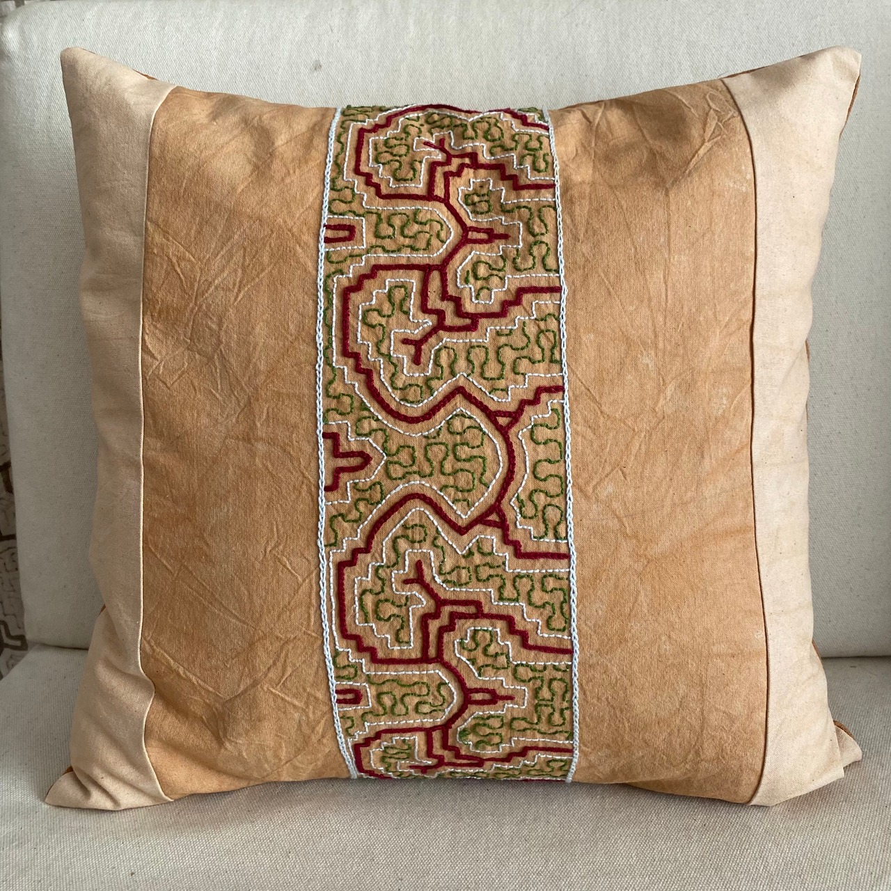 マホガニー染料でオレンジ系の薄い色に染め手刺繍した素材に同系の色味を合わせてクッションのサイズにデザインしました。裏側は薄いコットンをマホガニーで染めた同系の茶色で、ファスナーを付けずに、両側を重ねるタイプです。