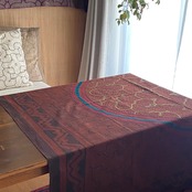 赤黒く染まった布、ざっくりとした刺繍 145x140cm キャンバス地のしっかり固めを、縁縫い加工しました。