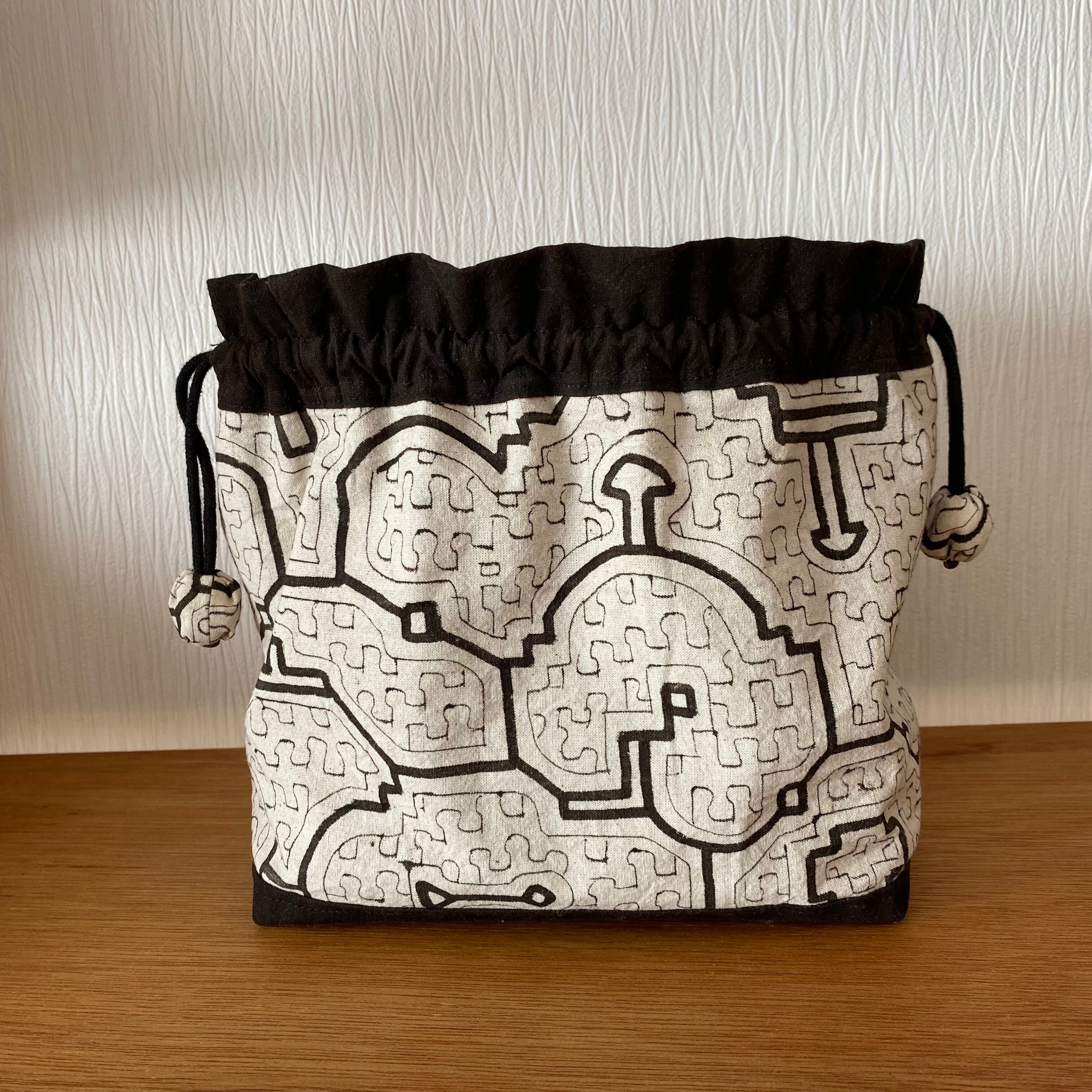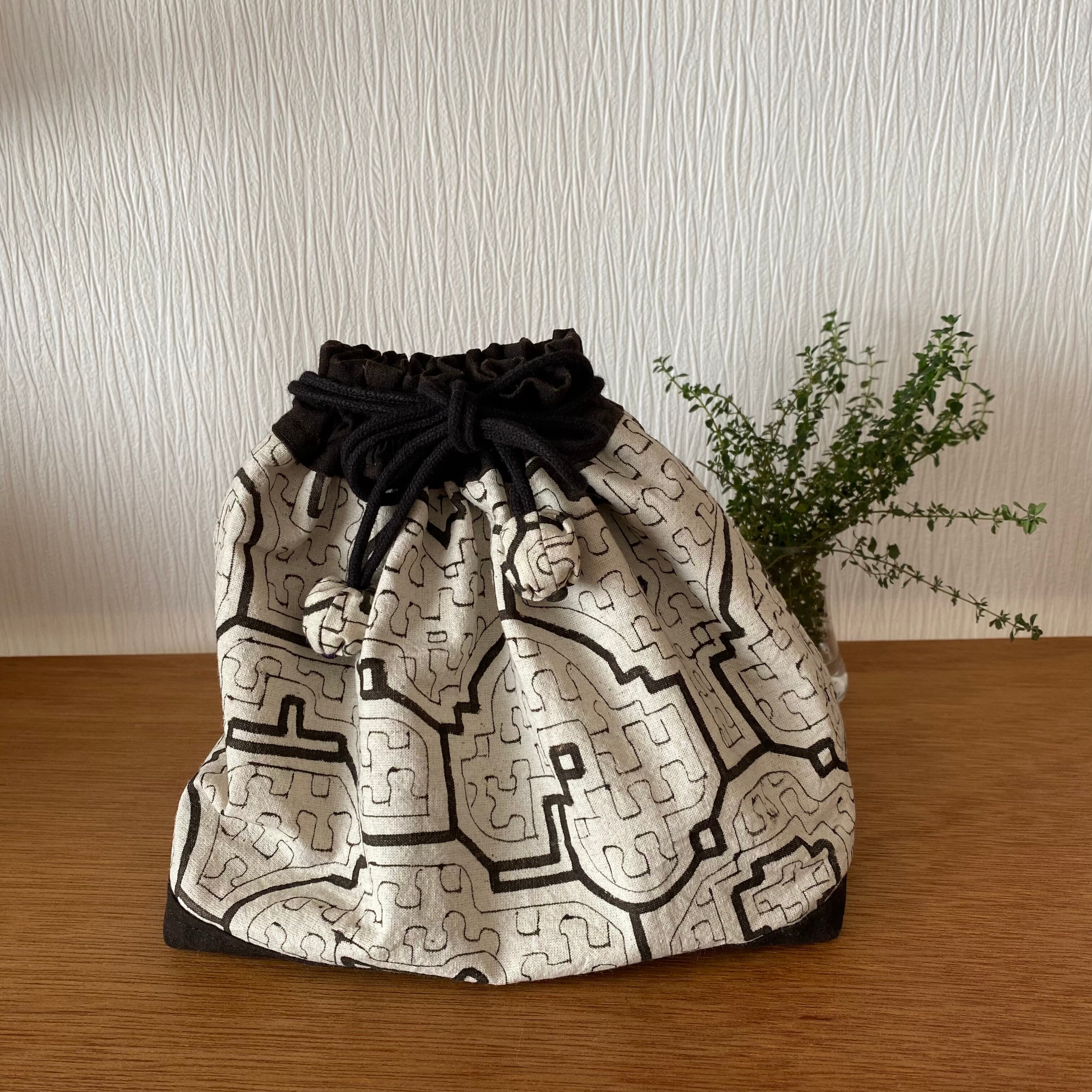 泥染めの生地を使用することを優先したため生地が硬いため巾着の絞り部分が少しゴワゴワしています。
