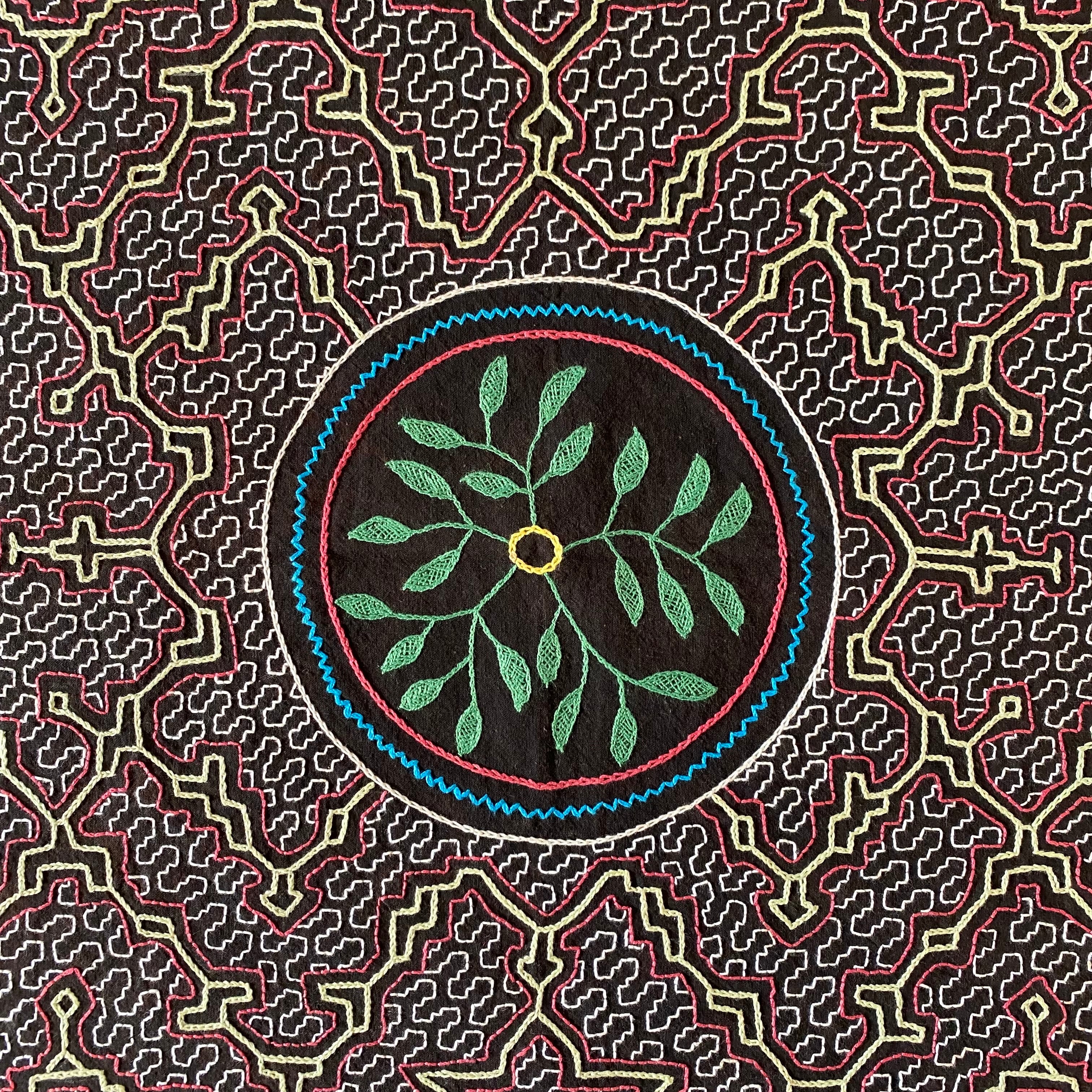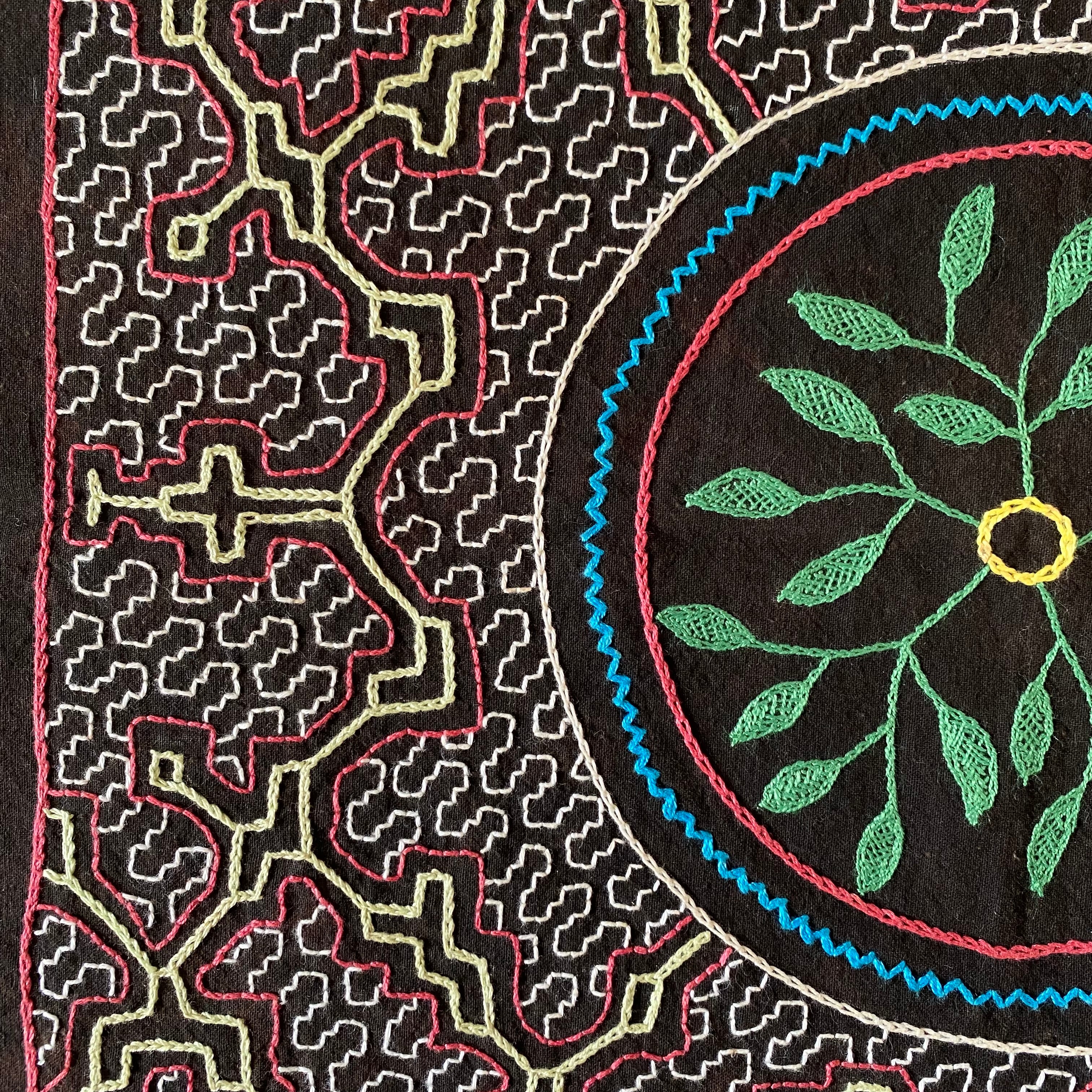 展示会で販売 中型刺繍 アヤワスカ6 青い円 47x53cm 植物 シピボ族の泥染め 先住民族の工芸 手刺繍