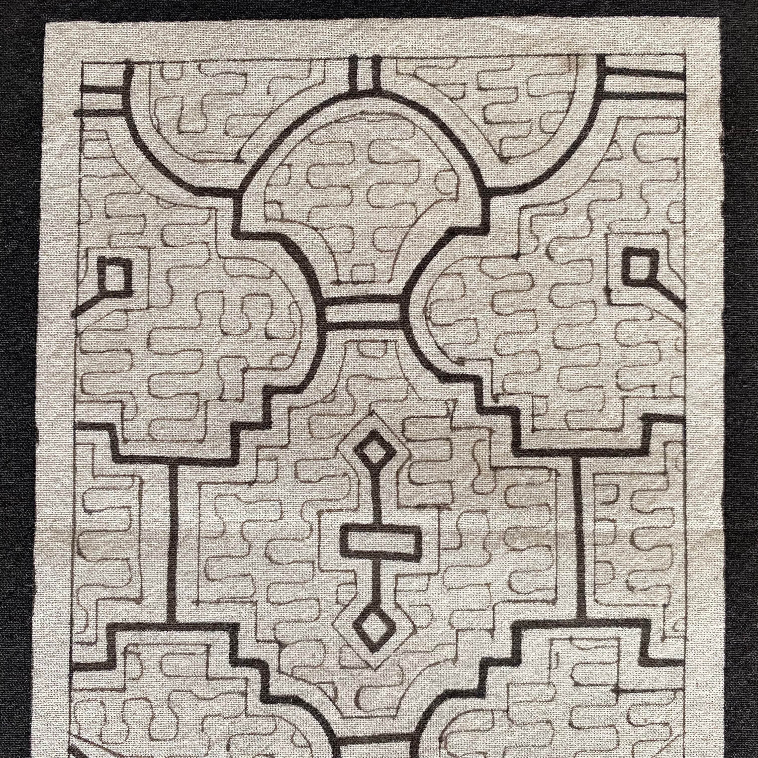 フリーハンドで描く模様の、細かい線までが漆黒に染まるのは、アマゾンの森の樹皮染液のタンニン色素の濃厚さと、秘密の大地に眠る「神聖な泥」の豊富な鉄分によるもので、深みのある黒を生み出します。