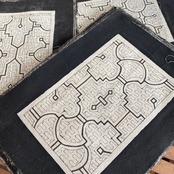 白地●樹皮の茶色の染液でデザインを描いたら、模様全面に泥を塗り付けると模様だけが黒く染まり、最後に泥は洗い流します。