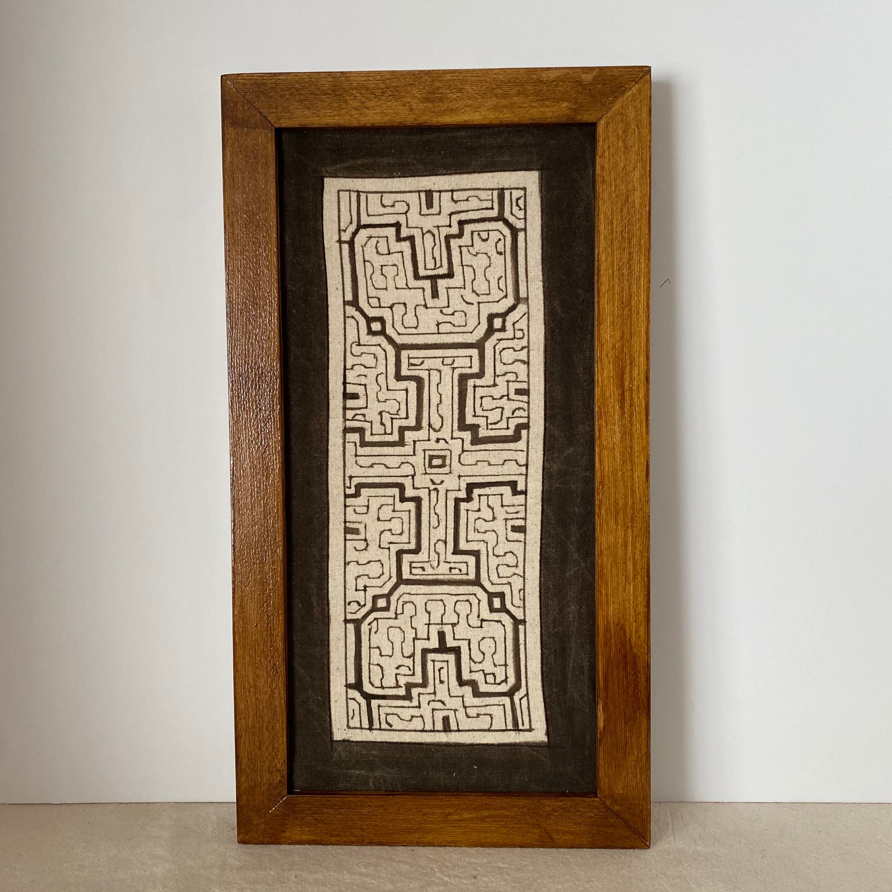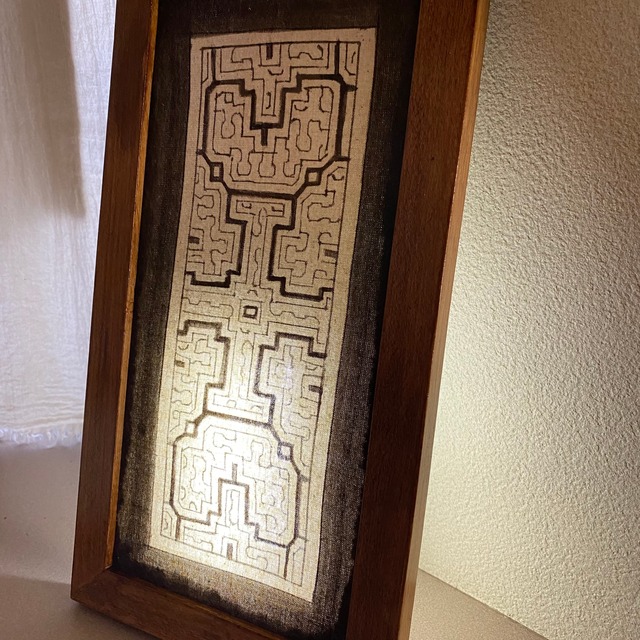 オリジナルのフレームに、ちょっと特別な方法で接着せずにシピボ族の泥染め布を取り付けました。裏側に板で蓋をしていないことでライトを当てると模様が透けて、ランタンのような味のある楽しみ方もできます。暗い玄関に置いても素敵。