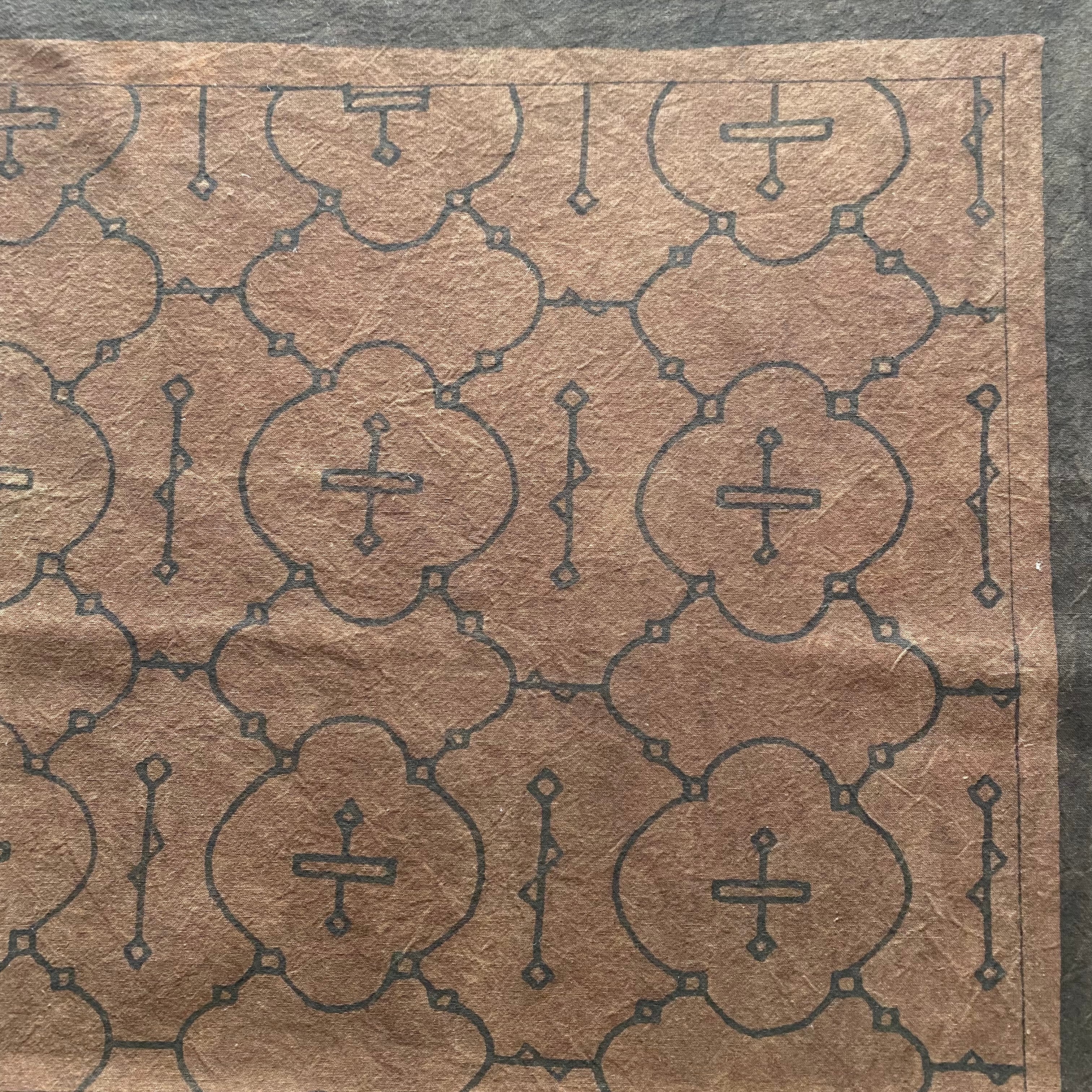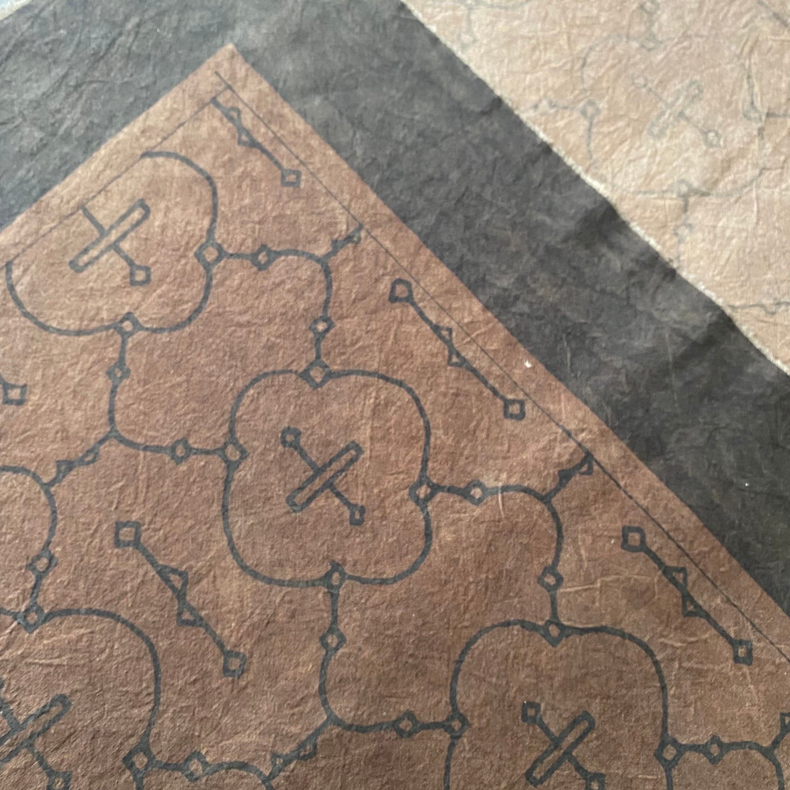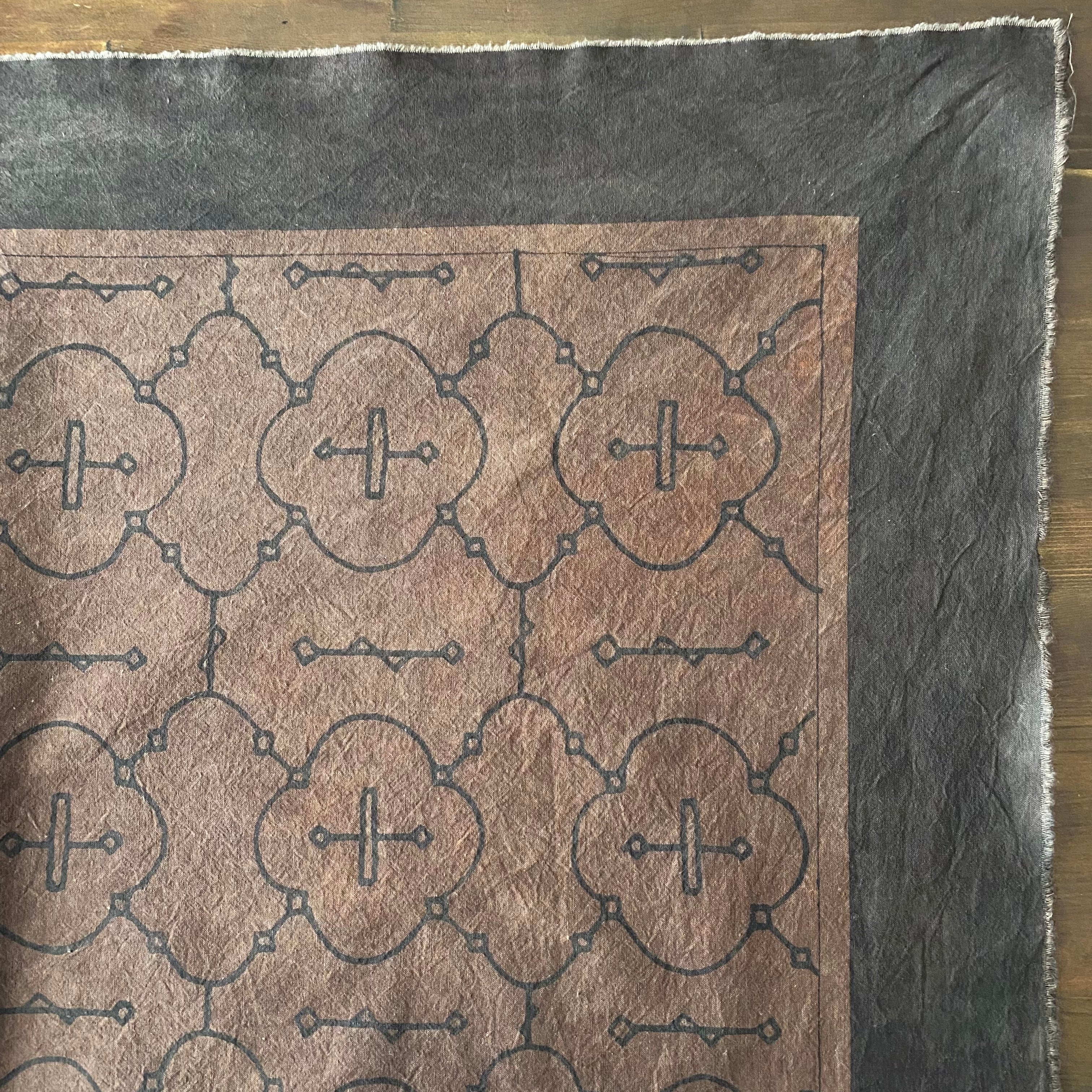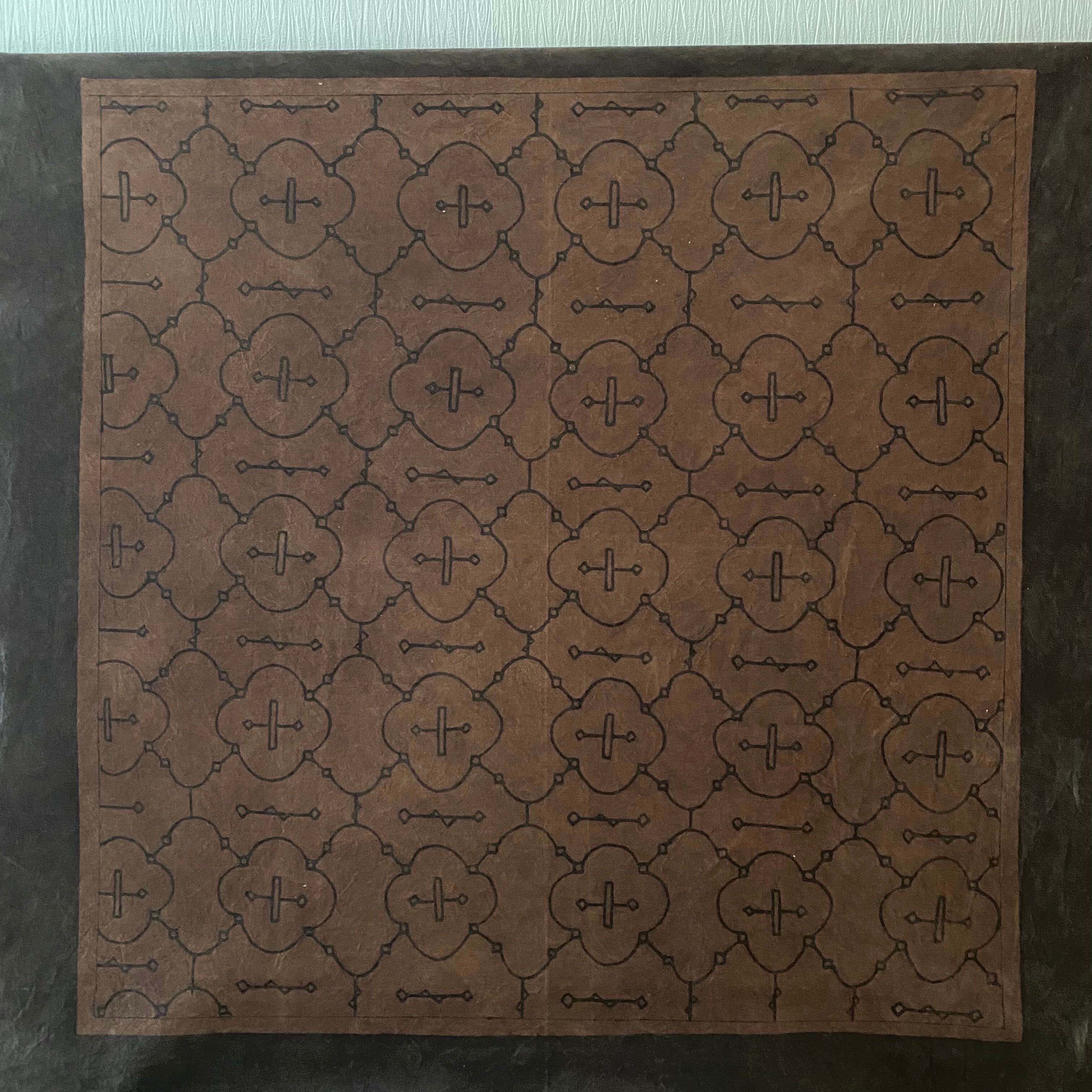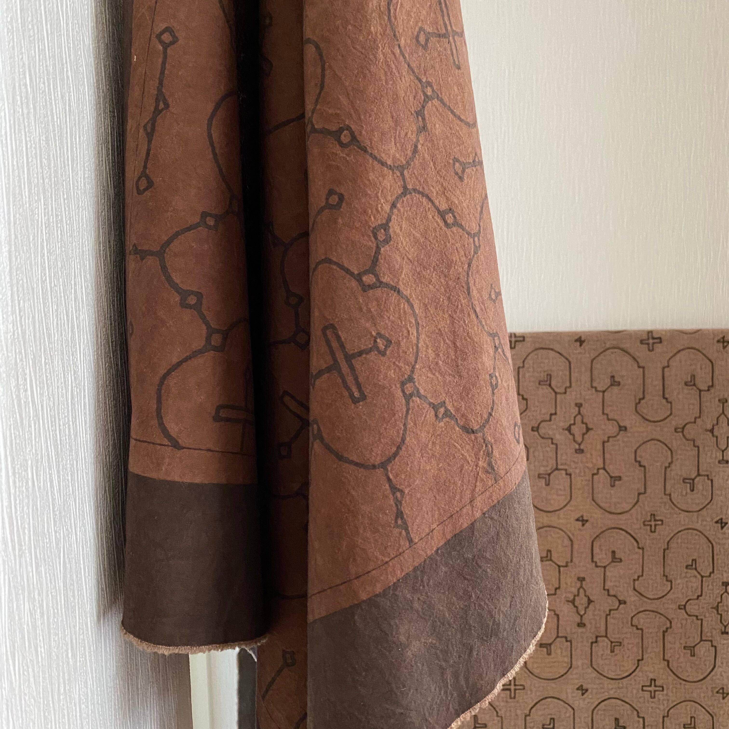 茶色と白地の二種類あり、どちらも「タンニン」を含む樹皮を煮出した染料と、森の奥地から採取する「鉄分」の強い特別な泥の化合を利用した染色方法で、フリーハンドで描かれる幾何学模様のデザインの部分だけが黒く染まることが特徴です。