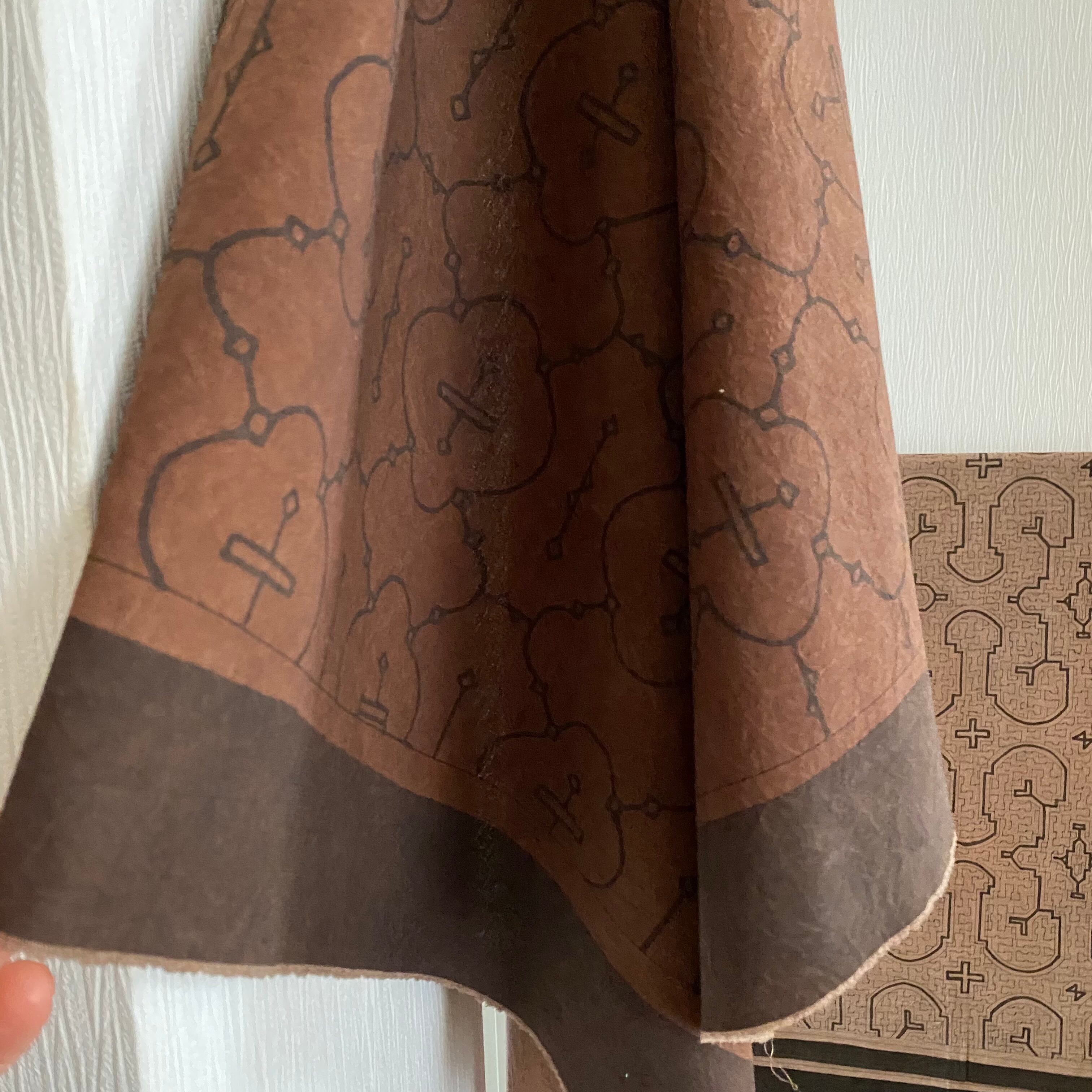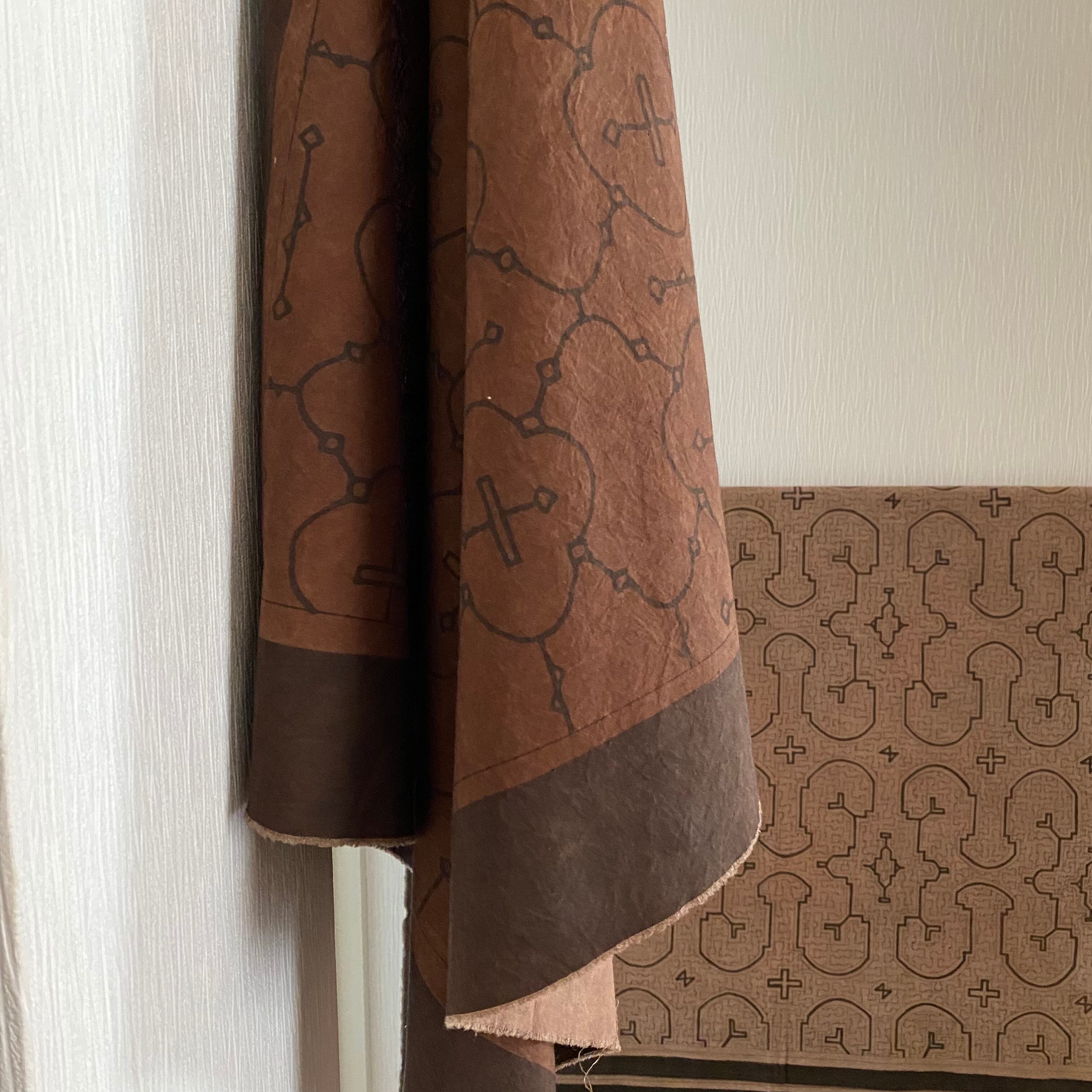 茶色●樹皮から煮出す茶色の染料で布を繰り返し染めた後に、鉄分の多い特別な泥でデザインを描き、最後に泥は洗い流します。