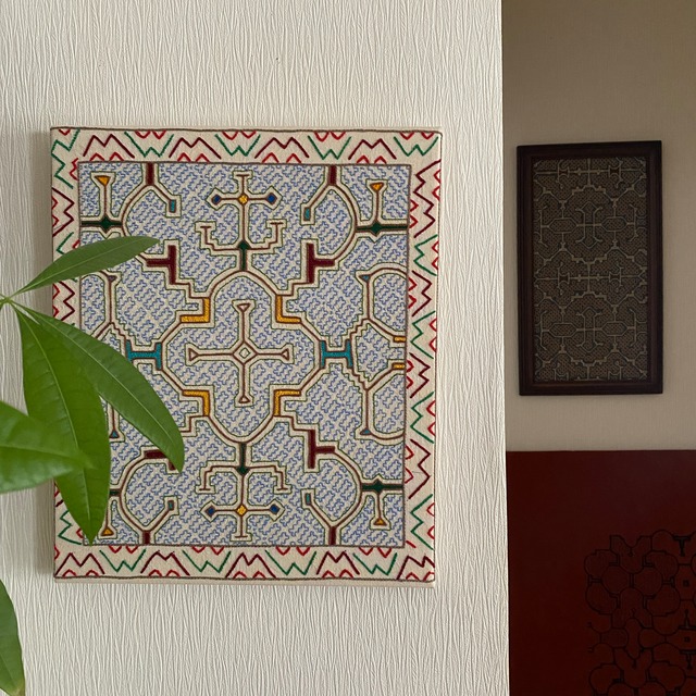 木枠13中型刺繍梅 シピボ族の刺繍3 中型38x46cm 青シピボ族手刺繍 スピリチュアルアート 先住民族の工芸Shipibo