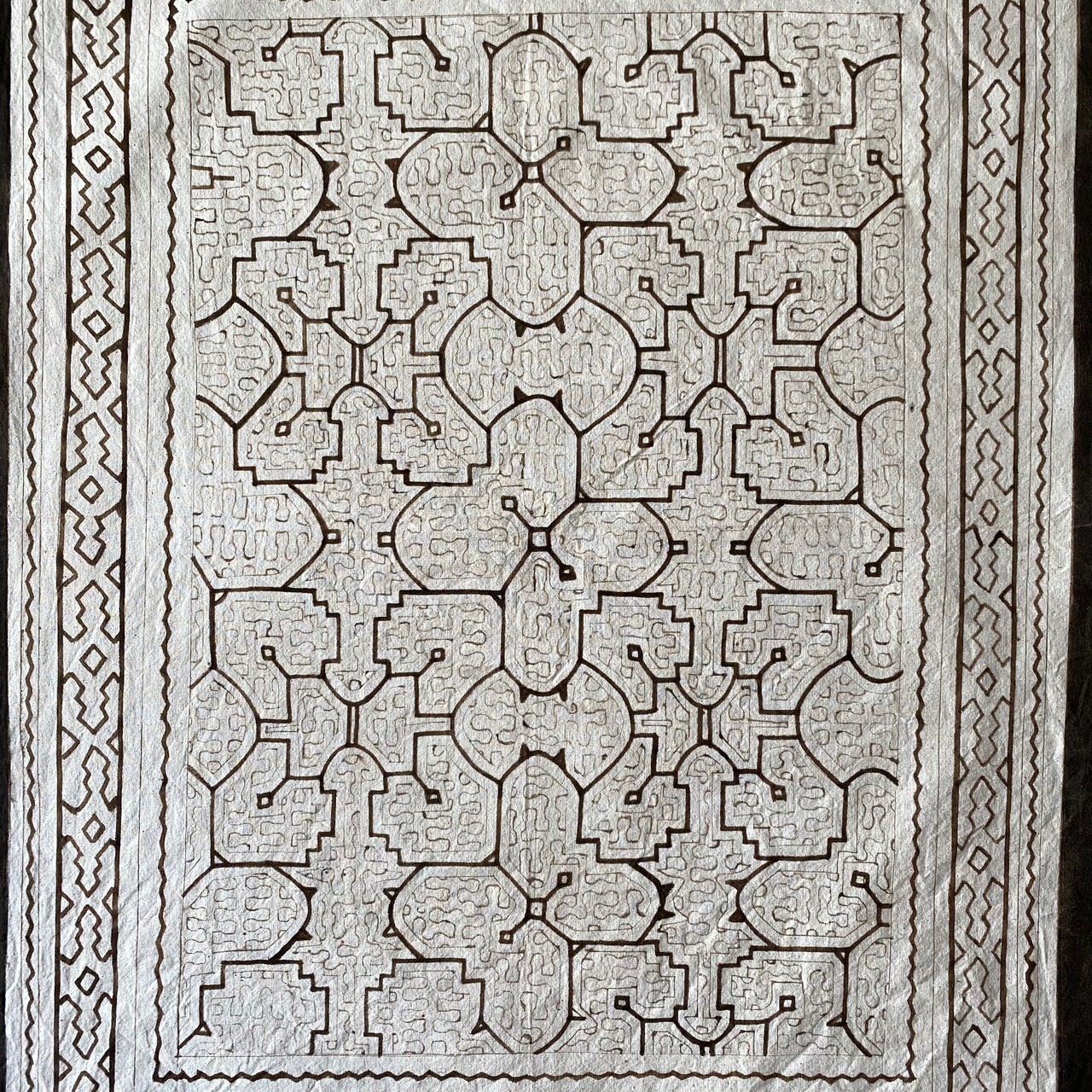 茶色と白地の二種類あり、どちらも「タンニン」を含む樹皮を煮出した染料と、森の奥地から採取する「鉄分」の強い特別な泥の化合を利用した染色方法で、フリーハンドで描かれる幾何学模様のデザインの部分だけが黒く染まることが特徴です。