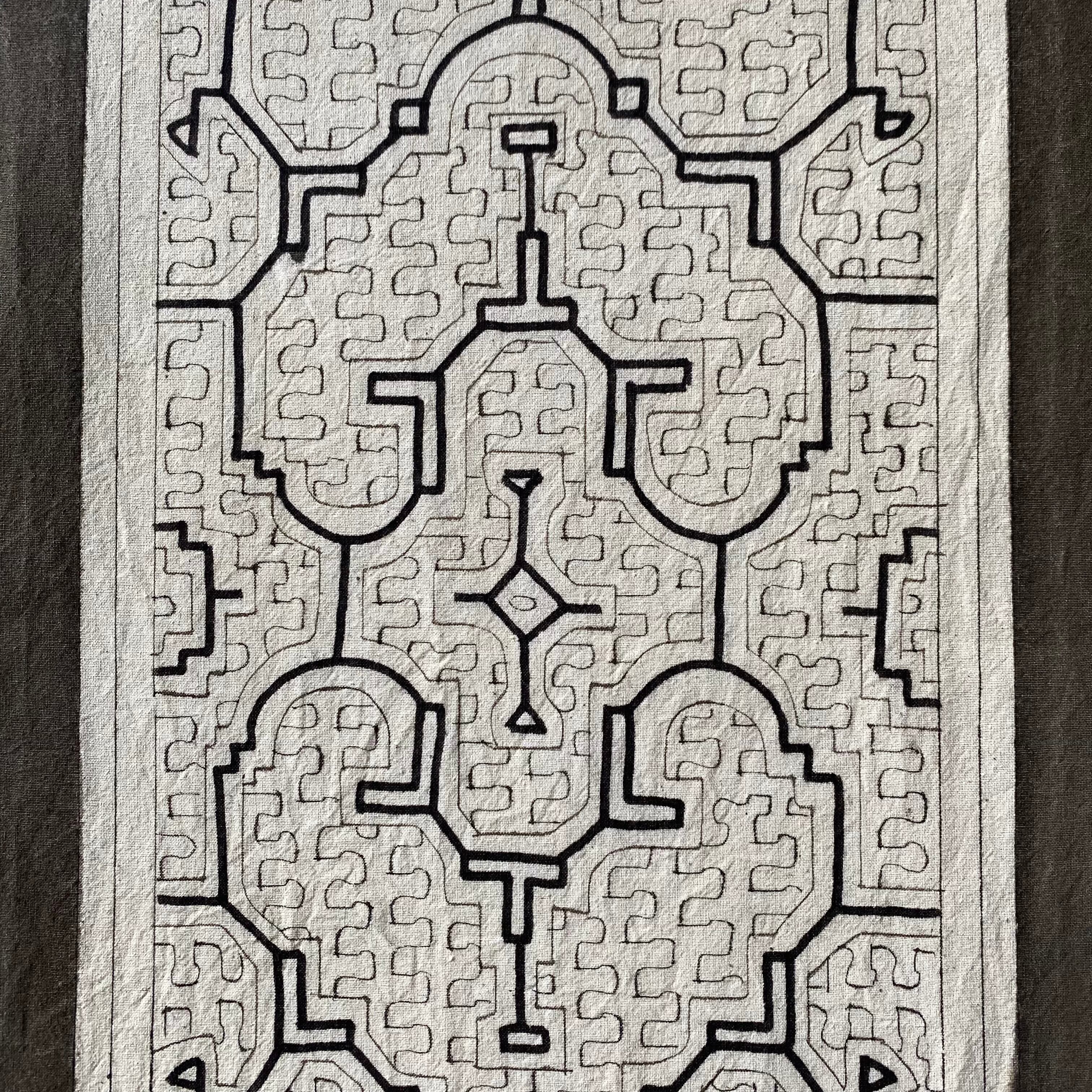 アマゾンの泥染めは、先住民族シピボ族の伝統工芸で、フリーハンドの幾何学模様を染める、希少価値の高い手工芸です。この布を使ってオーナー(AYACHI S)がバッグや布雑貨を手作りしています。 貴重な伝統工芸を少しでも長く作り続けて欲しいという想いから続けている活動です。