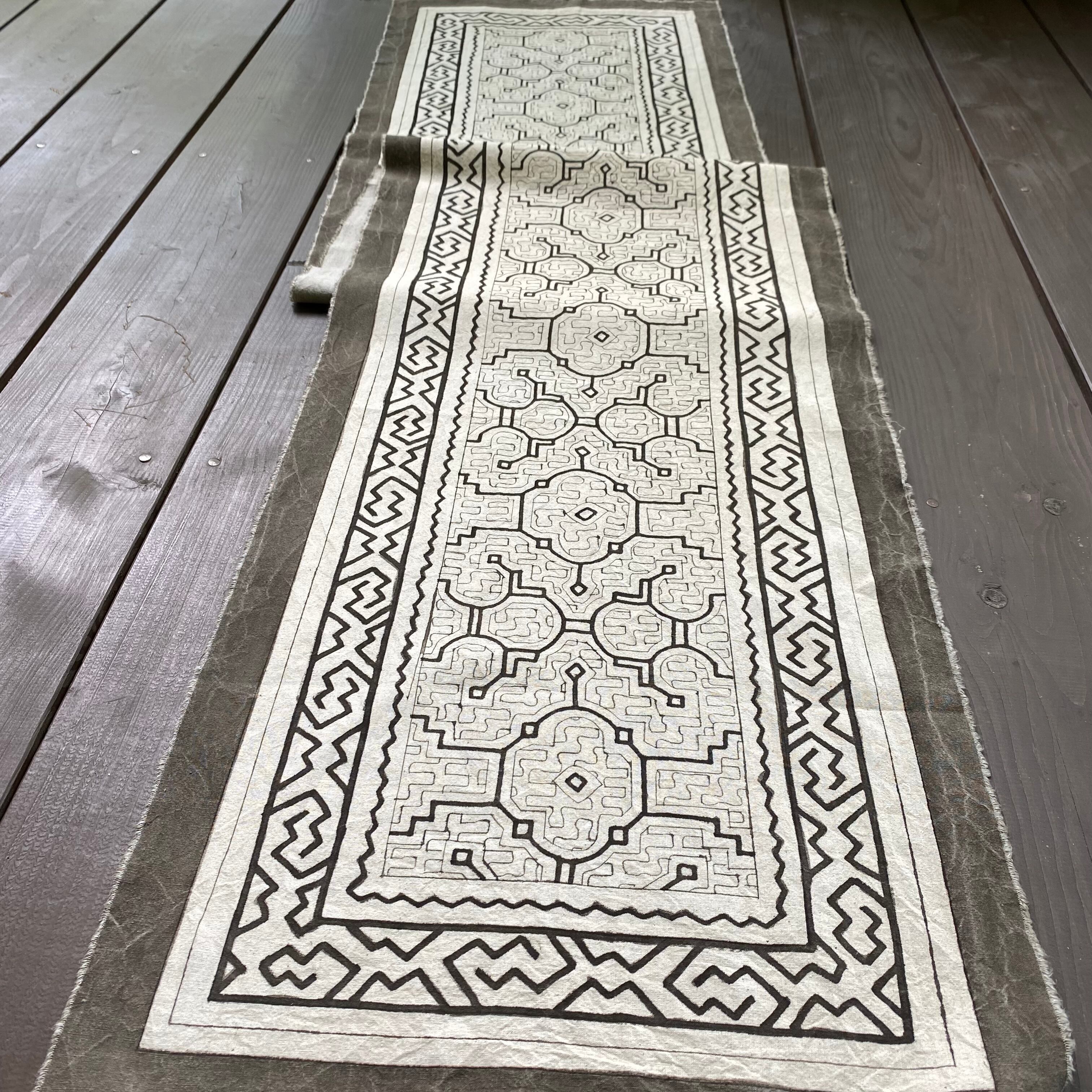 アマゾンの泥染めは、先住民族シピボ族の伝統工芸で、フリーハンドの幾何学模様を染める、希少価値の高い手工芸です。この布を使ってオーナー(AYACHI S)がバッグや布雑貨を手作りしています。 貴重な伝統工芸を少しでも長く作り続けて欲しいという想いから続けている活動です。