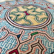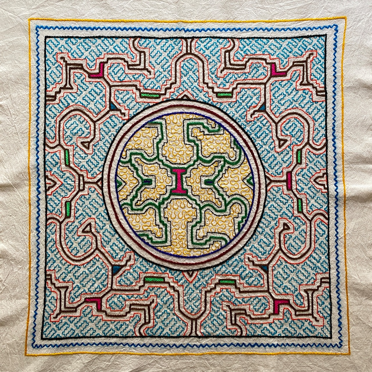 クッション シピボ族の刺繍中型le4 円黄50cm シピボ族手刺繍 空色 スピリチュアルアート 先住民族の工芸Shipibo