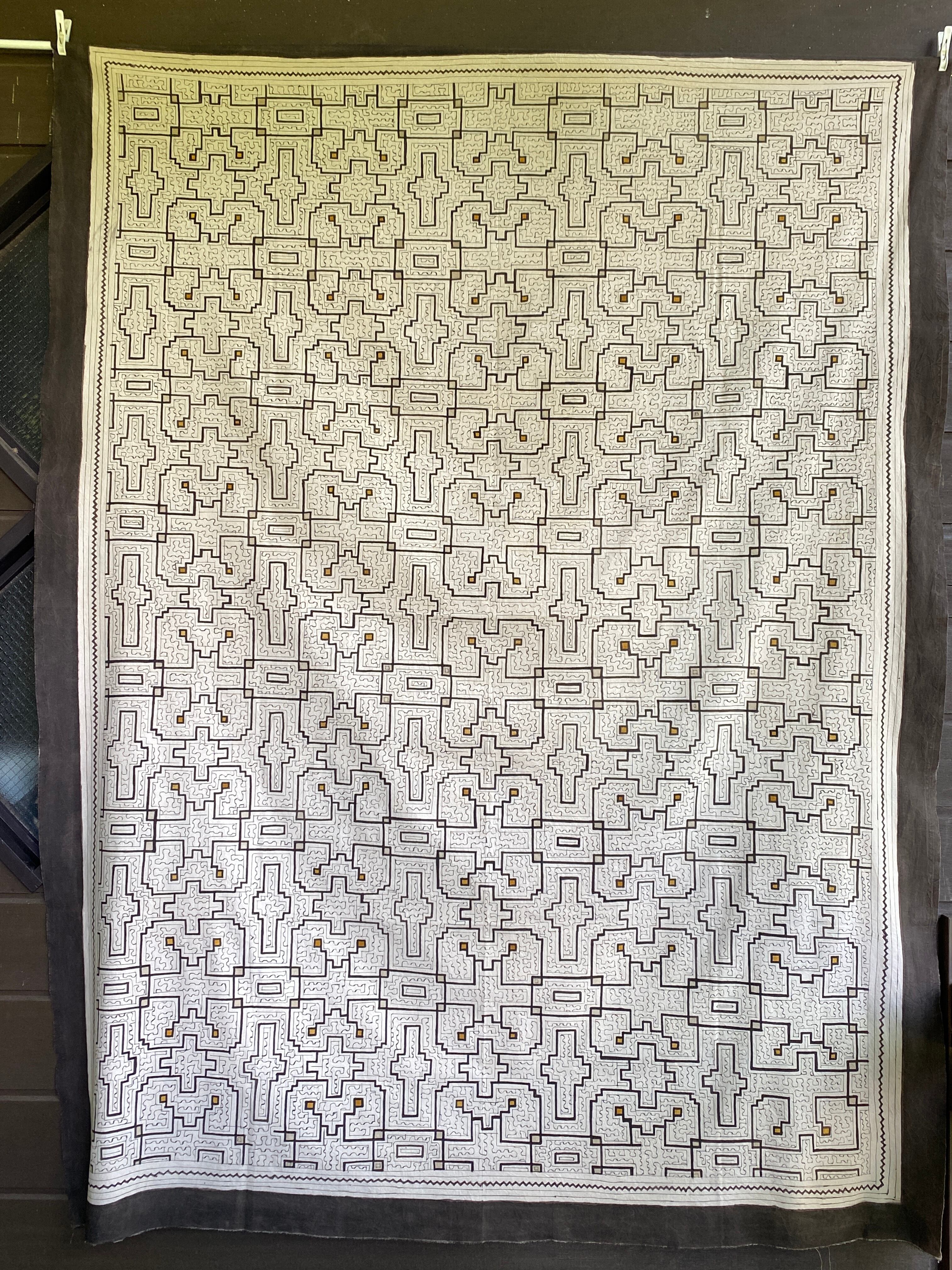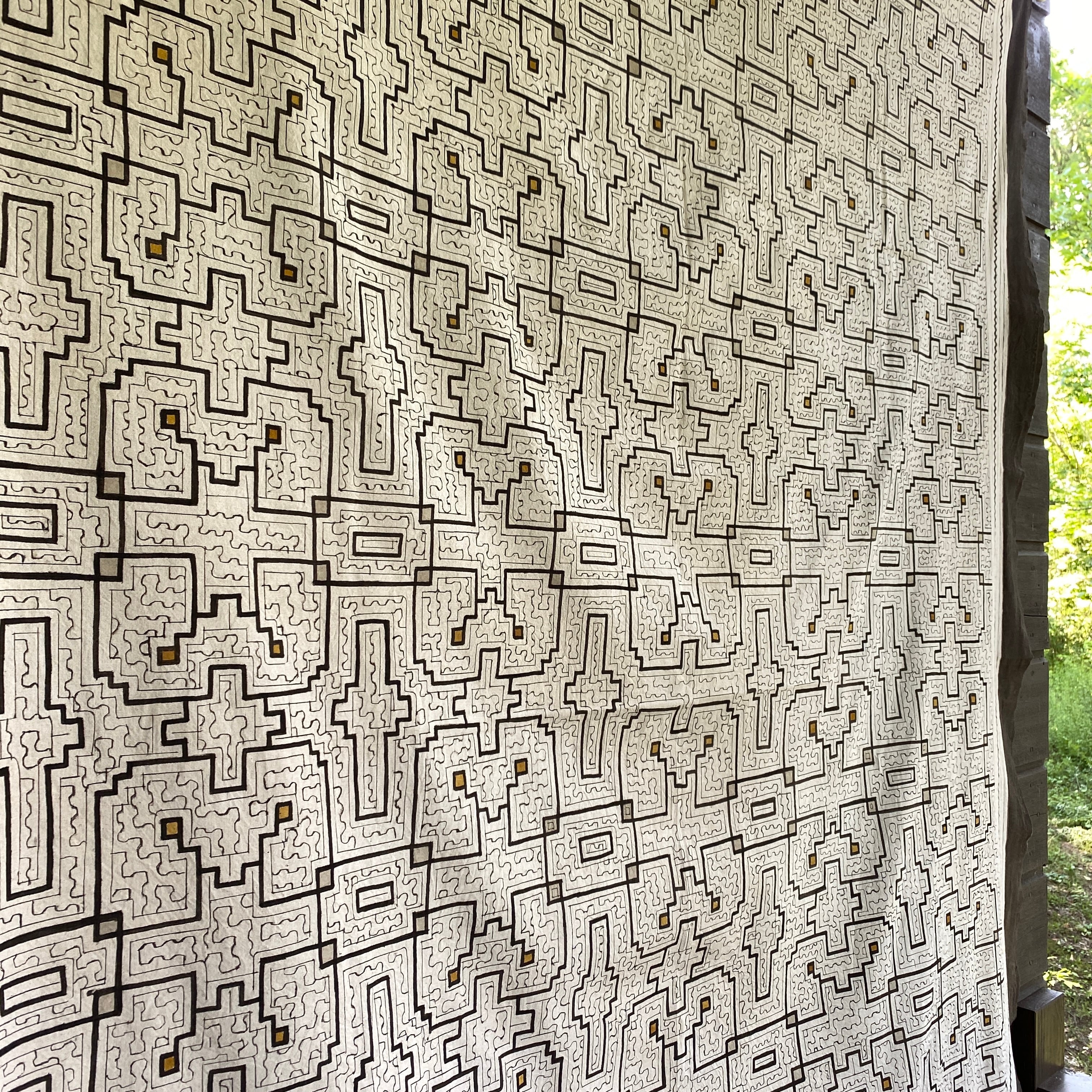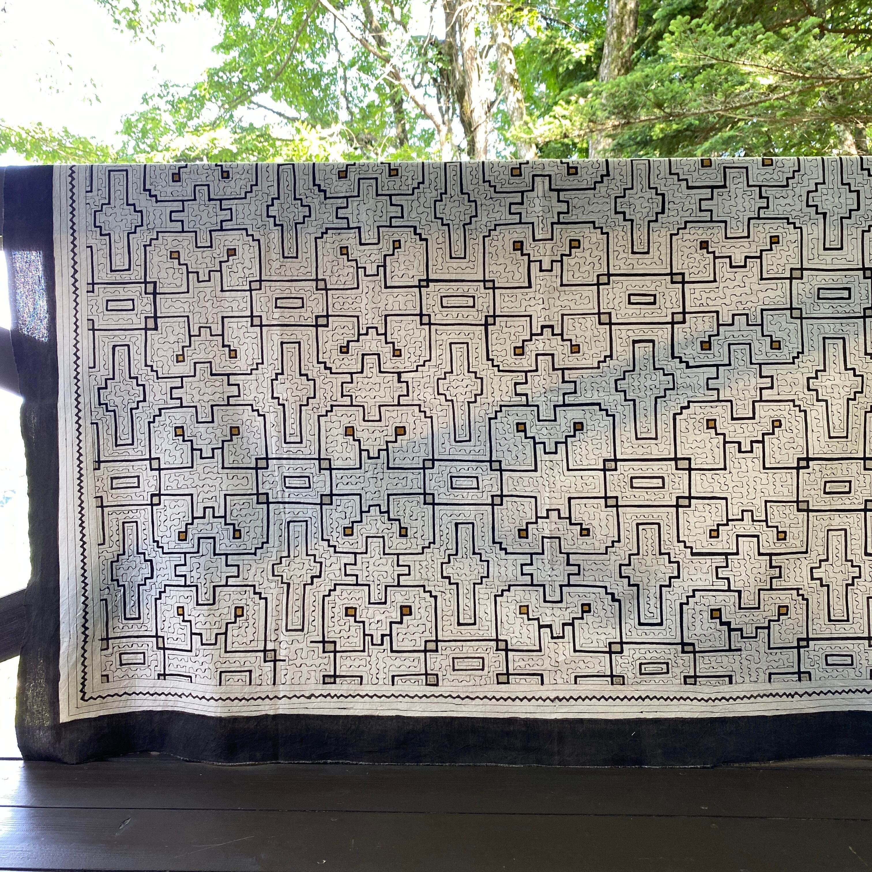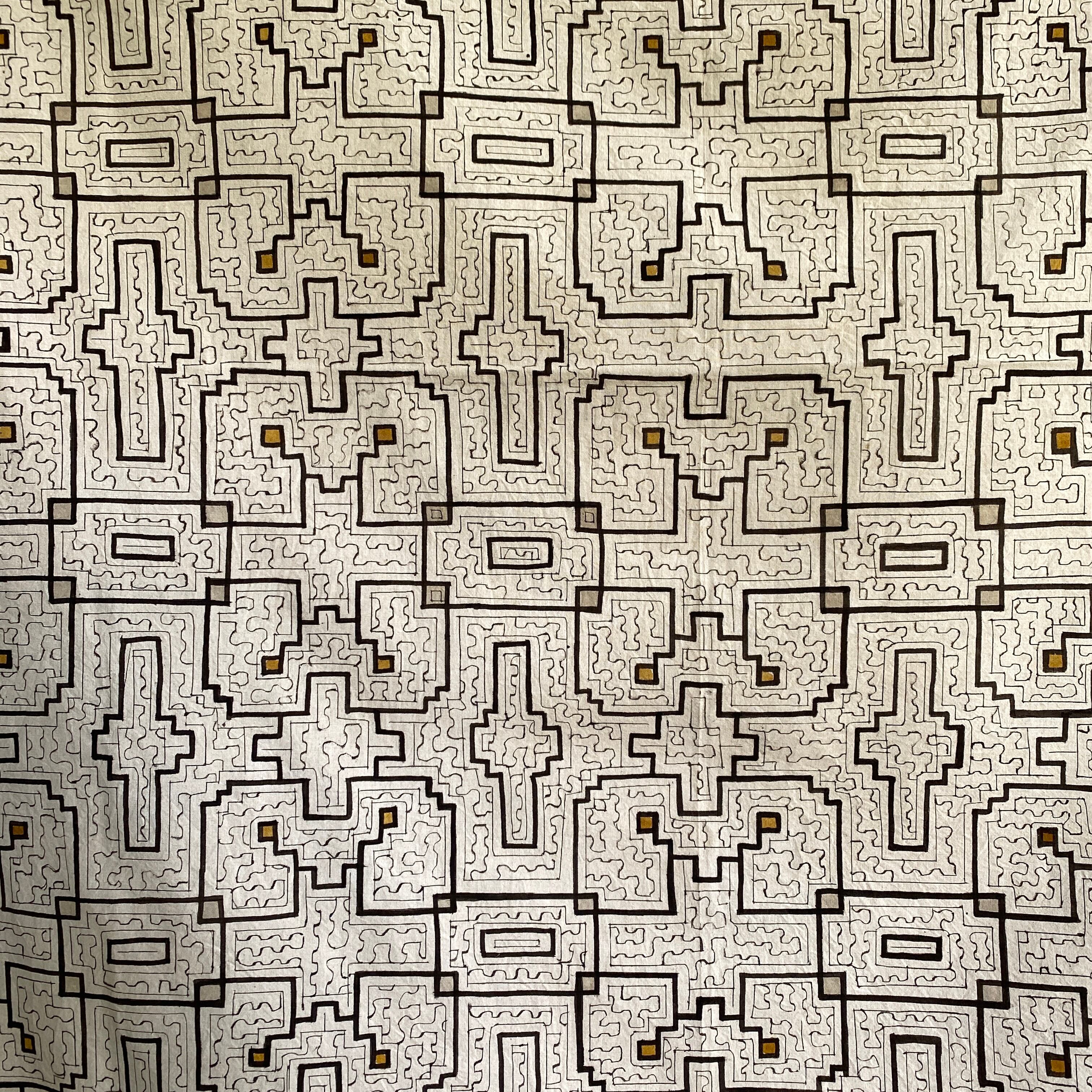 アマゾンの泥染めは、先住民族シピボ族の伝統工芸で、フリーハンドの幾何学模様を染める、希少価値の高い手工芸です。この布を使ってオーナー(AYACHI S)がバッグや布雑貨を手作りしています。 貴重な伝統工芸を少しでも長く作り続けて欲しいという想いから続けている活動です。