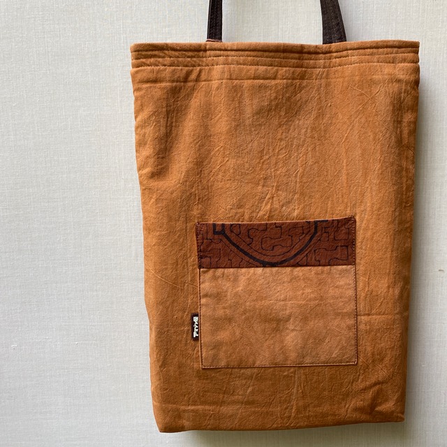 刺繍が美しく、額装用として残していたものをオレンジ色の発色の良い樹皮染めの布に合わせました。裏側もマホガニーなどの樹皮で現地で染めた茶色地でポケットも付けました。