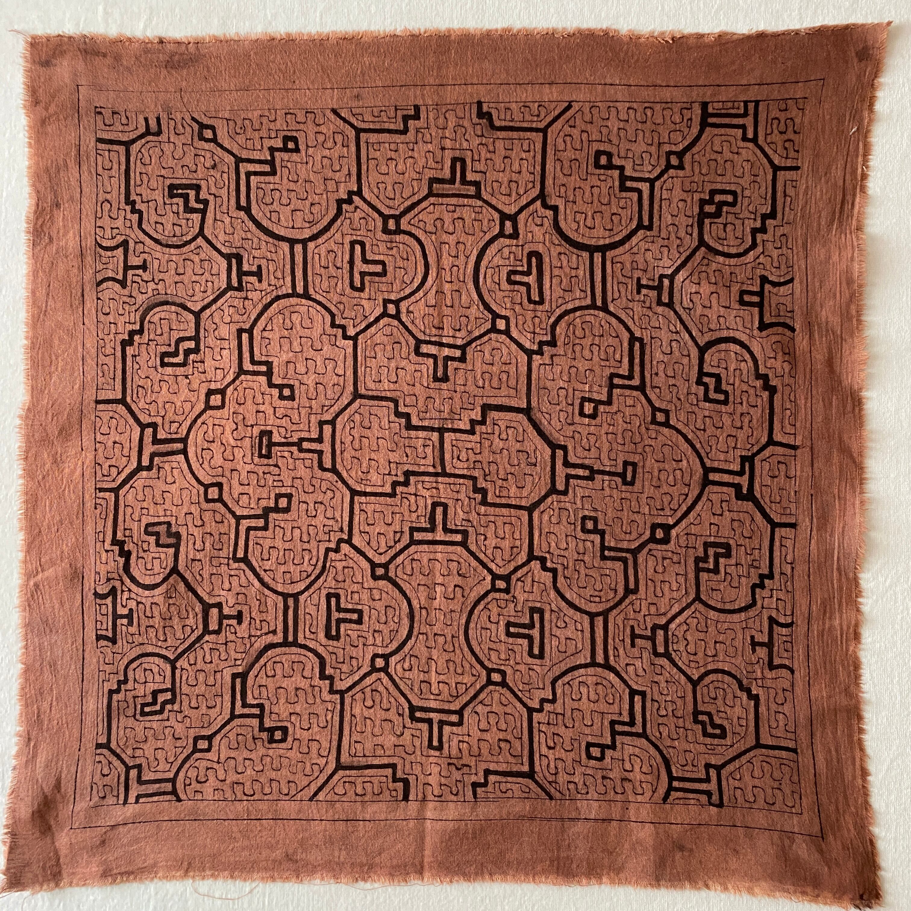 アマゾンの泥染めは、先住民族シピボ族の伝統工芸で、フリーハンドの幾何学模様を染める、希少価値の高い手工芸です。この布を使ってオーナー(AYACHI S)がバッグや布雑貨を手作りしています。 貴重な伝統工芸を少しでも長く作り続けて欲しいという想いから続けている活動です。