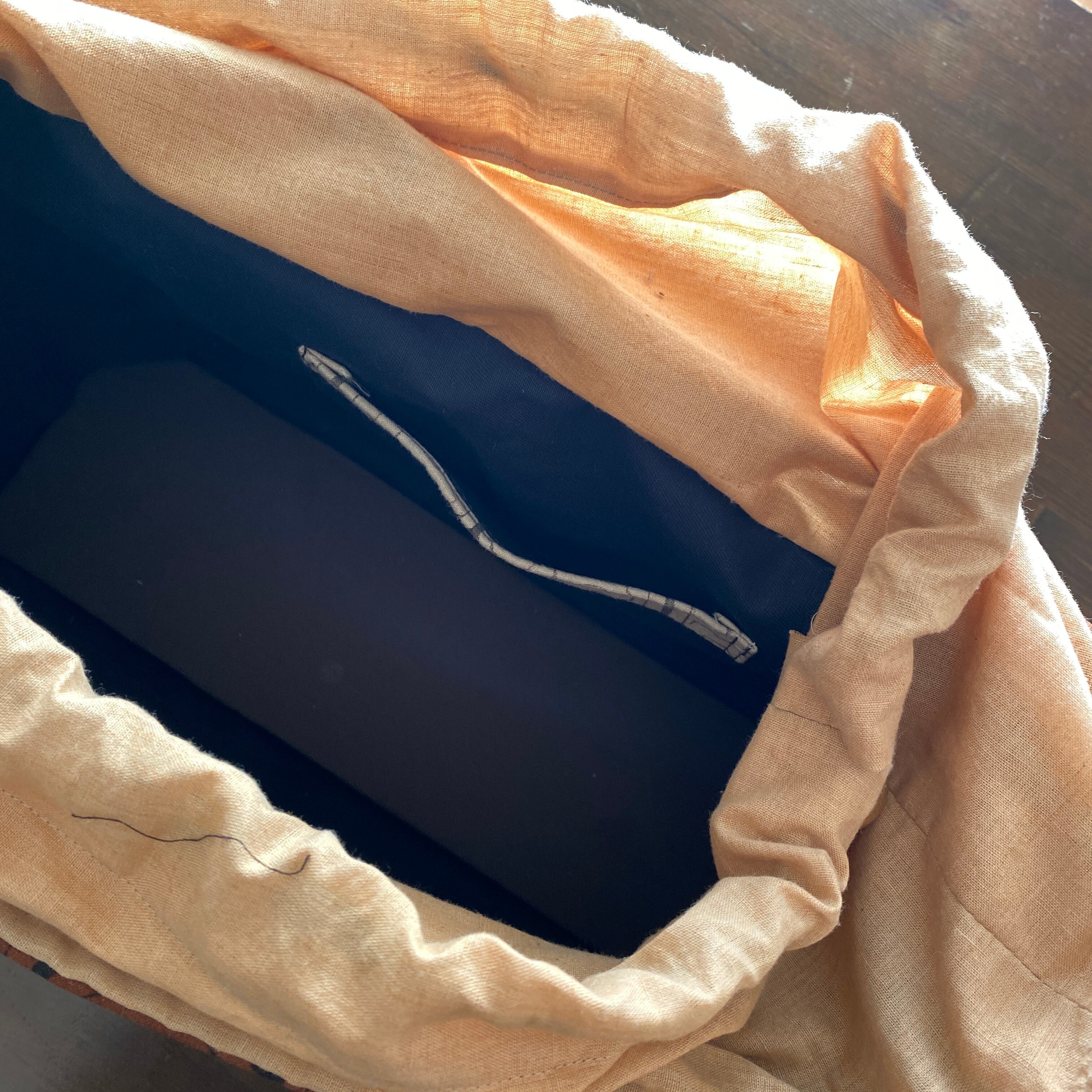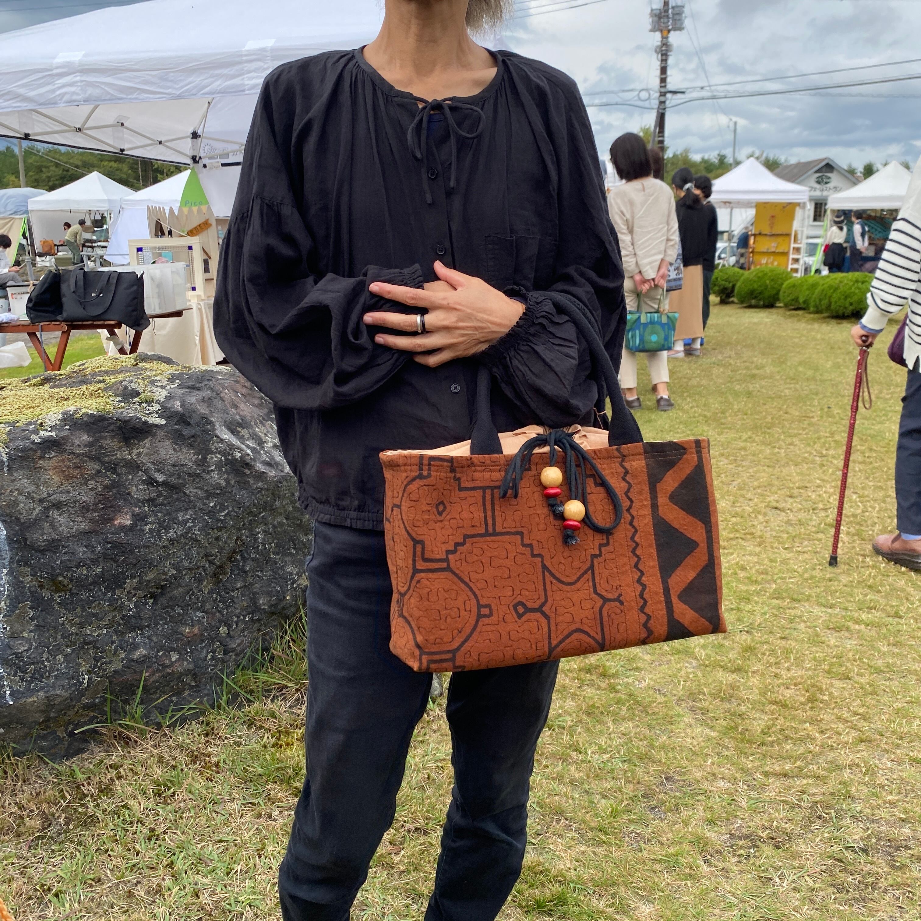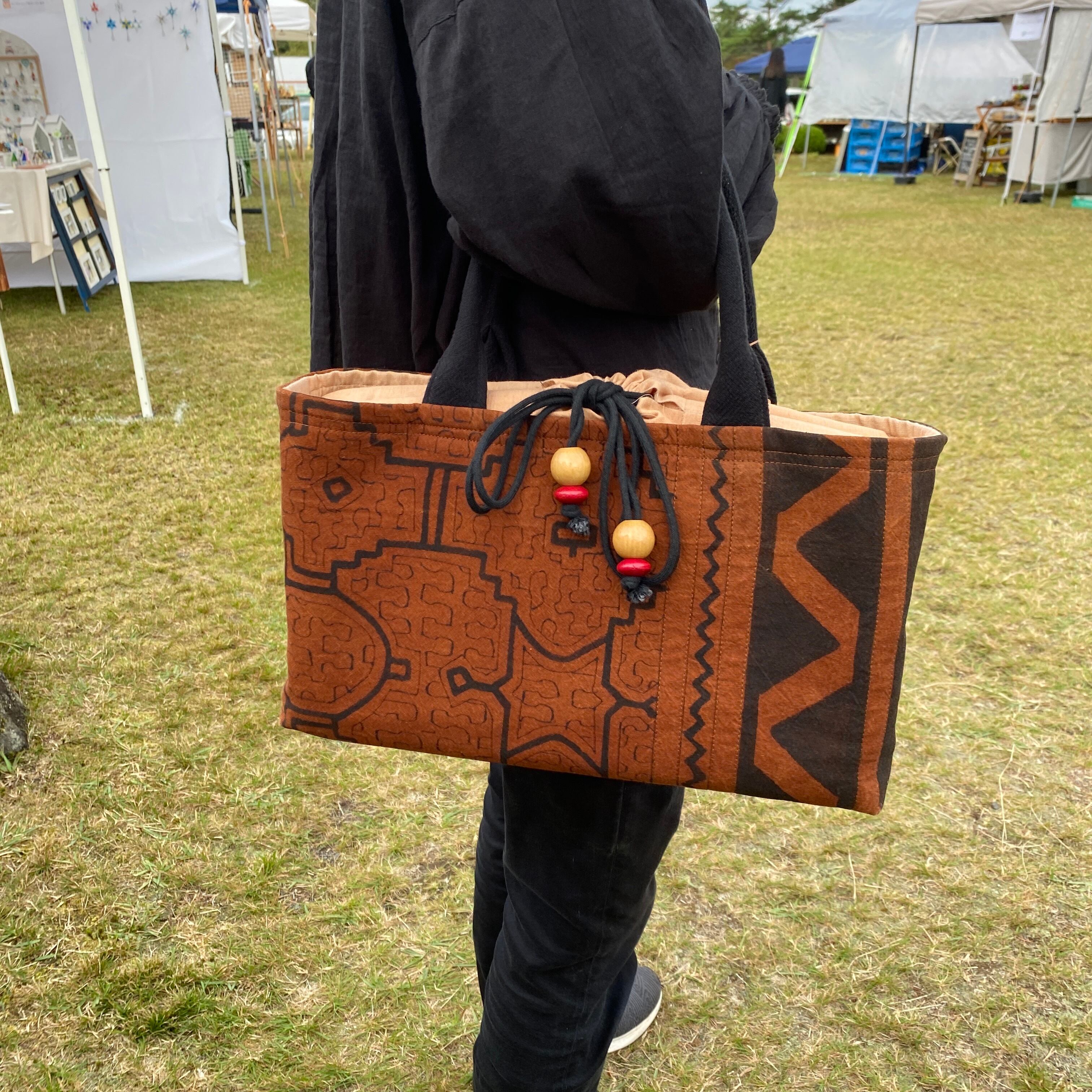 ぐるりとそこの部分まで全て泥染め模様で片側がギザギザのアクセントになり、茶色もアマゾンの太陽で染まる美しい茶色、模様も力強く美しいデザインです。巾着の部分も現地で染めた淡い色で合わせました。本体を柔らかめ帆布に縫い付ける方法で芯を作っているため、パリッと、というより中身を入れないと重さでフニャッとしますが、持ち手も太くてしっかりしているので重さに耐えられる丈夫な作りです。