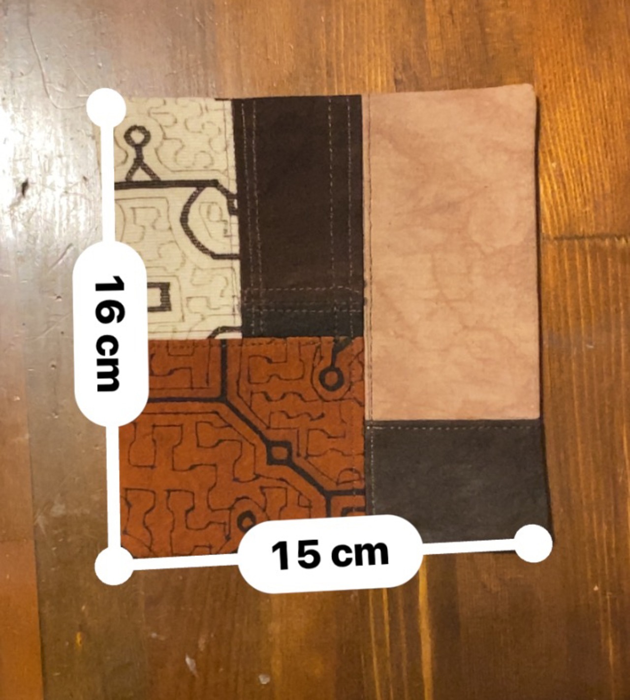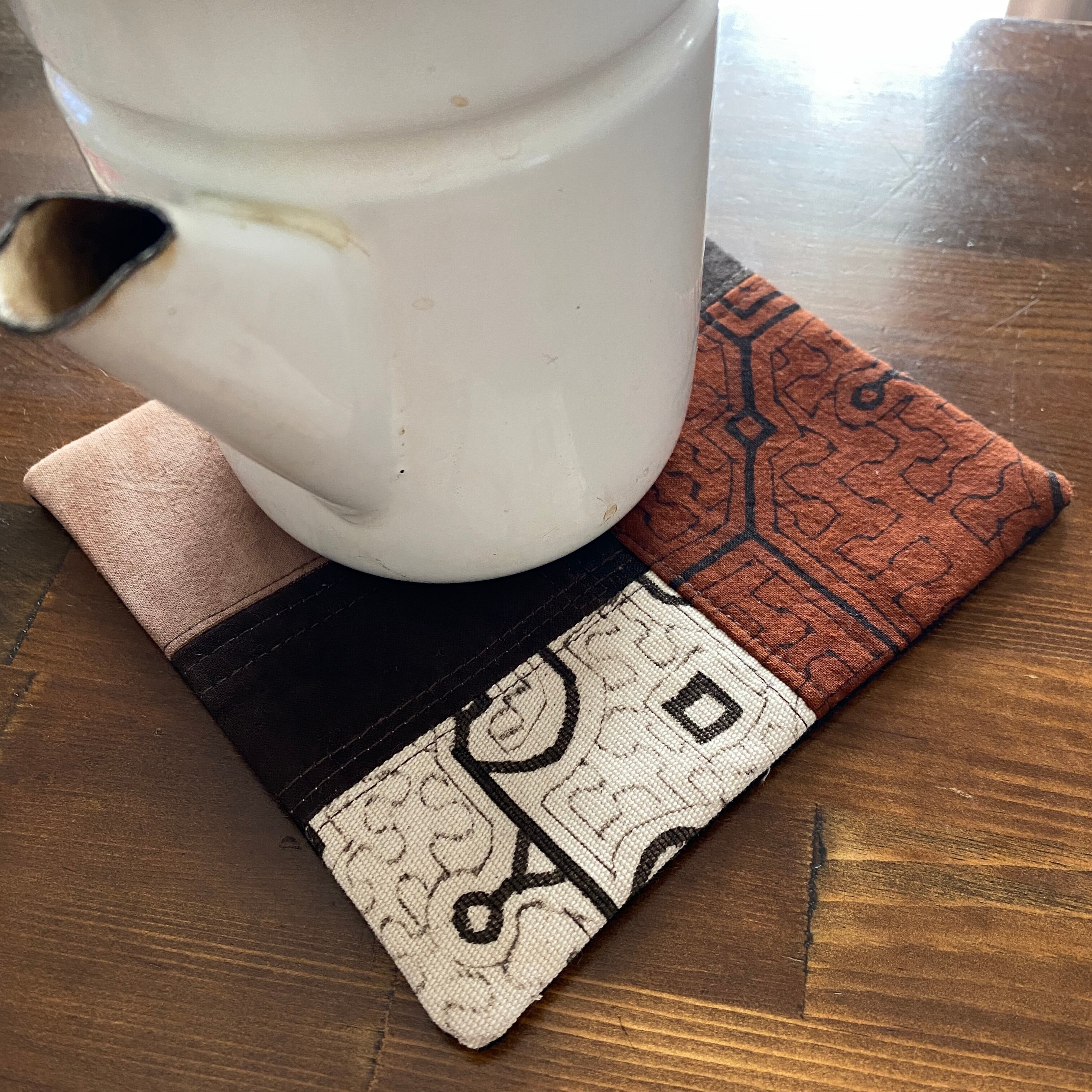 模様を染めた帆布生地のハギレや、芯を貼った硬い泥染め生地を合わせた丈夫なマットです。