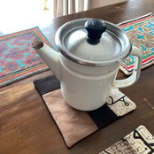 帆布生地のパッチワークなので縫い目がゴツゴツしているため軽い茶碗だと不安定なので、アヒージョ用の小さい鉄鍋などに良さそう。