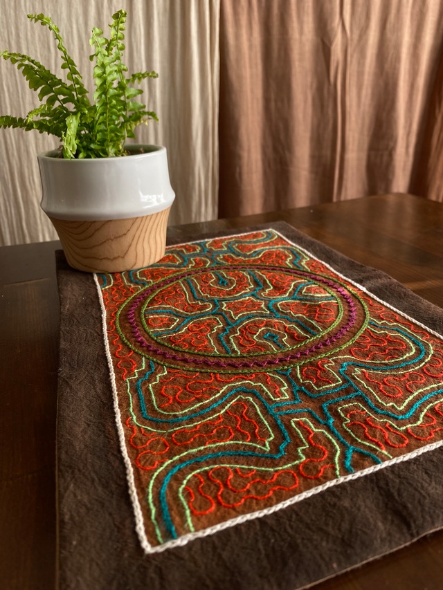 小型刺繍 泥染め刺繍マット円1 36x23cm 裏付き加工 シピボ族の泥染め 先住民族の手刺繍