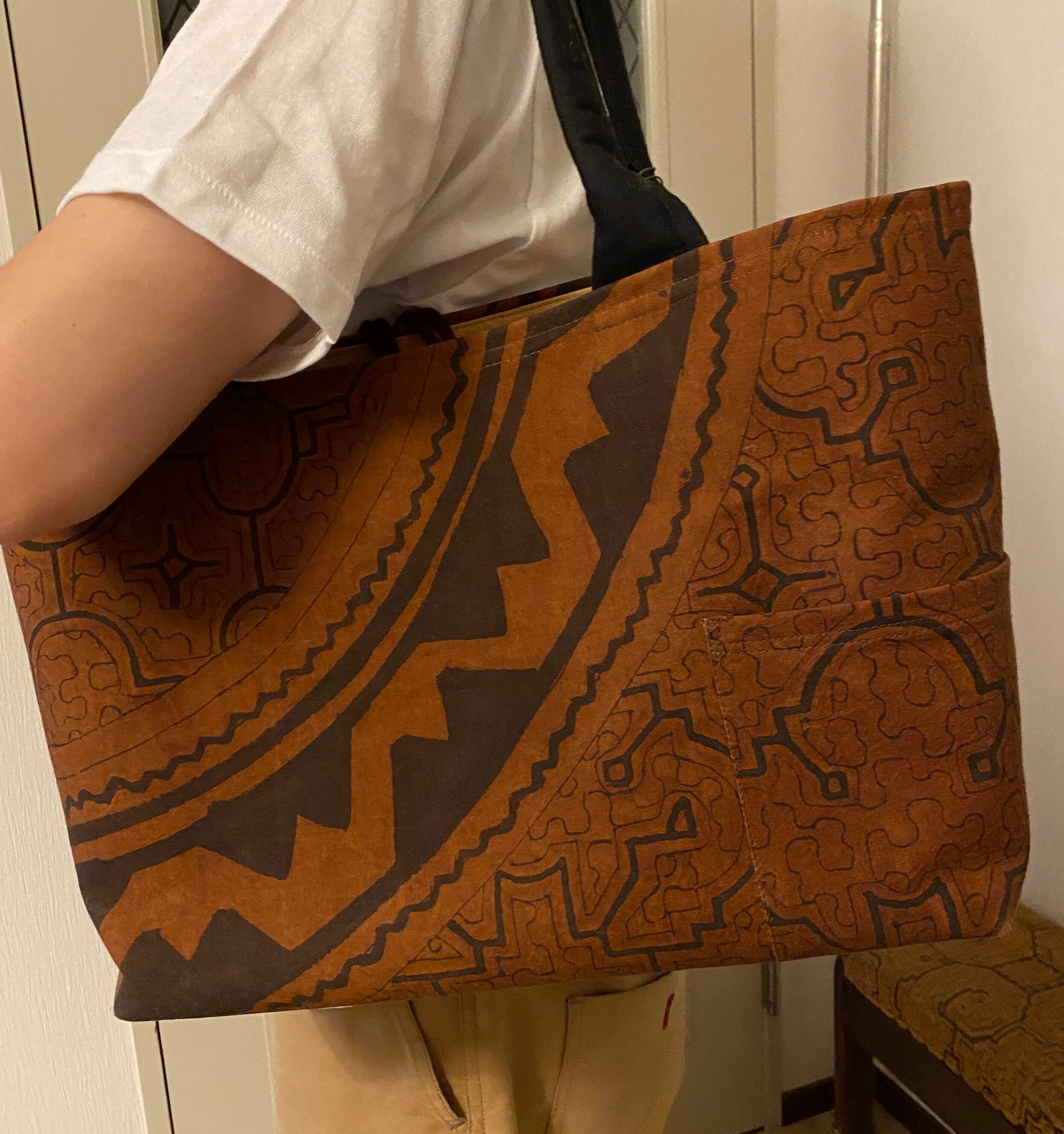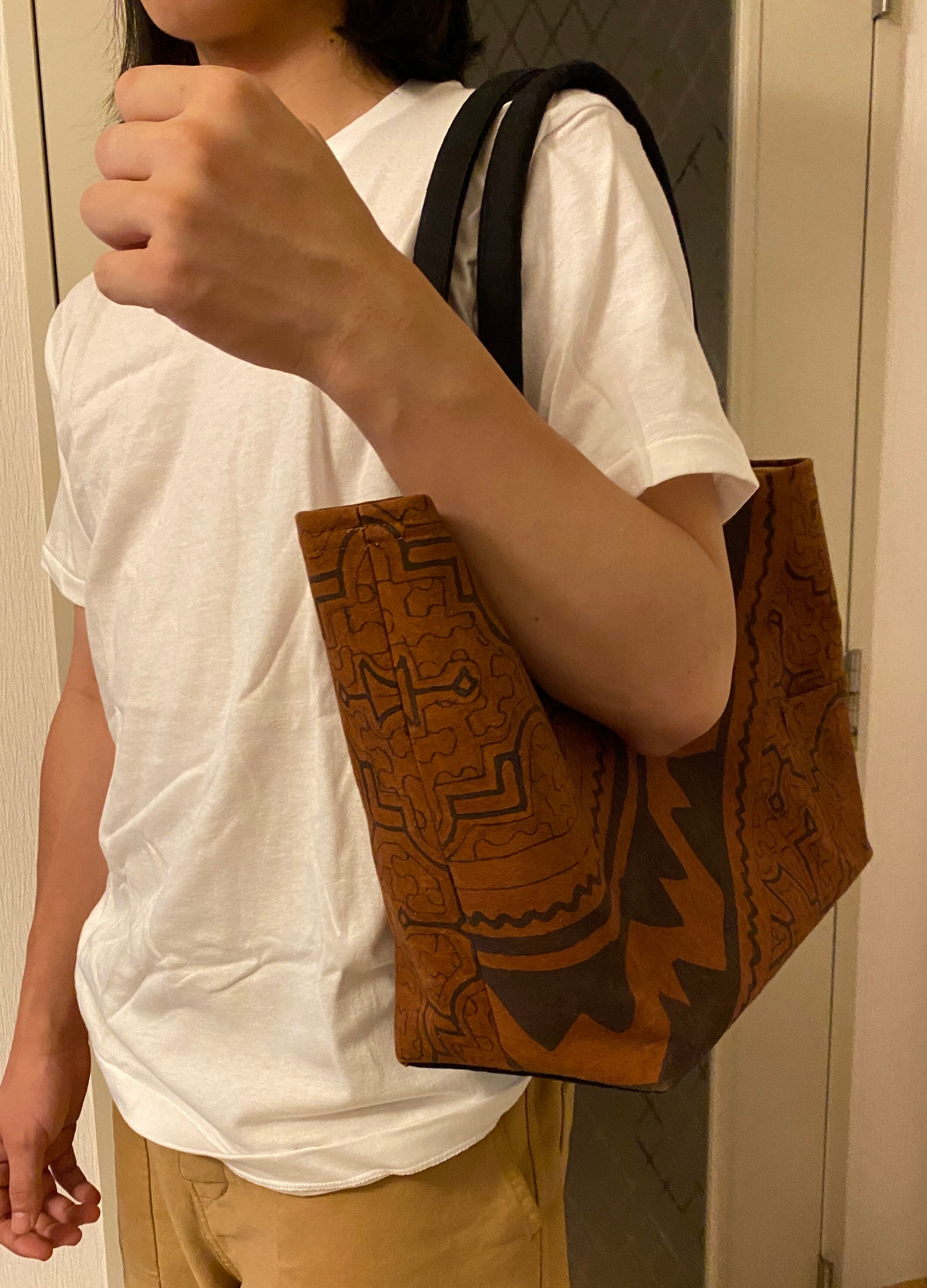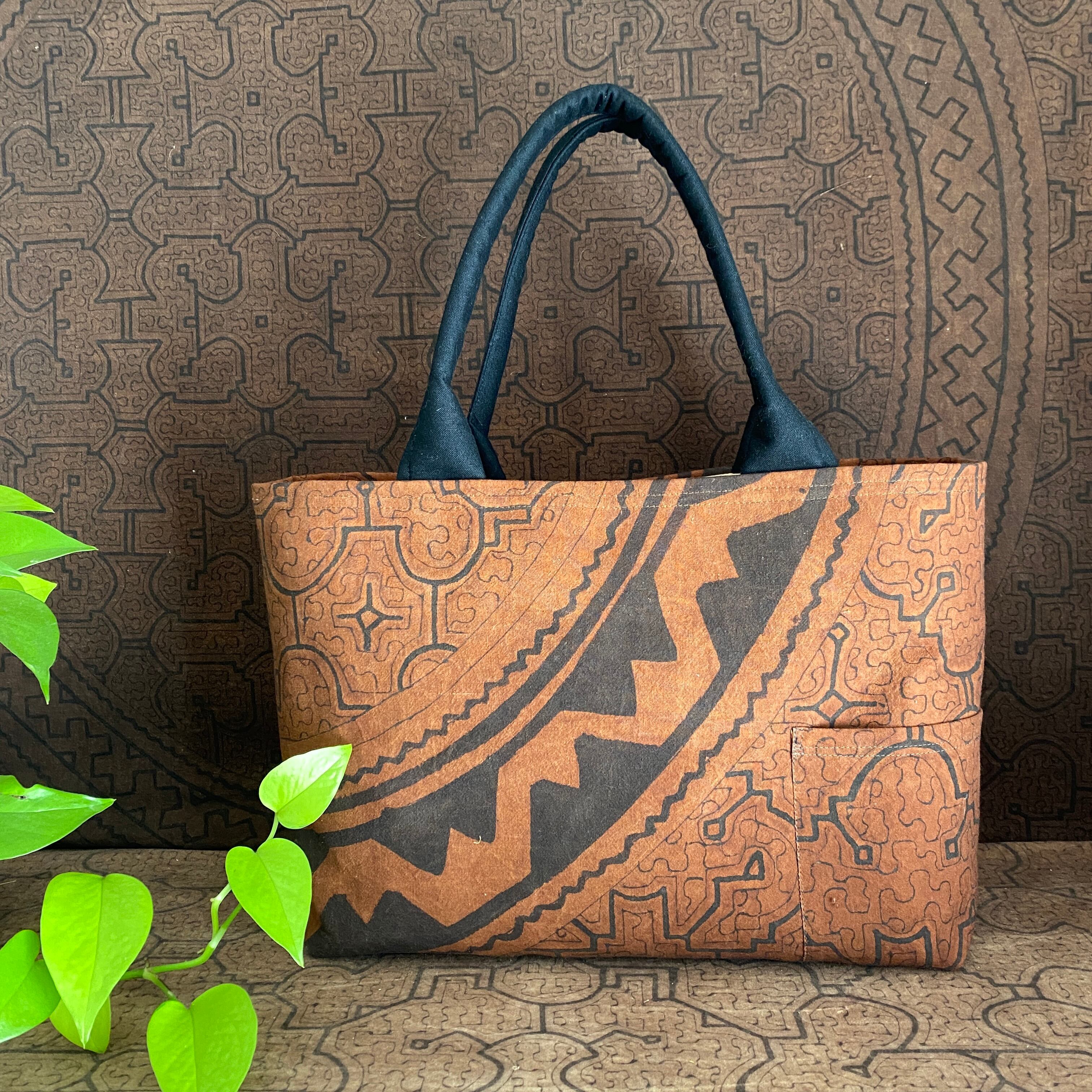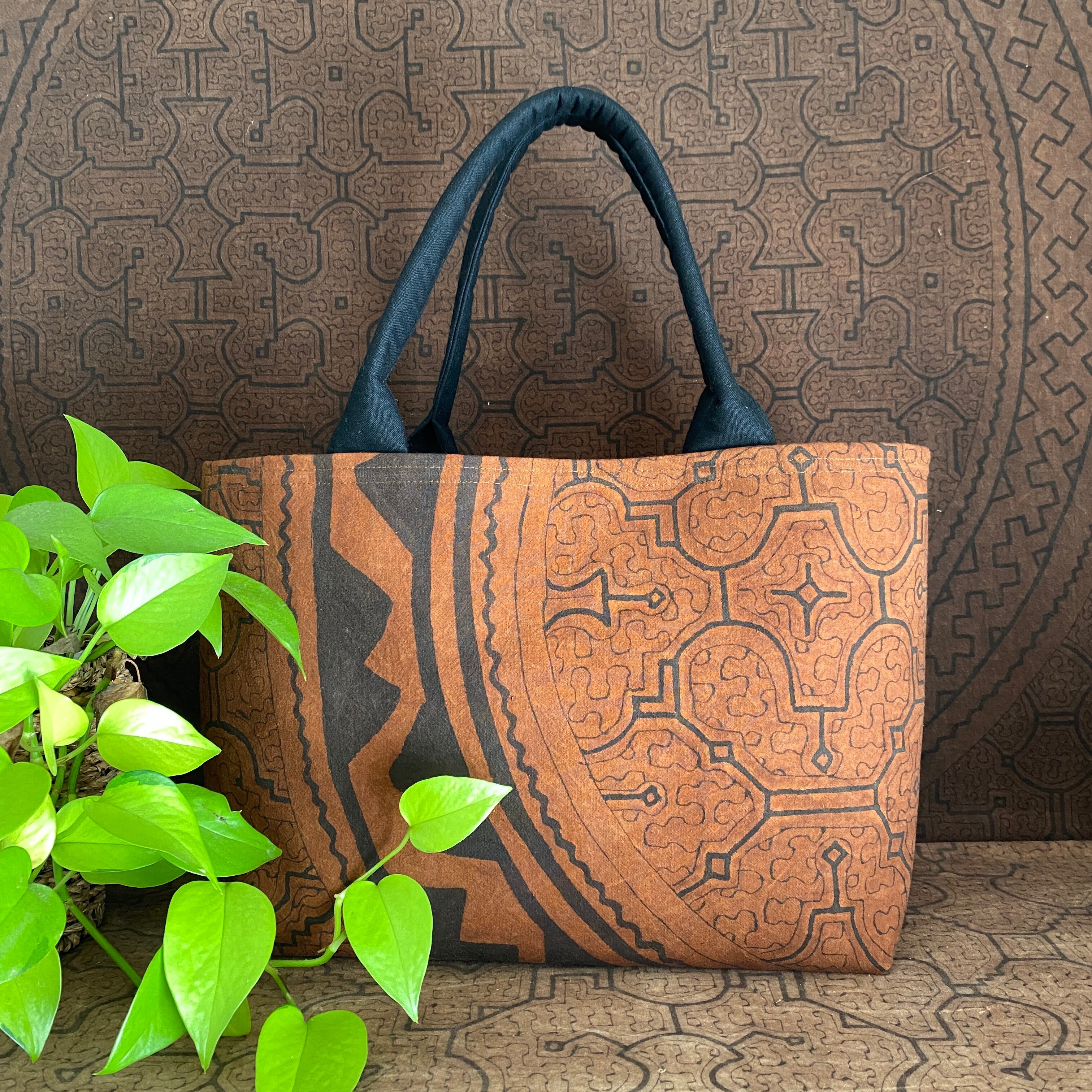 泥染めバッグ大 茶大型巾着フタ付きバッグ 口幅50x27x14cm シピボ族の泥染め
