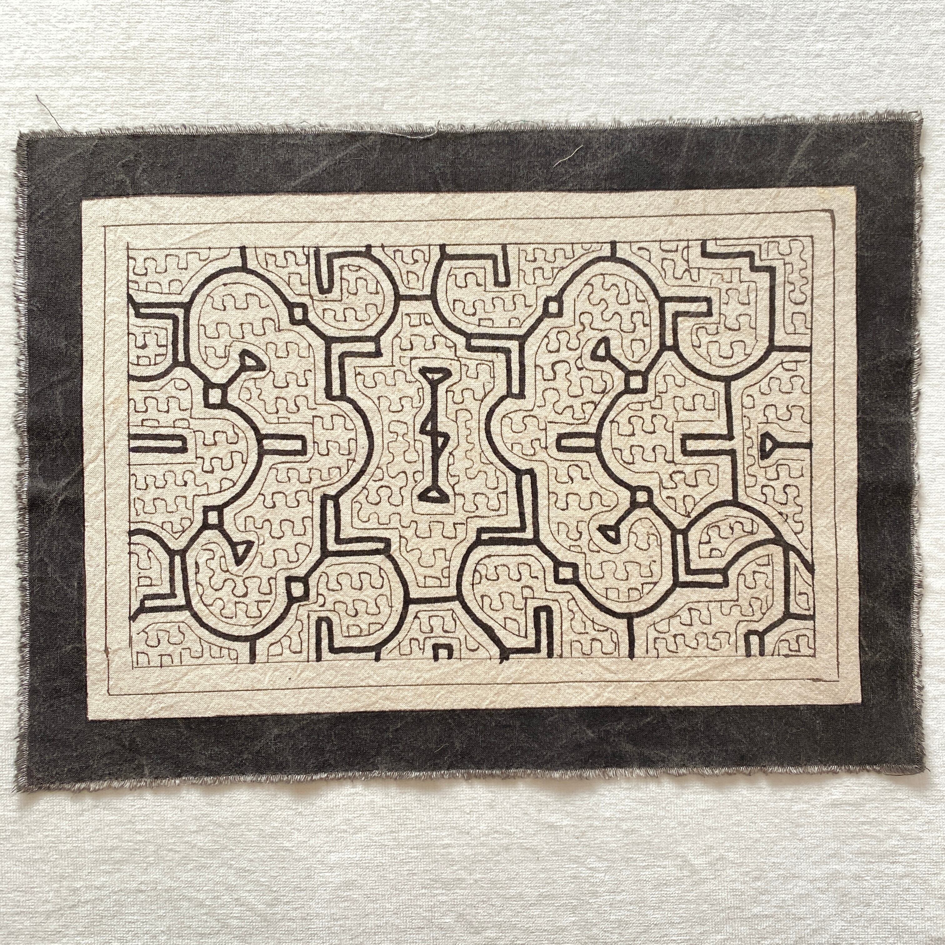シピボ族の女性がフリーハンドで描く模様の、細かい線までが漆黒に染まるのは、アマゾンの森の樹皮染液のタンニン色素の濃厚さと、秘密の大地に眠る「神聖な泥」の豊富な鉄分によるもので、深みのある黒を生み出します。
