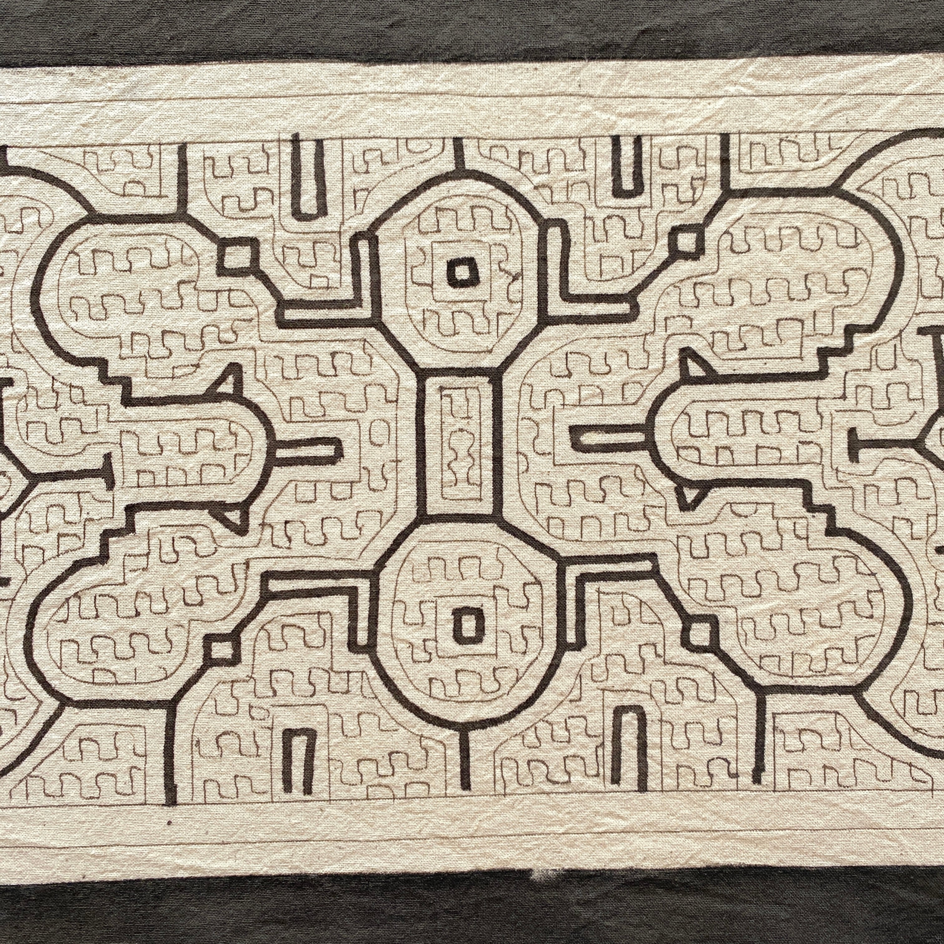 シピボ族の女性がフリーハンドで描く模様の、細かい線までが漆黒に染まるのは、アマゾンの森の樹皮染液のタンニン色素の濃厚さと、秘密の大地に眠る「神聖な泥」の豊富な鉄分によるもので、深みのある黒を生み出します。