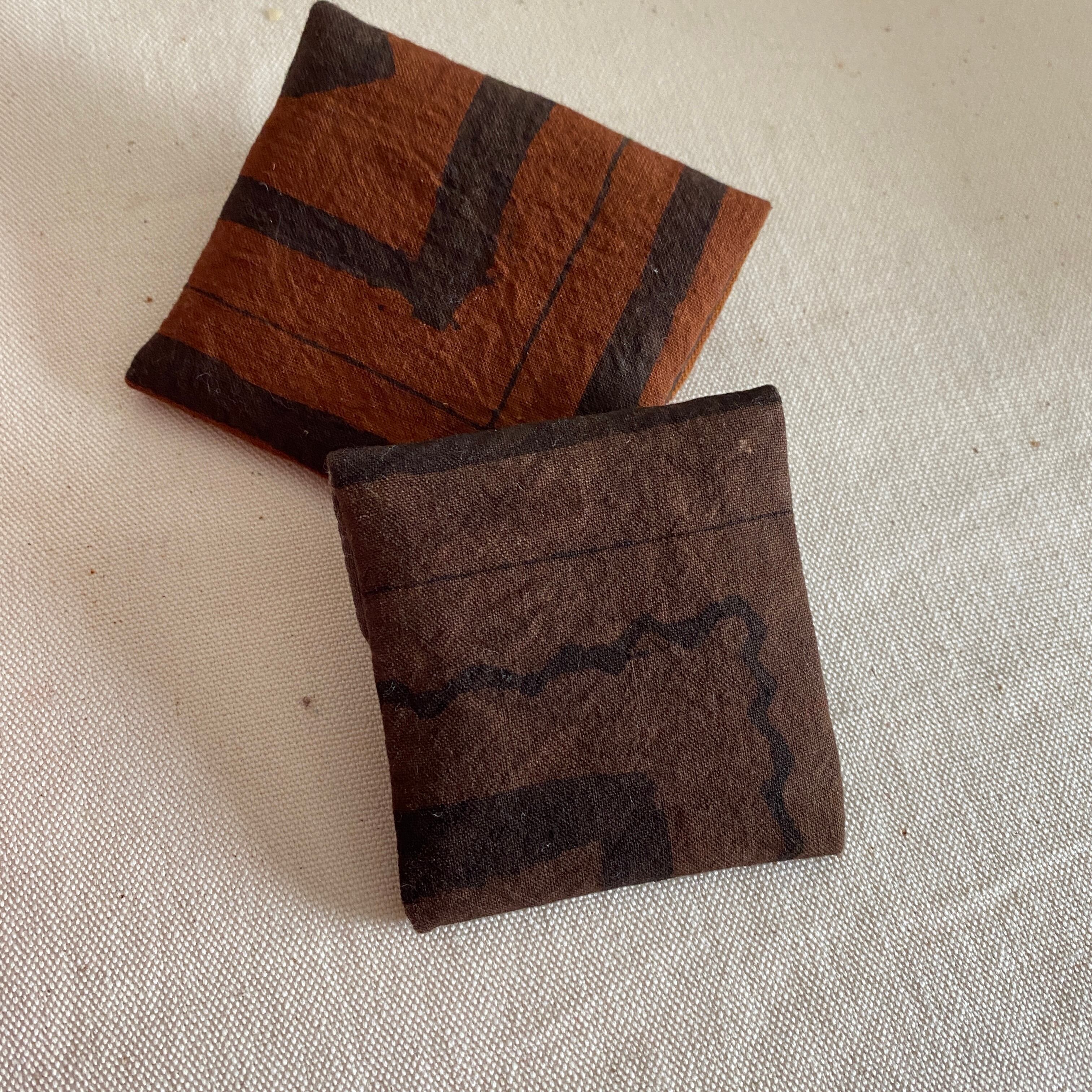 どちらもマホガニーなどの樹皮を煮出した茶の染料の「タンニン」と、奥地で採取する特別な泥に含まれる「鉄分」の化合を利用して幾何学模様のデザインの部分だけが黒く染めるのが特徴です。