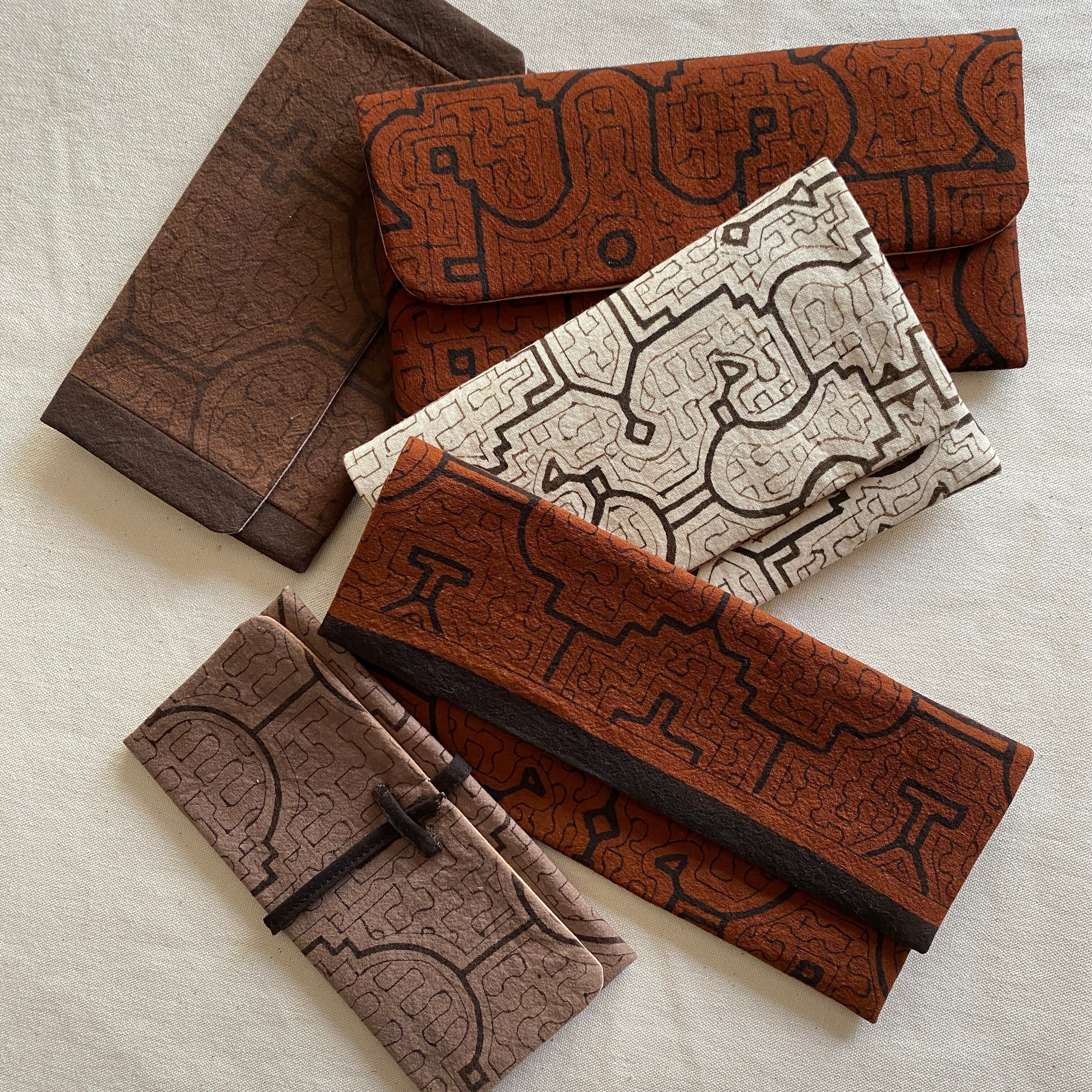 どちらもマホガニーなどの樹皮を煮出した茶の染料の「タンニン」と、奥地で採取する特別な泥に含まれる「鉄分」の化合を利用して幾何学模様のデザインの部分だけが黒く染めるのが特徴です。