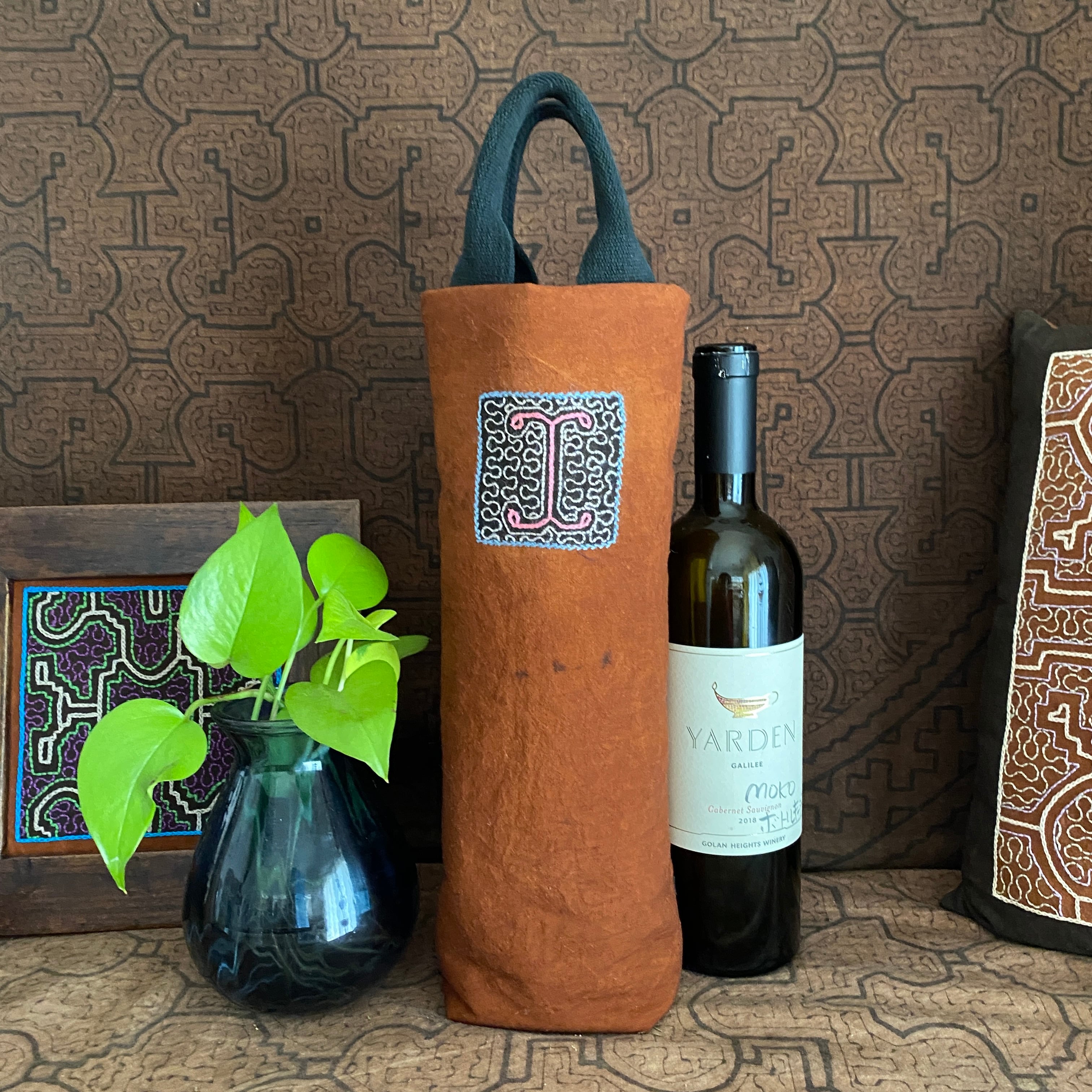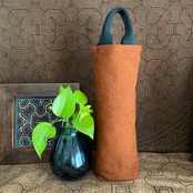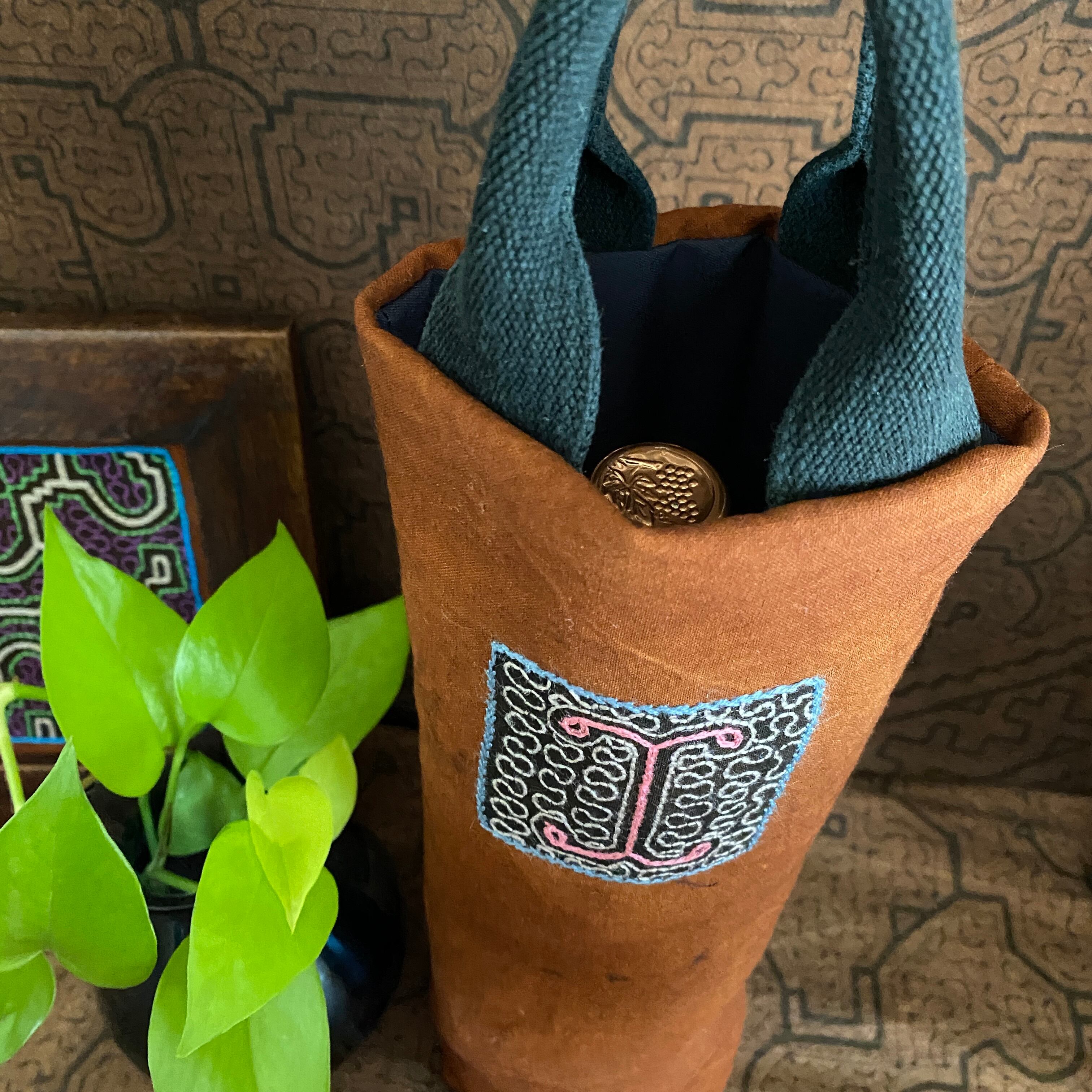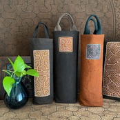 樹皮の染料による茶染めに、ワンポイントの小さな窓を泥染めで黒く染めた部分に刺繍をした素材をワインバッグに活かしてみました。