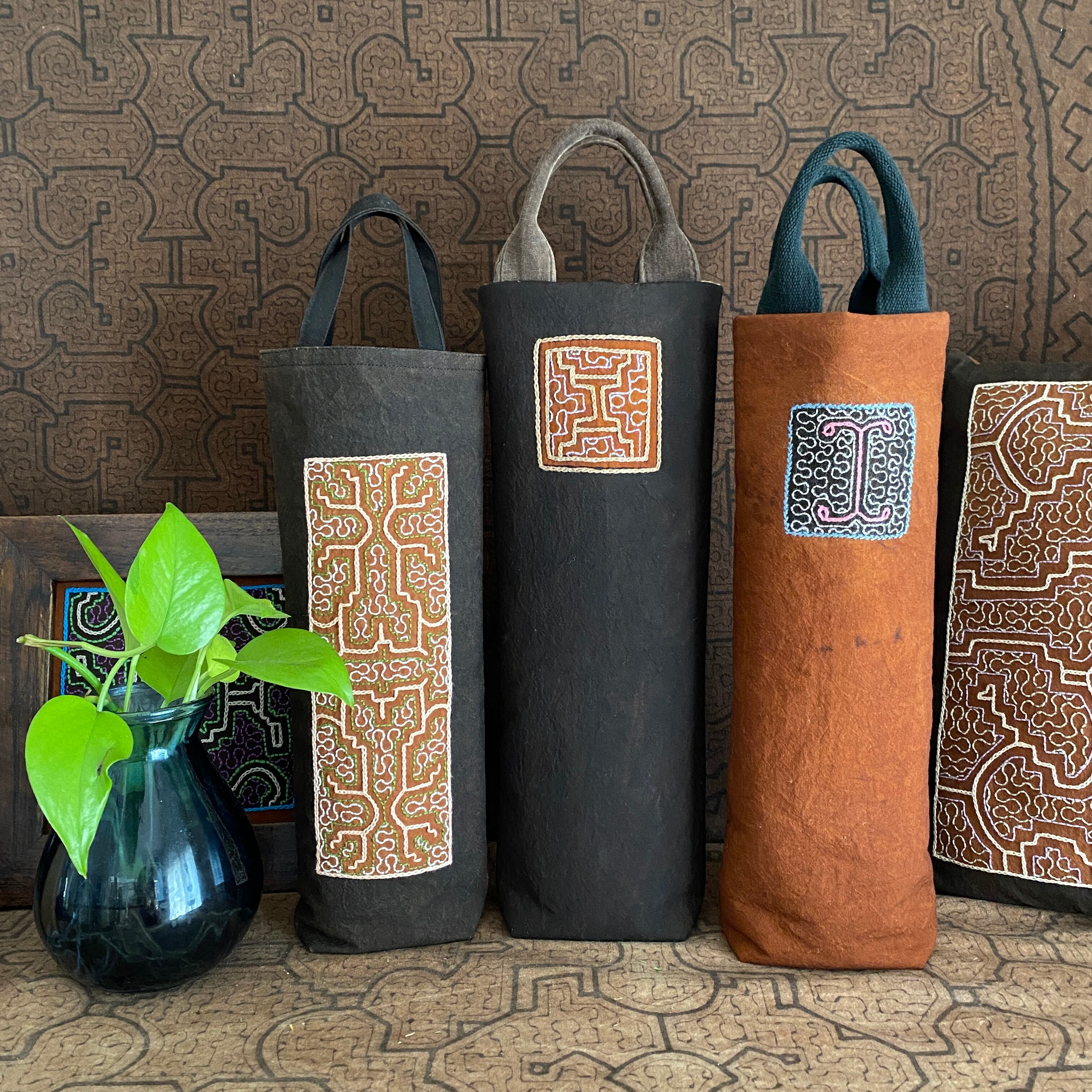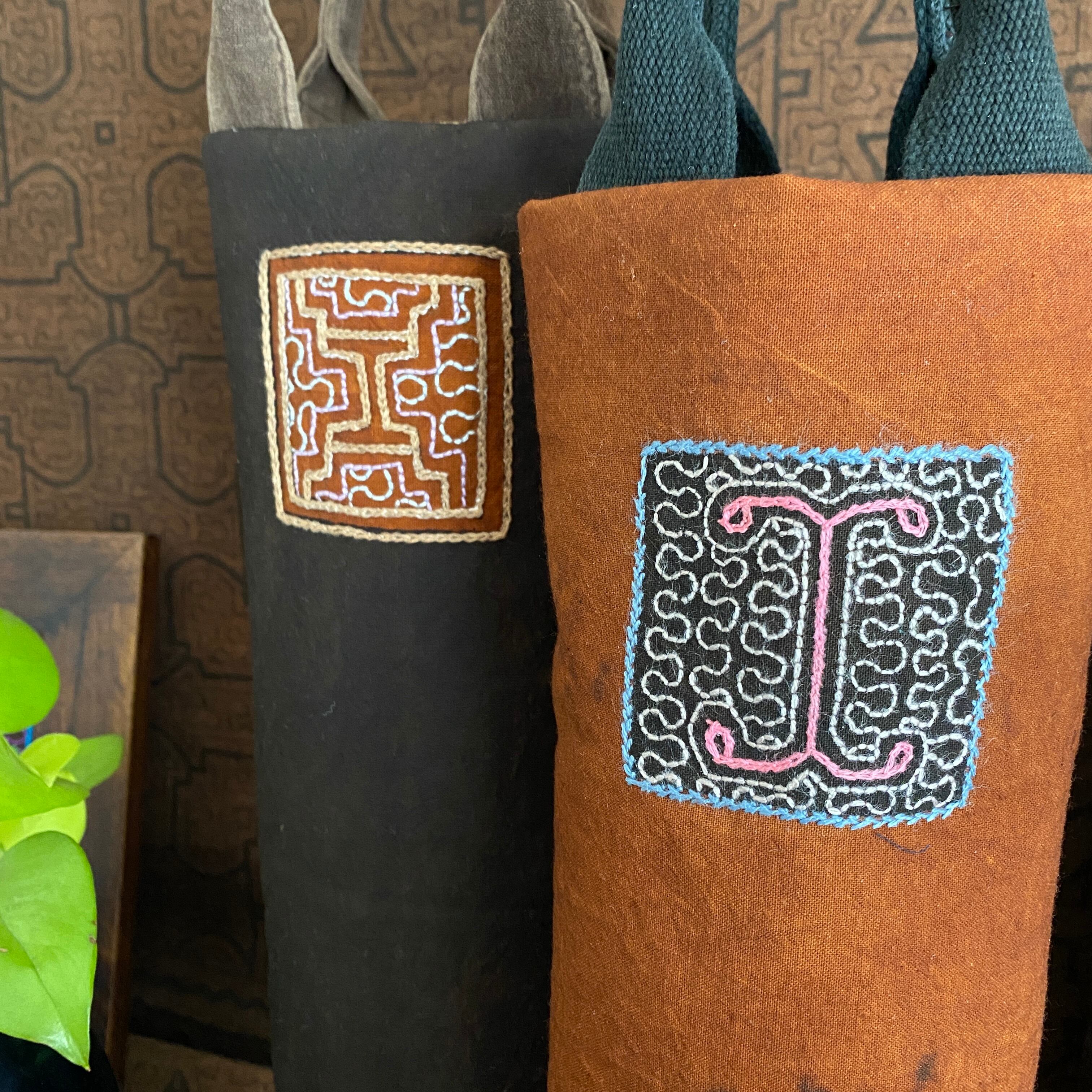 ワインバッグ2 シピボ茶地ピンク刺繍 シピボ族の泥染めとワンポイント刺繍 キルト綿入りのしっかりめバッグ ワインボトルケース インテリア雑貨 シピボ shipibo | アマゾン屋 シピボ族の泥染めとバッグと雑貨