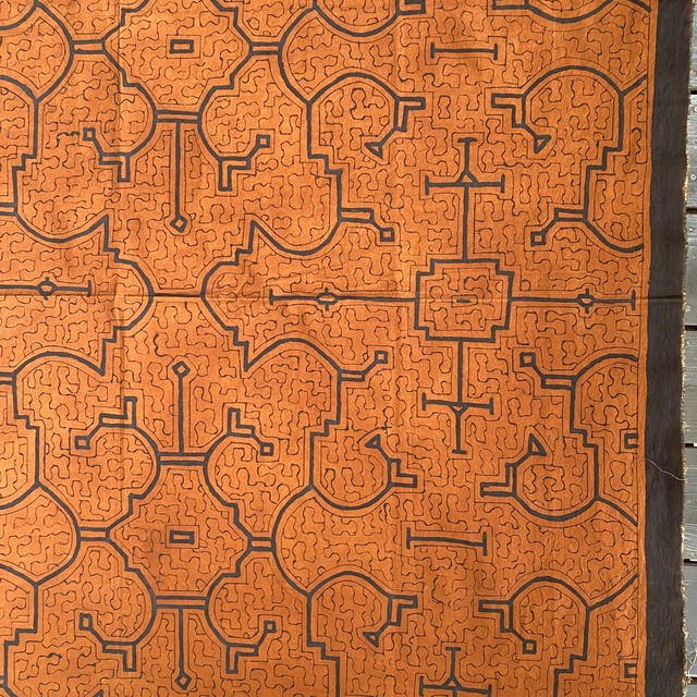 茶色と白地の二種類あり、どちらも「タンニン」を含む樹皮を煮出した染料と、森の奥地から採取する「鉄分」の強い特別な泥の化合を利用した染色方法で、フリーハンドで描かれる幾何学模様のデザインの部分だけが黒く染まることが特徴です。