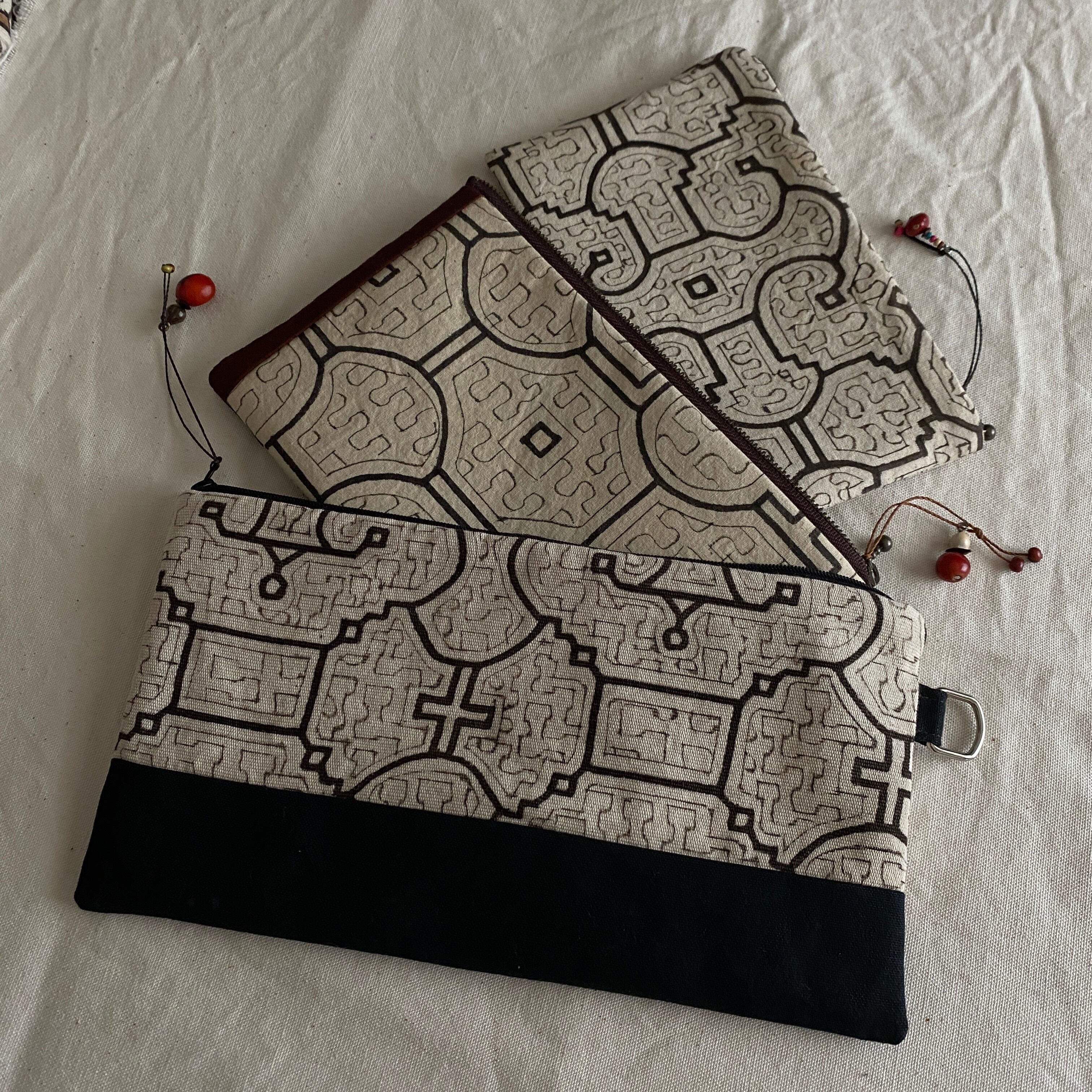 ポーチ 帆布黒底細長ファスナー27cm シピボ族の泥染め