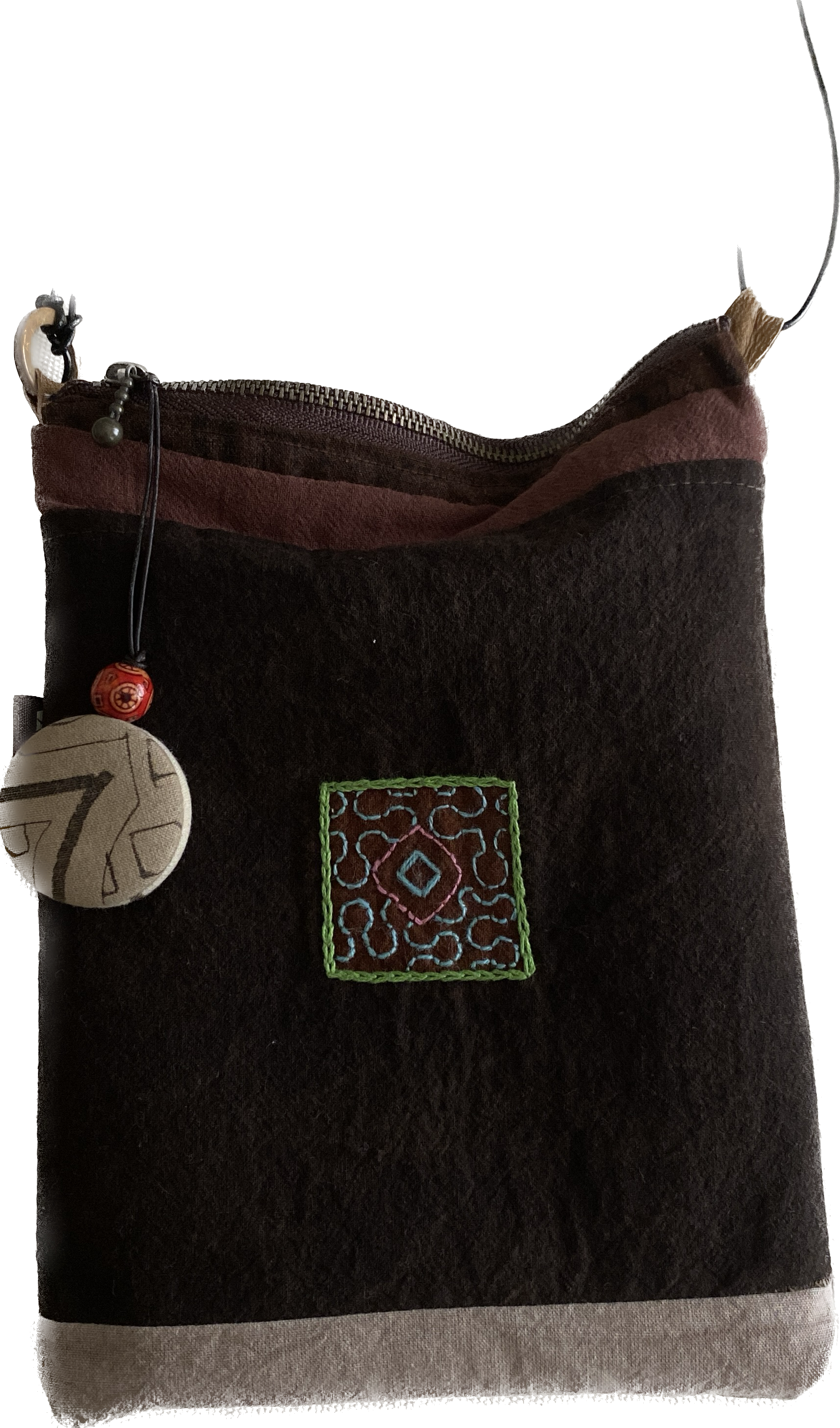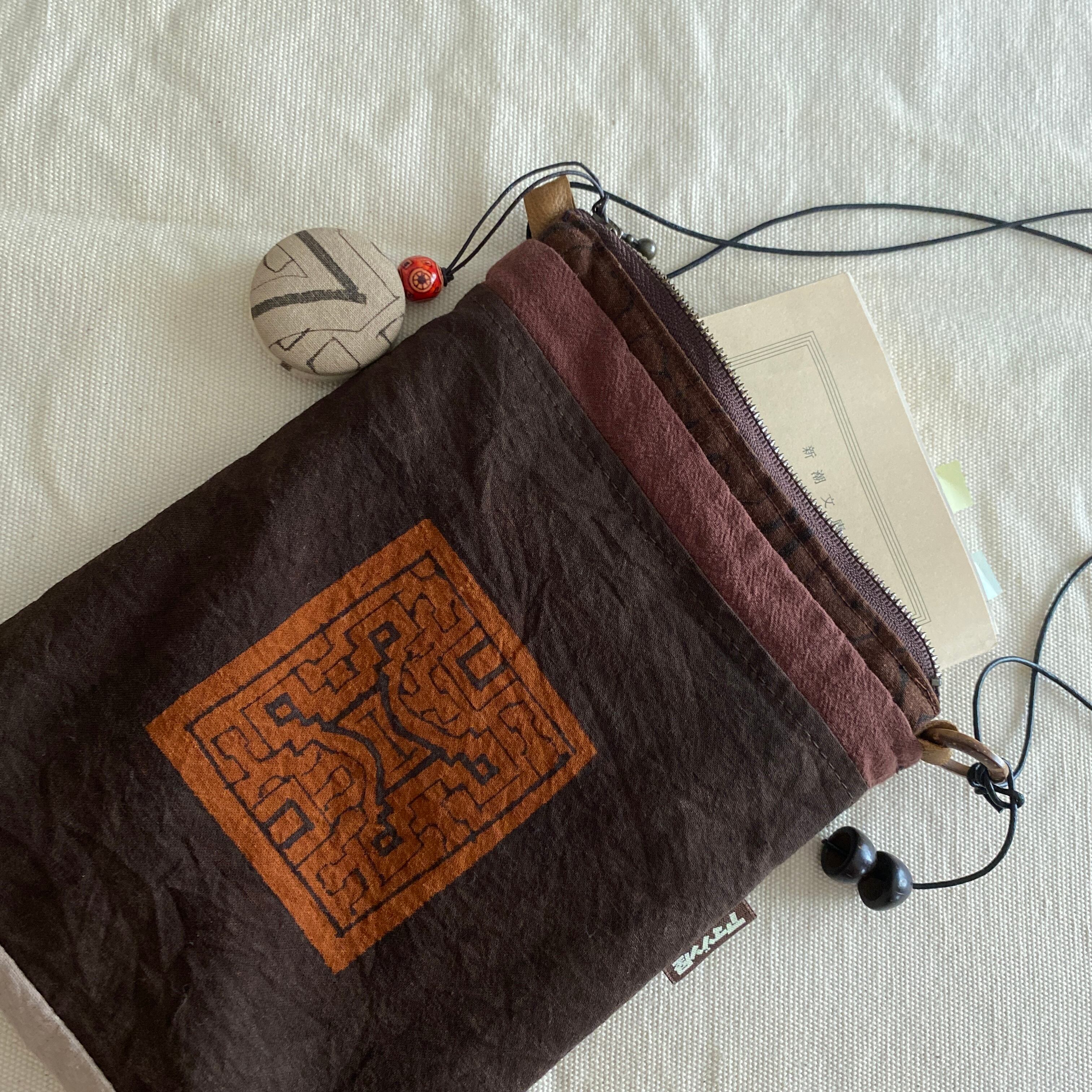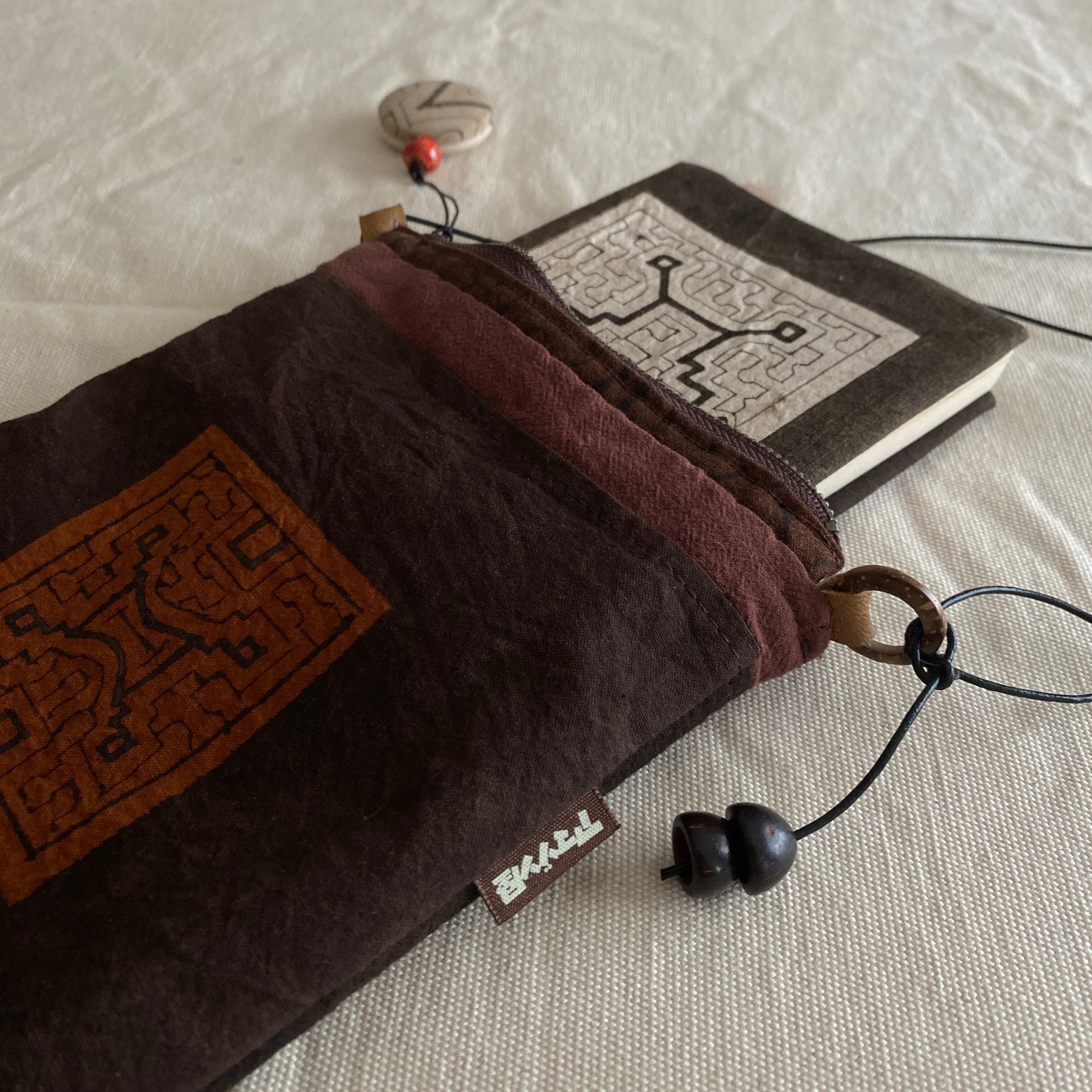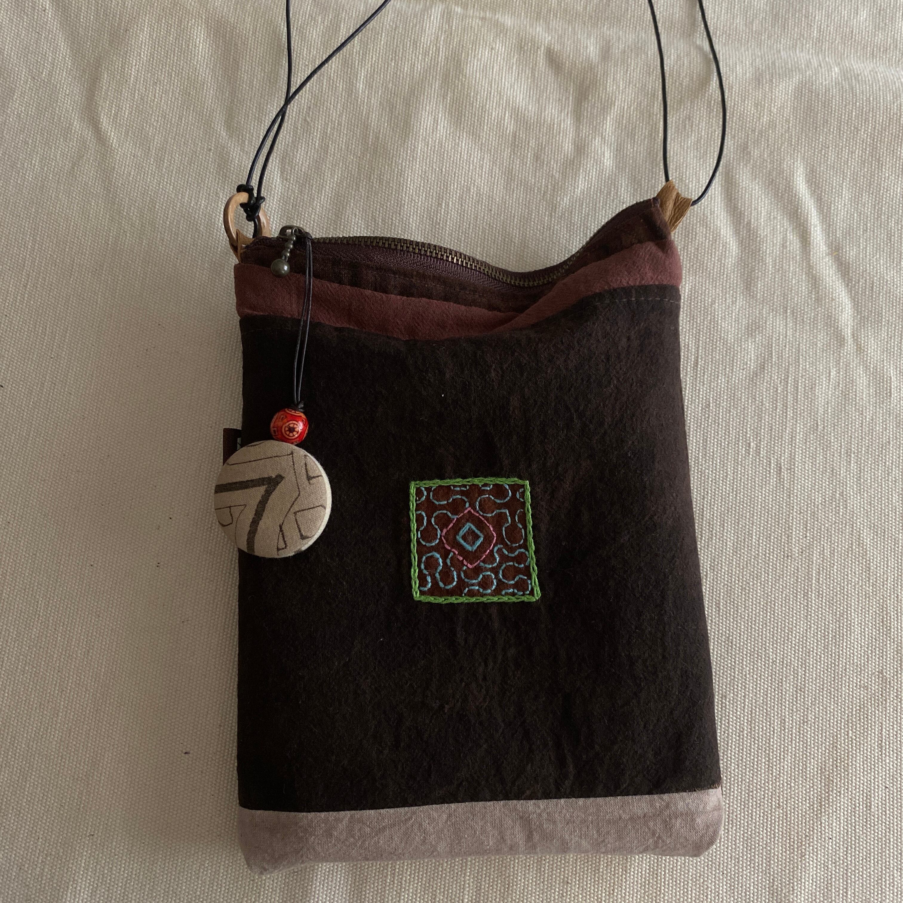 ポシェット56 泥染め茶ワンポ刺繍 ファスナー付き 16.5x23cm位