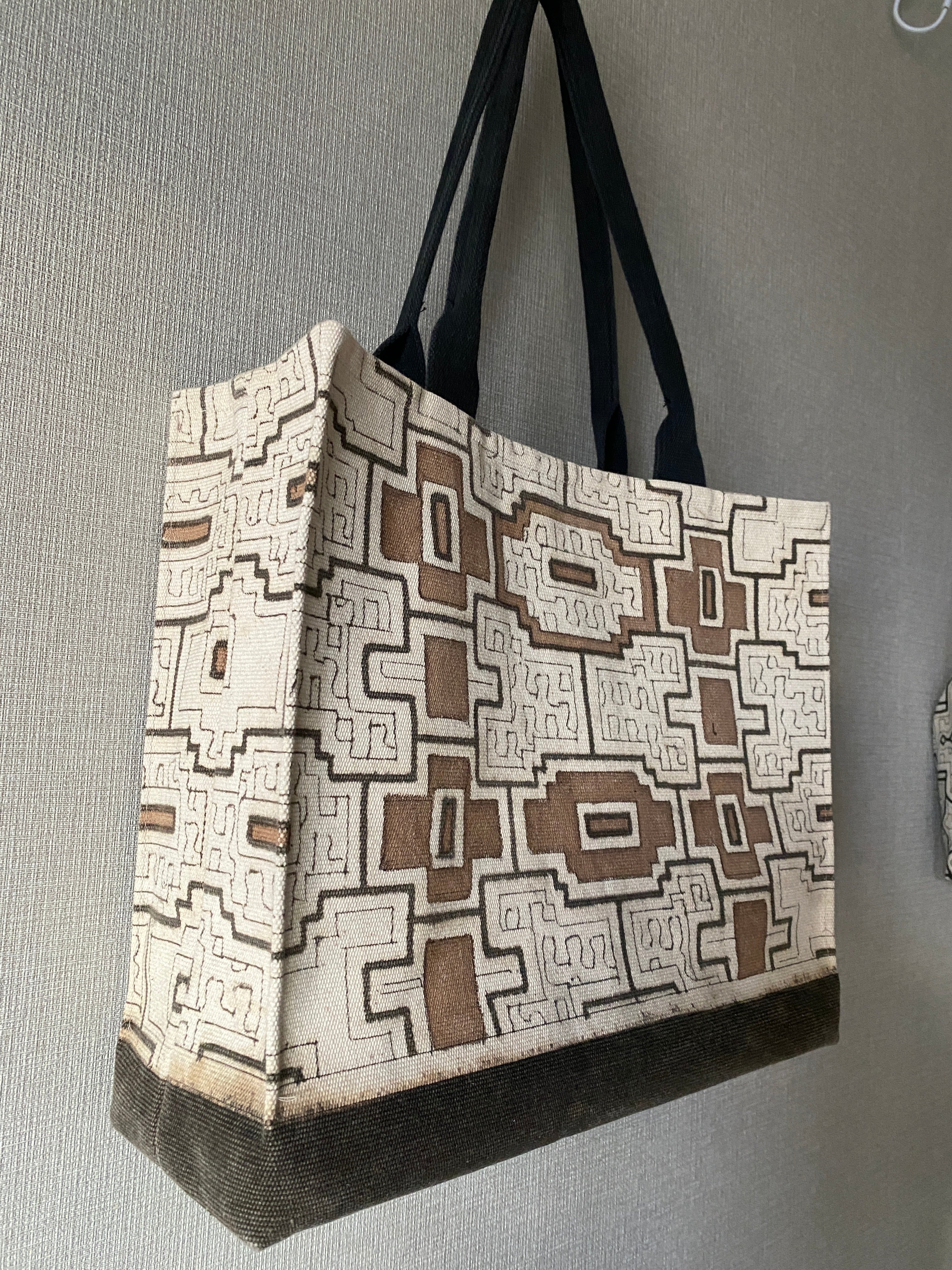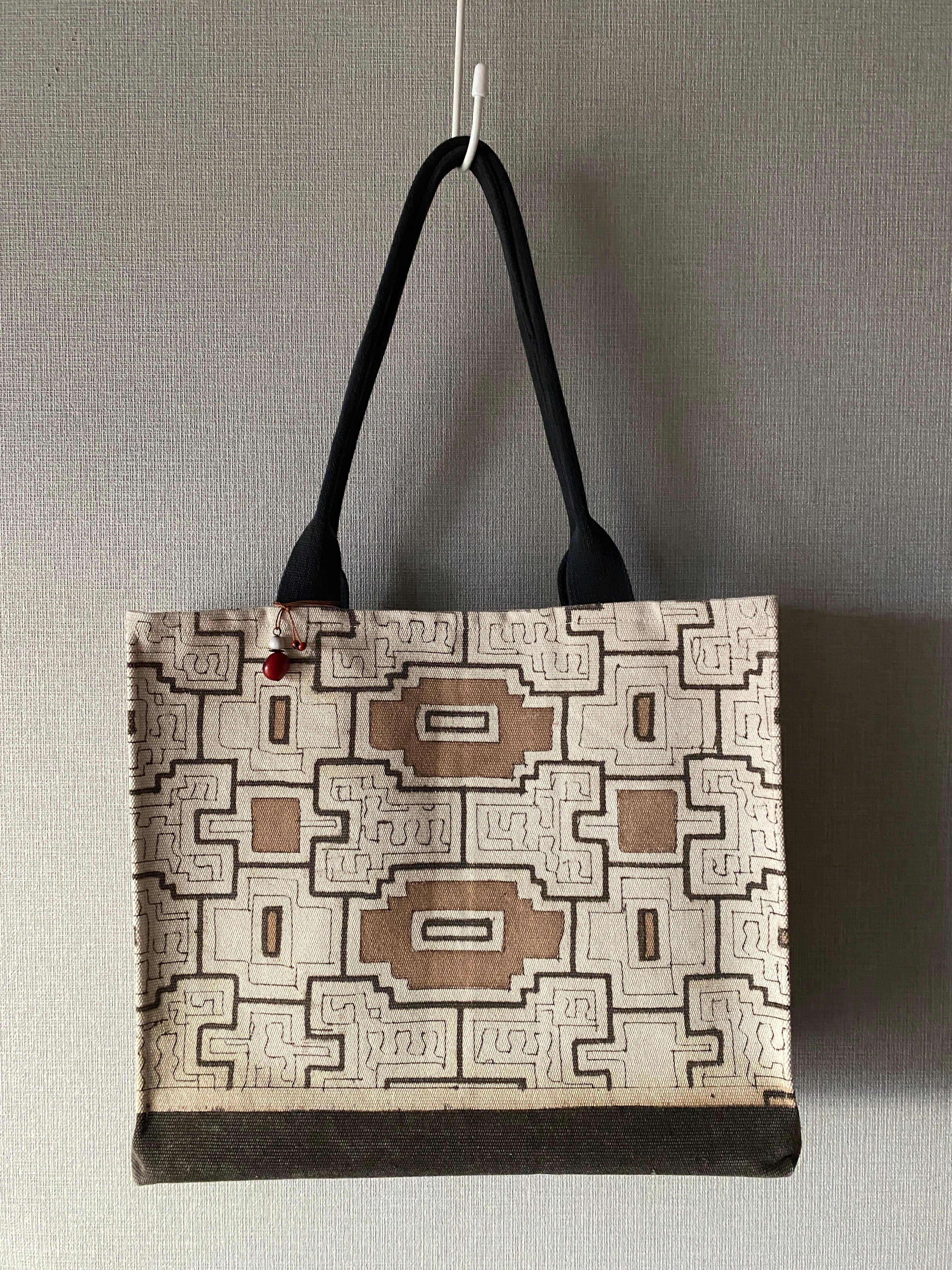 今は手に入らぬ最も分厚いペルー製の木綿100%帆布でズッシリ感があります。20年以上前に模様を染めた素材で、一枚布の半分折りで縫製してますが、底になる部分を黒く泥染めして両側に模様が収まるようにデザインされています。素材自体が希少価値が高く、模様も全てに細かい模様を入れずに途中図になっていることと、それをさらに茶色の自然染料で茶色にところどころ塗ってアクセントを付け、貴重なオリジナルバッグになっています。