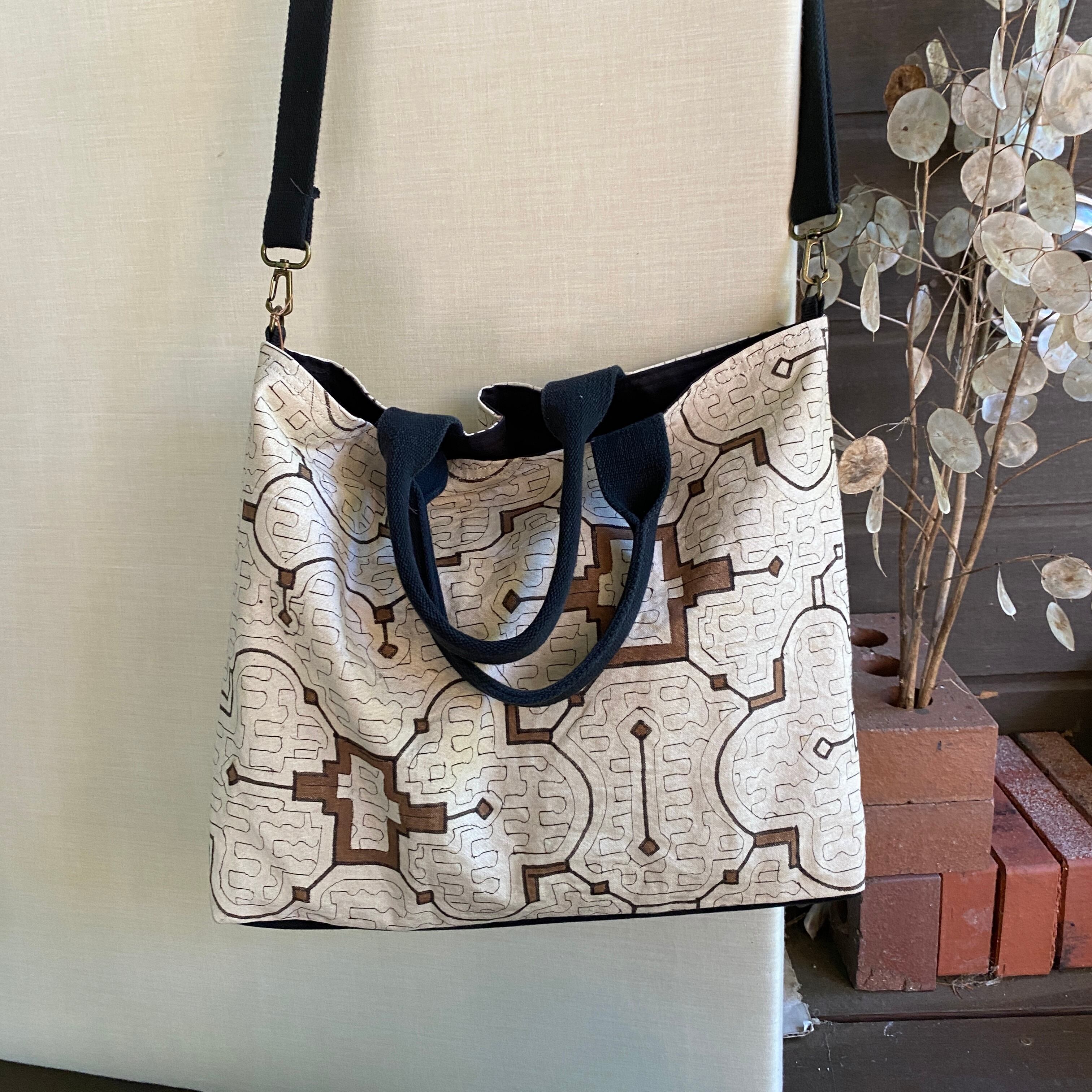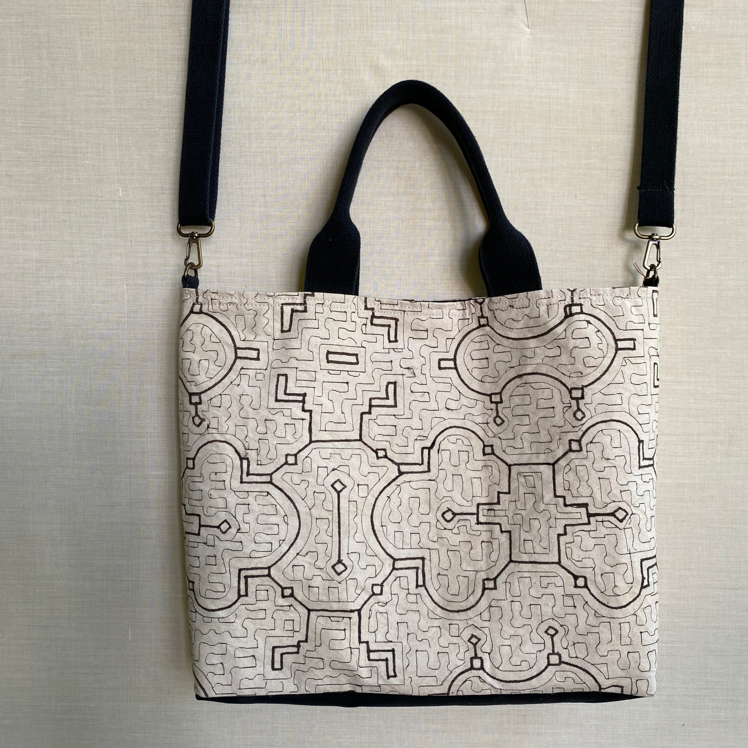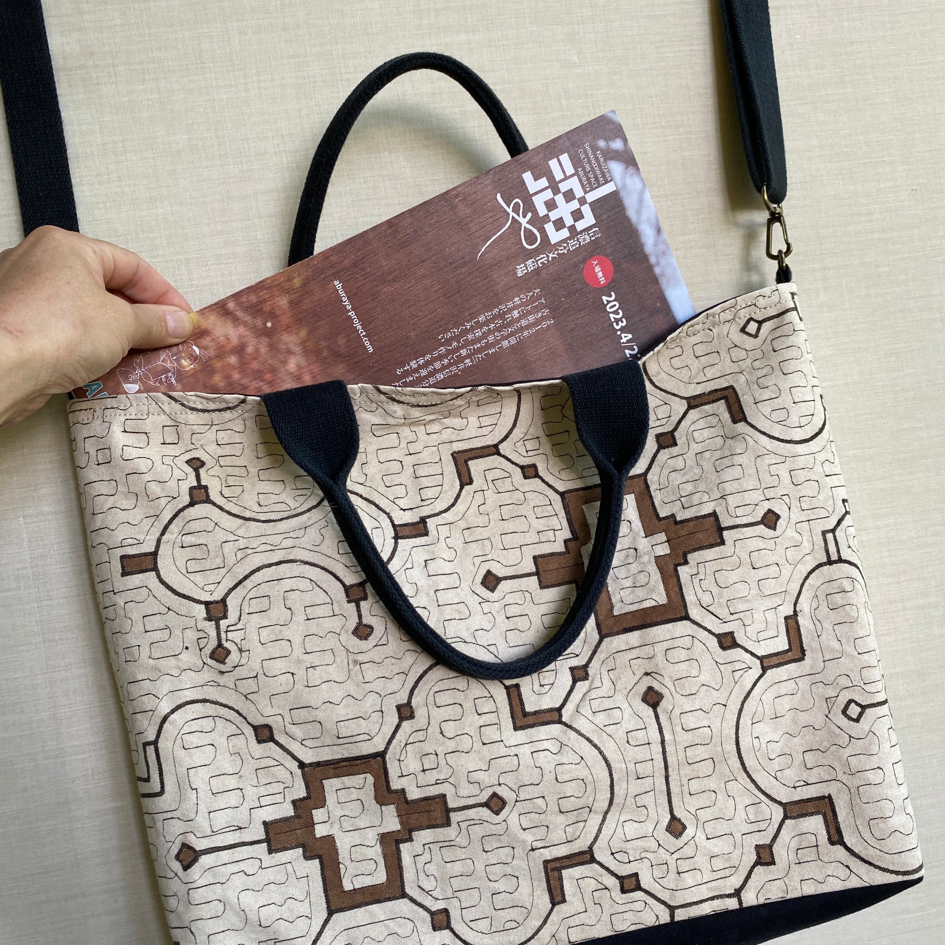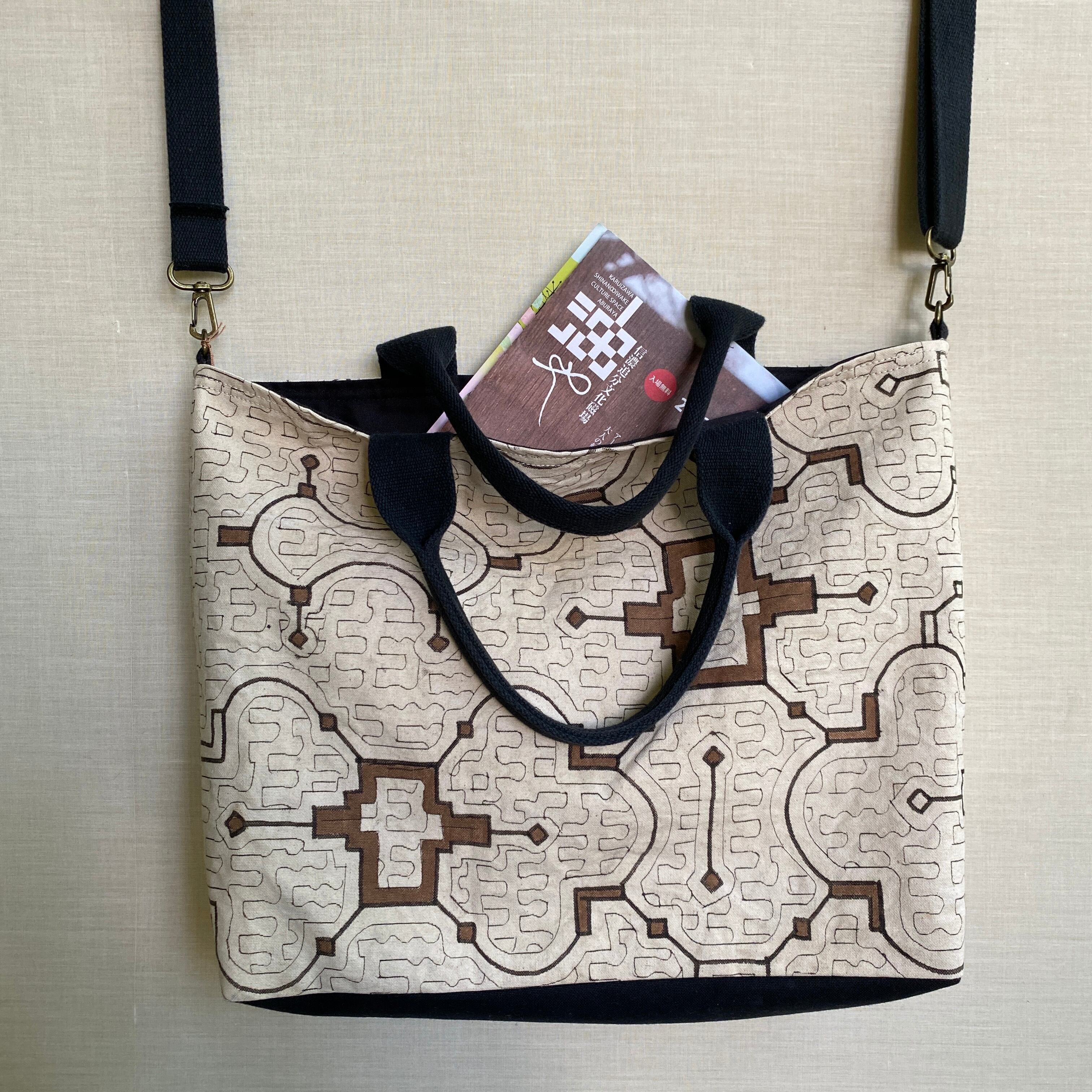 帆布泥染めトートショルダー中型 40x28x8cm シピボ族の泥染め 長さ調整ショルダー取り外し 軽いバッグ