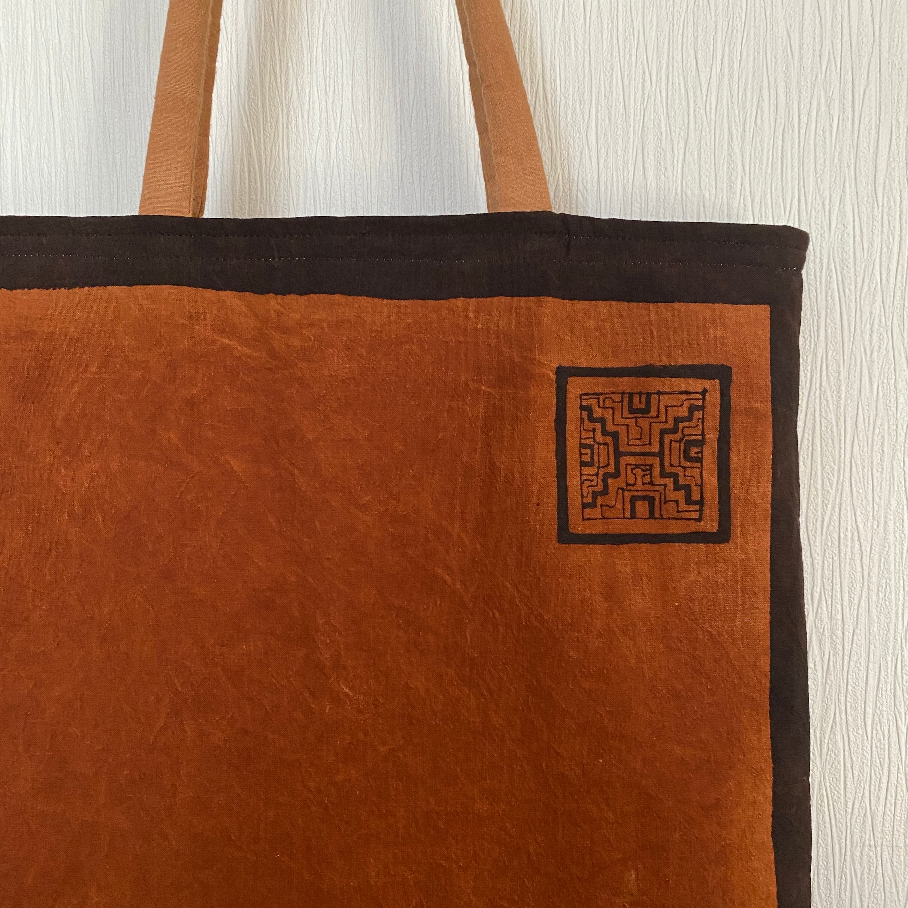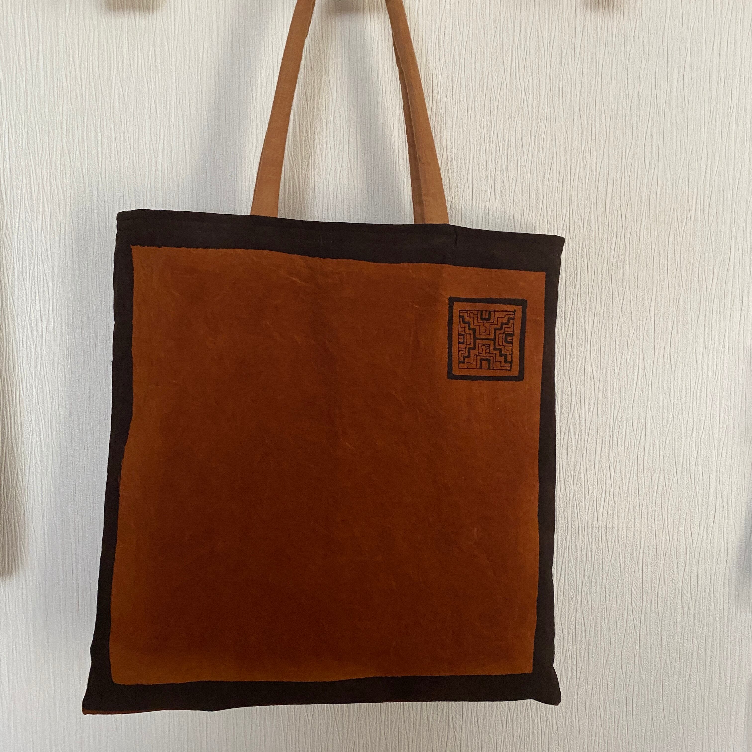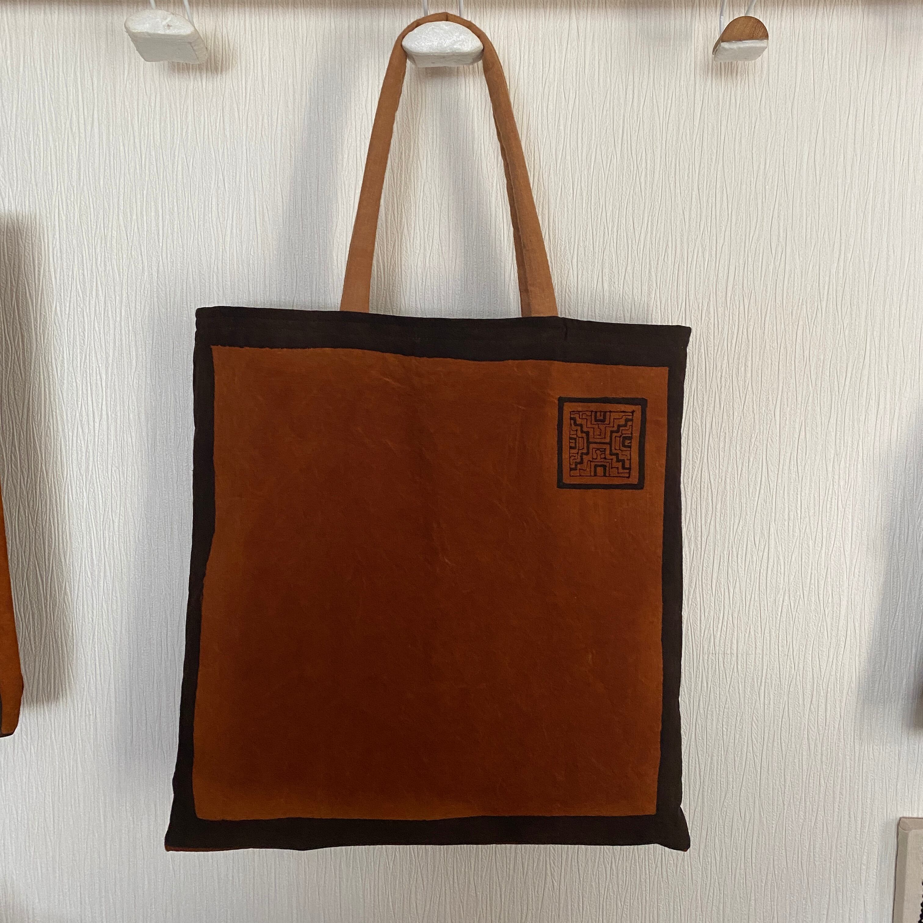 A3バッグ 泥染めワンポ刺繍の柔らかいバッグ 37x40cm 正方形 シピボ族の泥染め 南米ペルーアマゾン