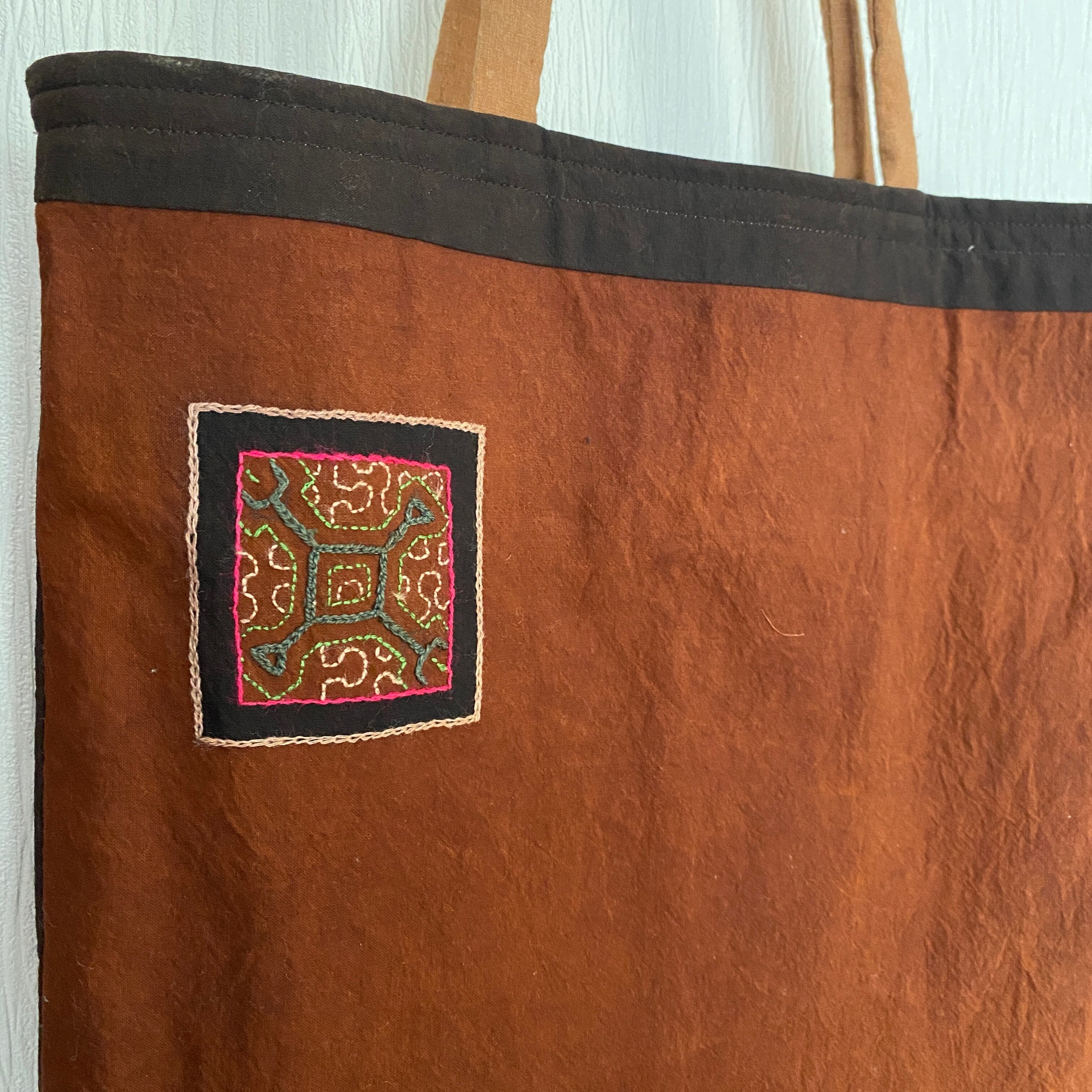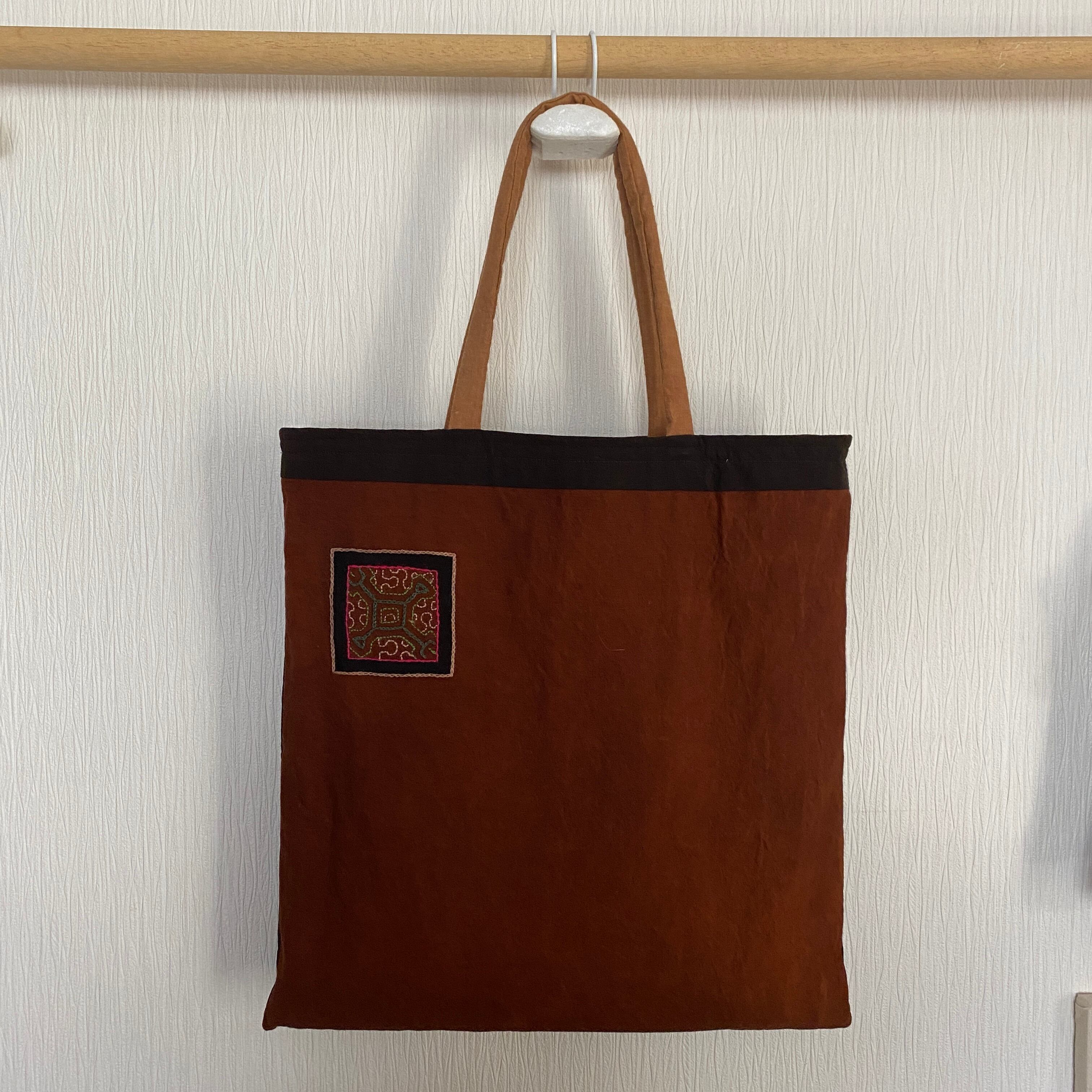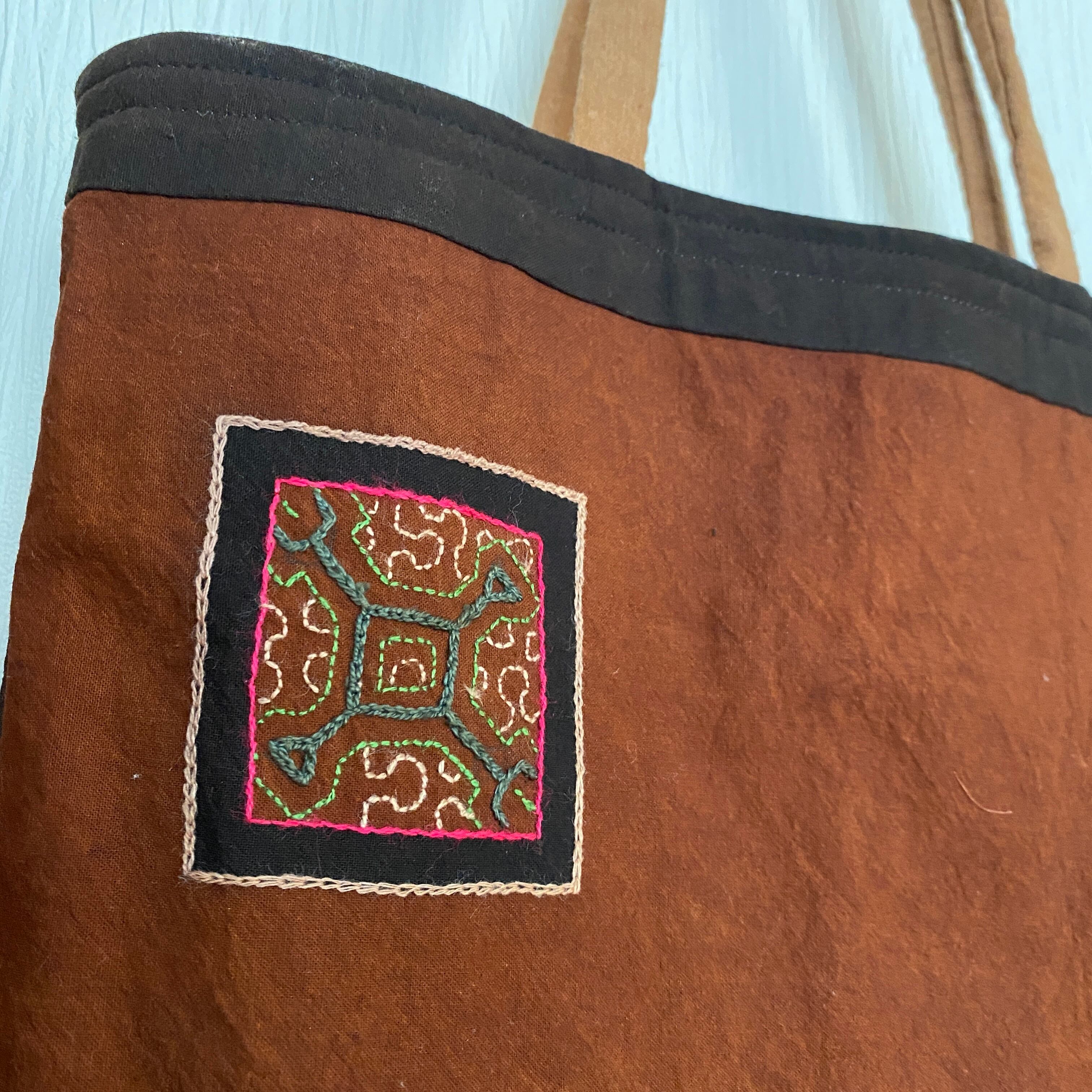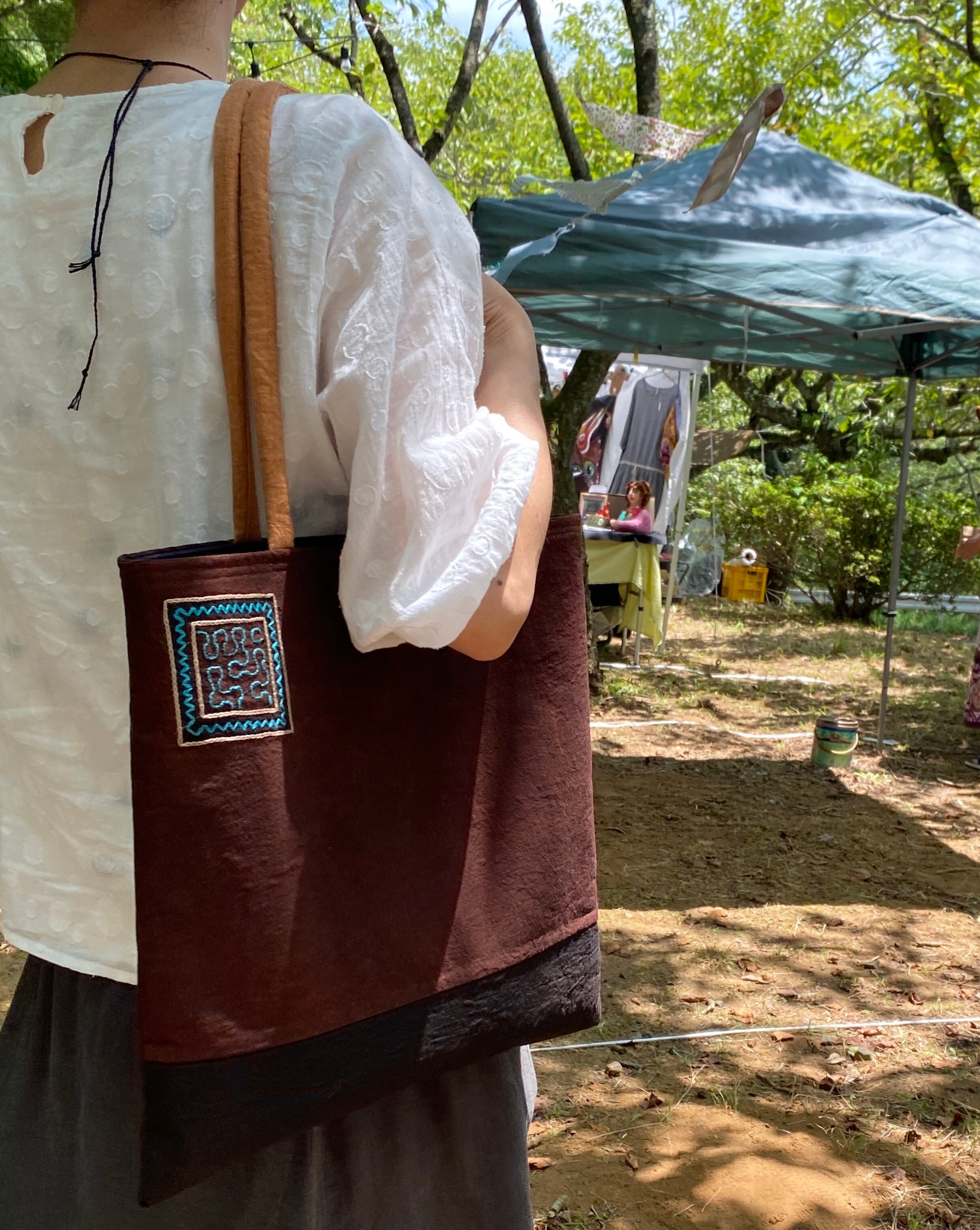 A3バッグ 泥染めワンポ刺繍の柔らかいバッグ 37x40cm 正方形 シピボ族の泥染め 南米ペルーアマゾン
