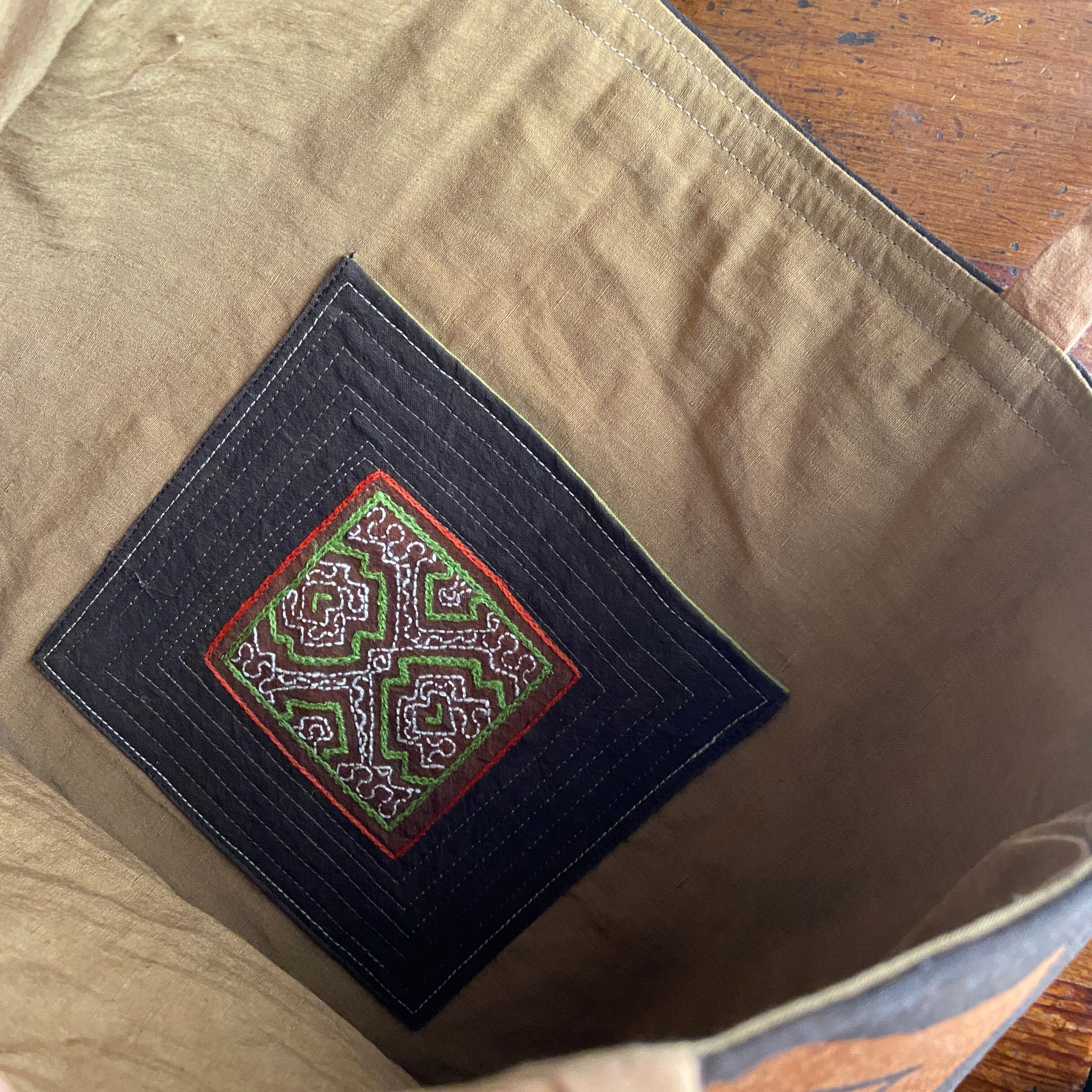 両面にとっておきの素材、内布に黄土色の麻布、内側のポケットの隠れたところに、実は刺繍コースターサイズを付けています。