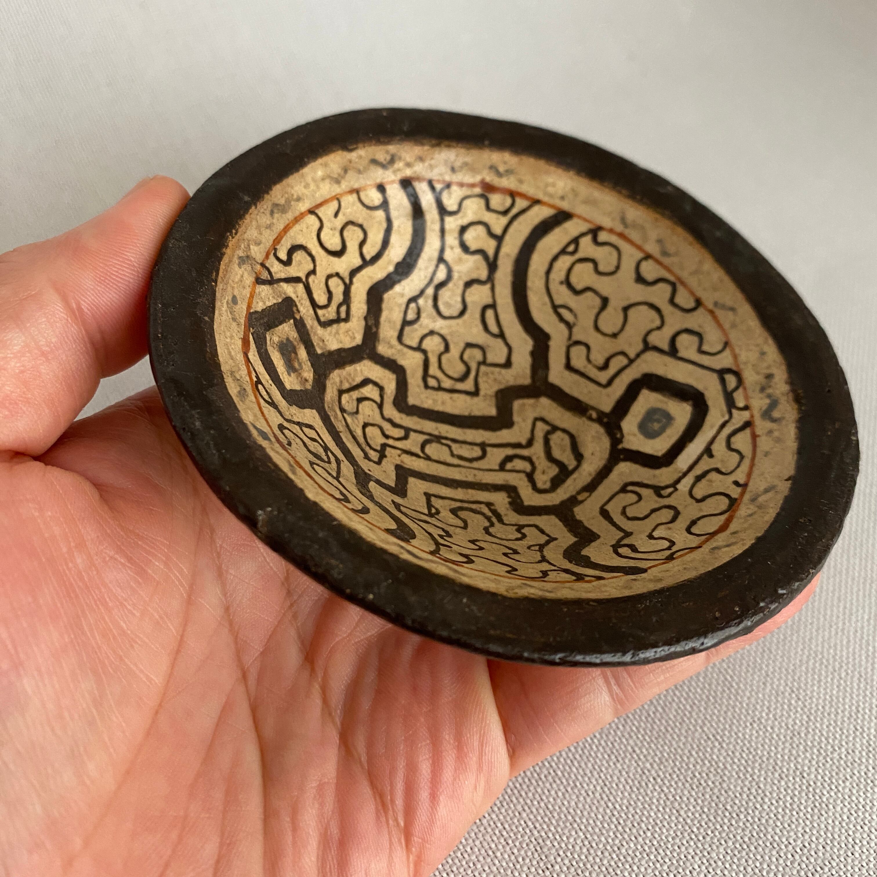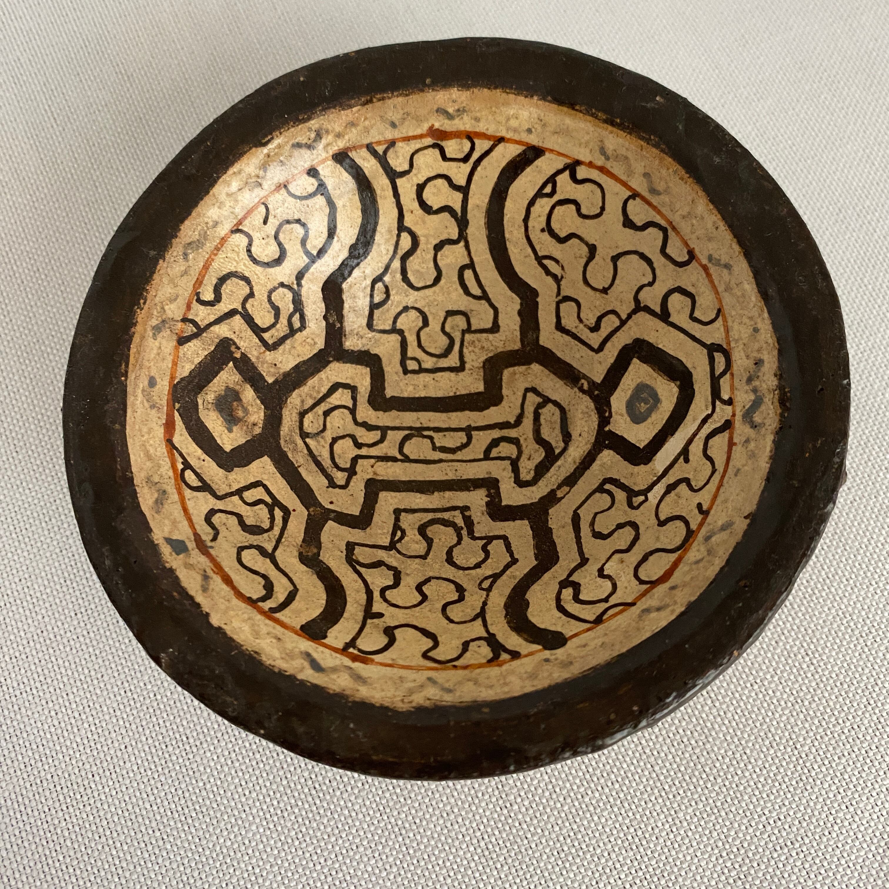 アマゾンの泥染めは、先住民族シピボ族の伝統工芸で、フリーハンドの幾何学模様を染める、希少価値の高い手工芸です。この布を使ってオーナー(AYACHI S)がバッグや布雑貨を手作りしています。 貴重な伝統工芸を少しでも長く作り続けて欲しいという想いから続けている活動です。