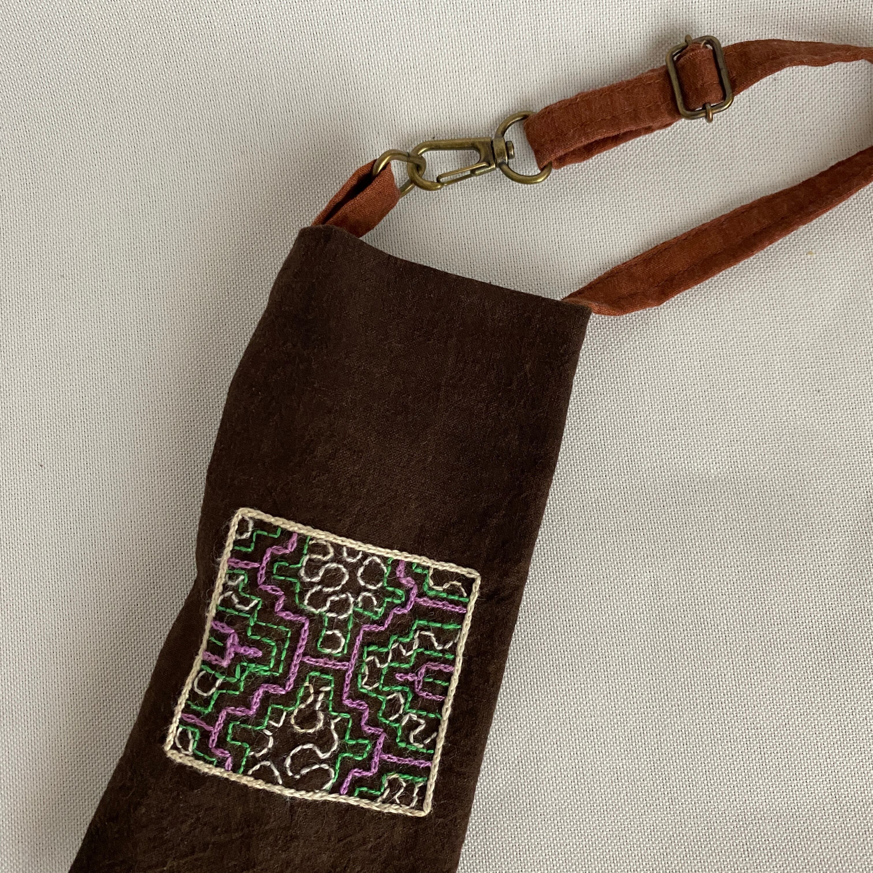 シピボ族による泥染めに小型の手刺繍を施した一枚布を細長の袋状にしました。