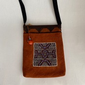 コースターサイズに特注した、シピボ族の泥染め刺繍の小型布をポケットにしたポシェットシリーズ、裏側はシピボ模様の茶布を使ったファスナー付き縦長のポシェットです。