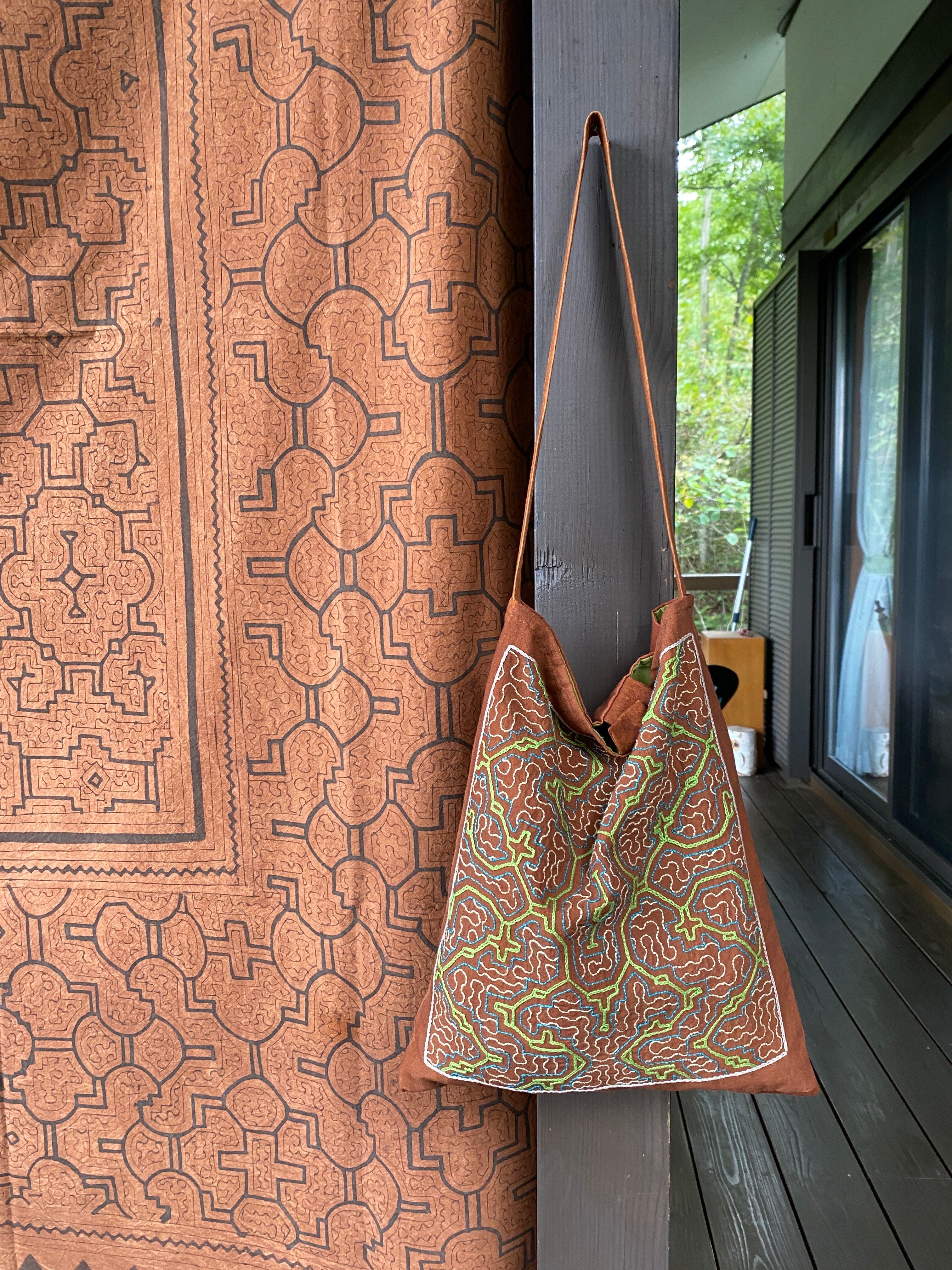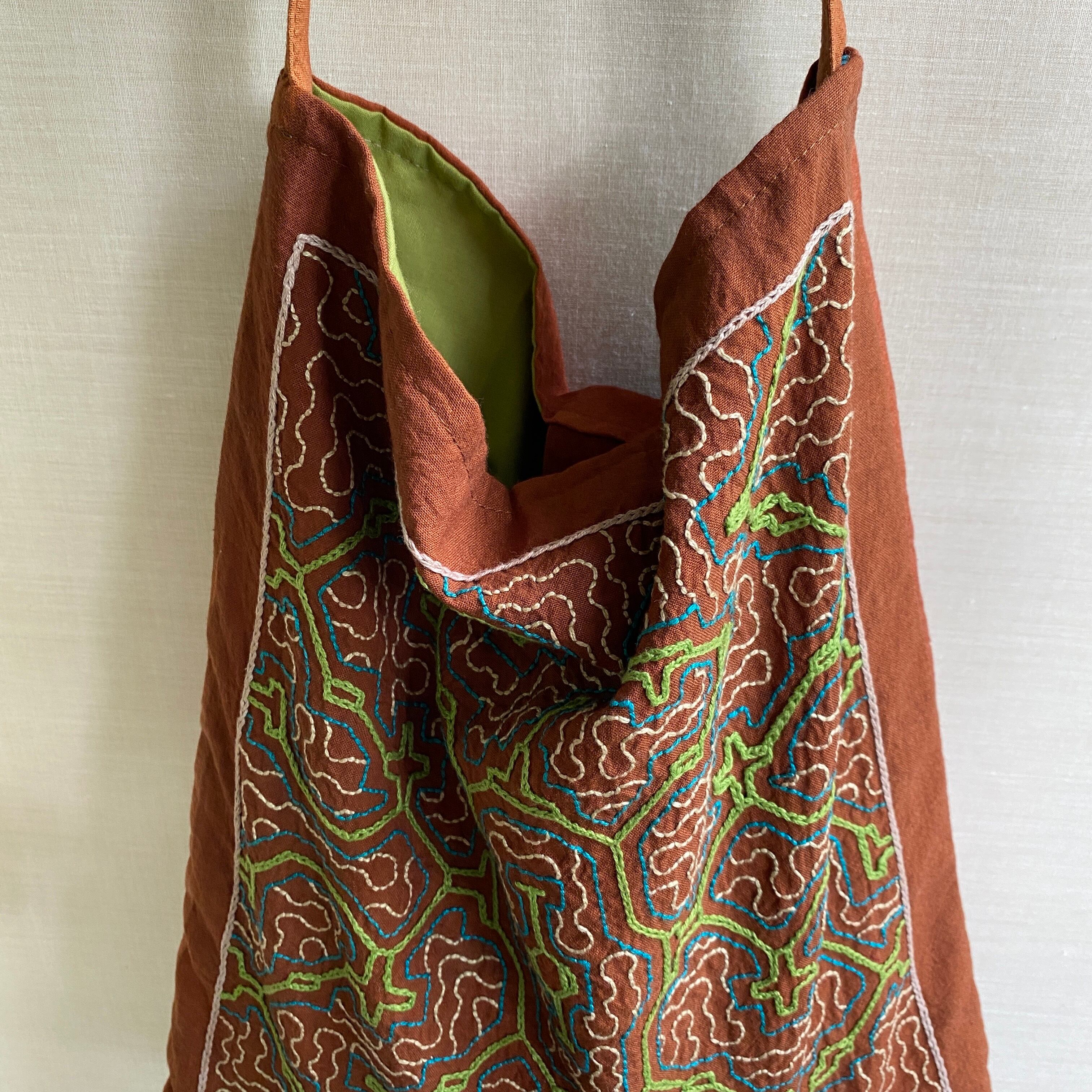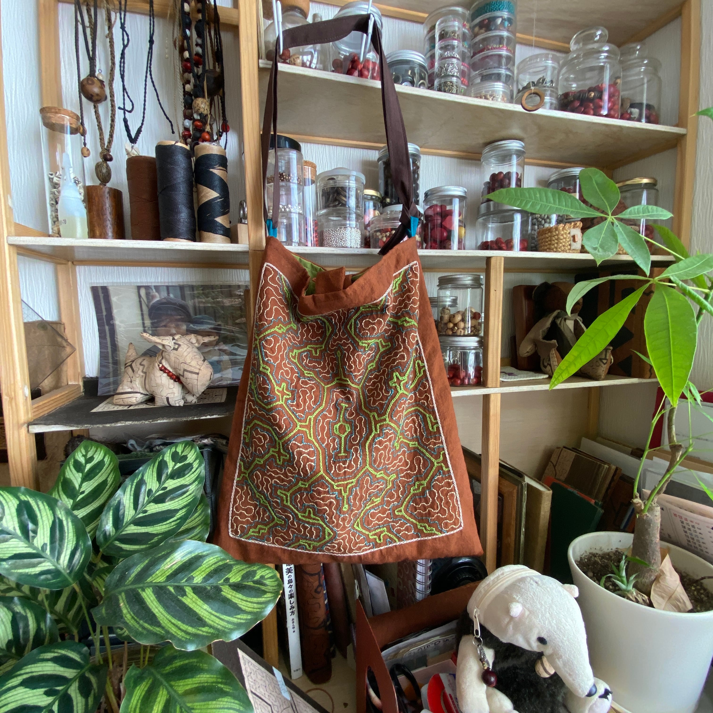 特別に柔らかいガーゼのようなコットンに、クッションサイズの大きな手刺繍素材を使ってアマゾン屋のオーナーショルダーバッグにしました。