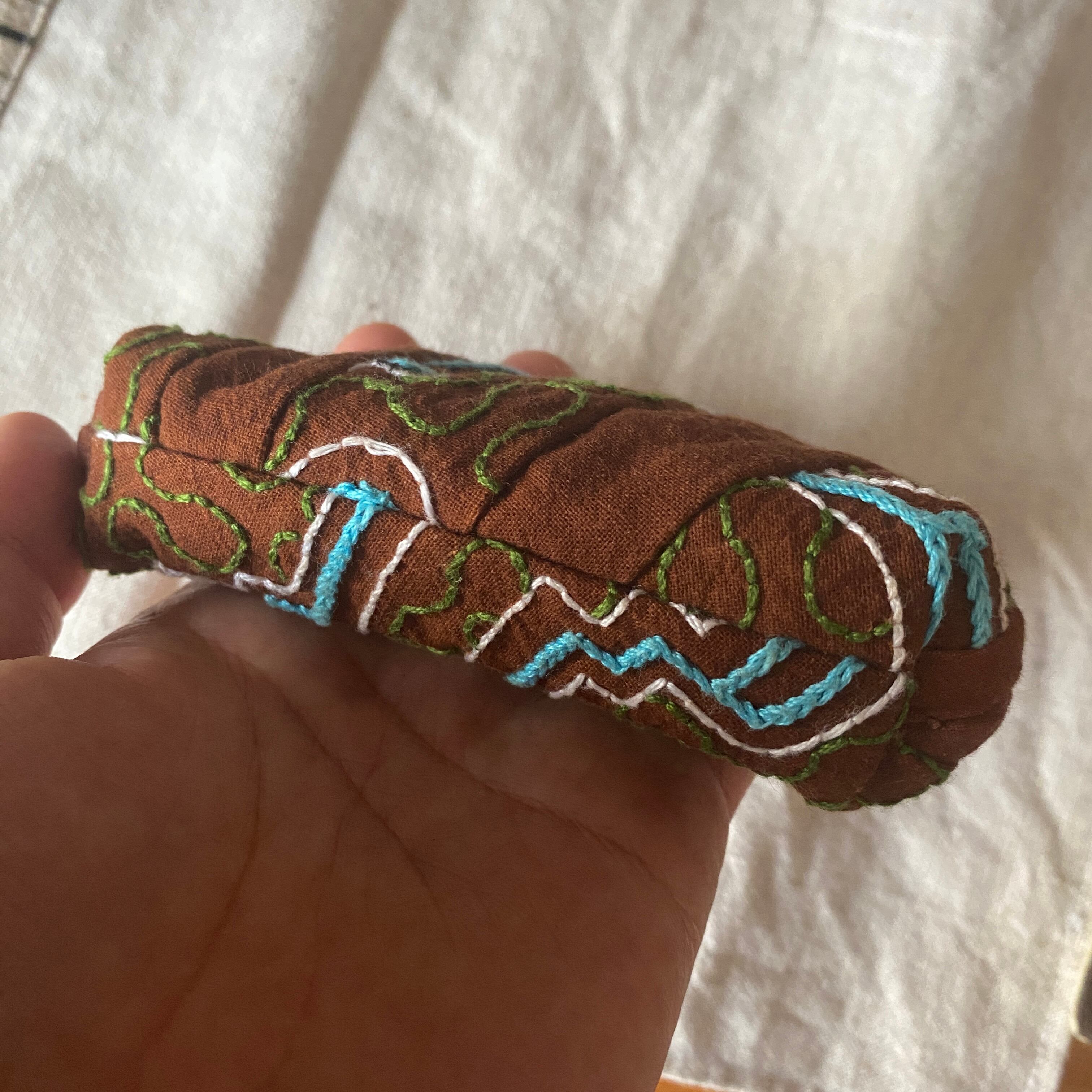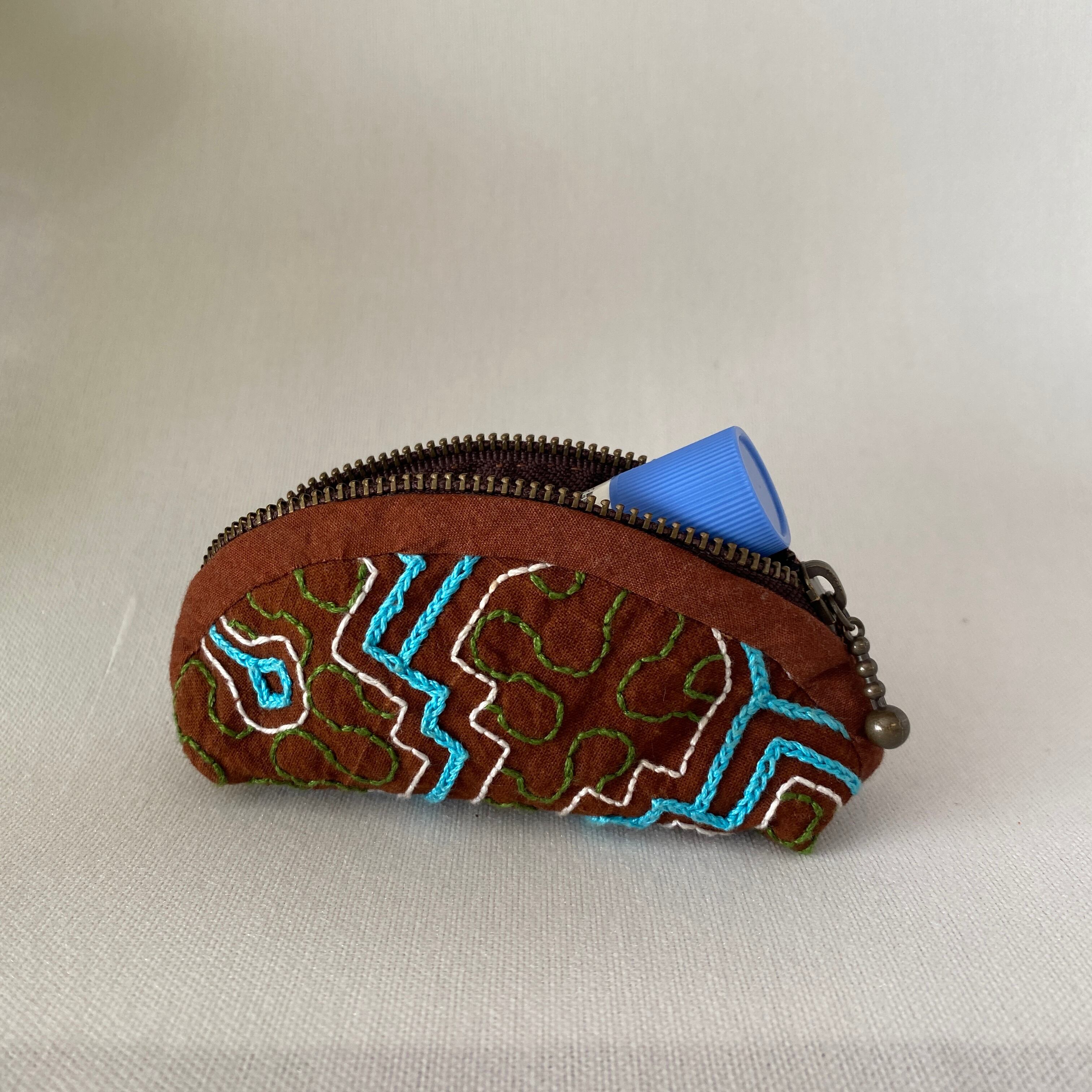 ◎丸ポーチ47 水色刺繍細長 10x5x3cm シピボ族の泥染め