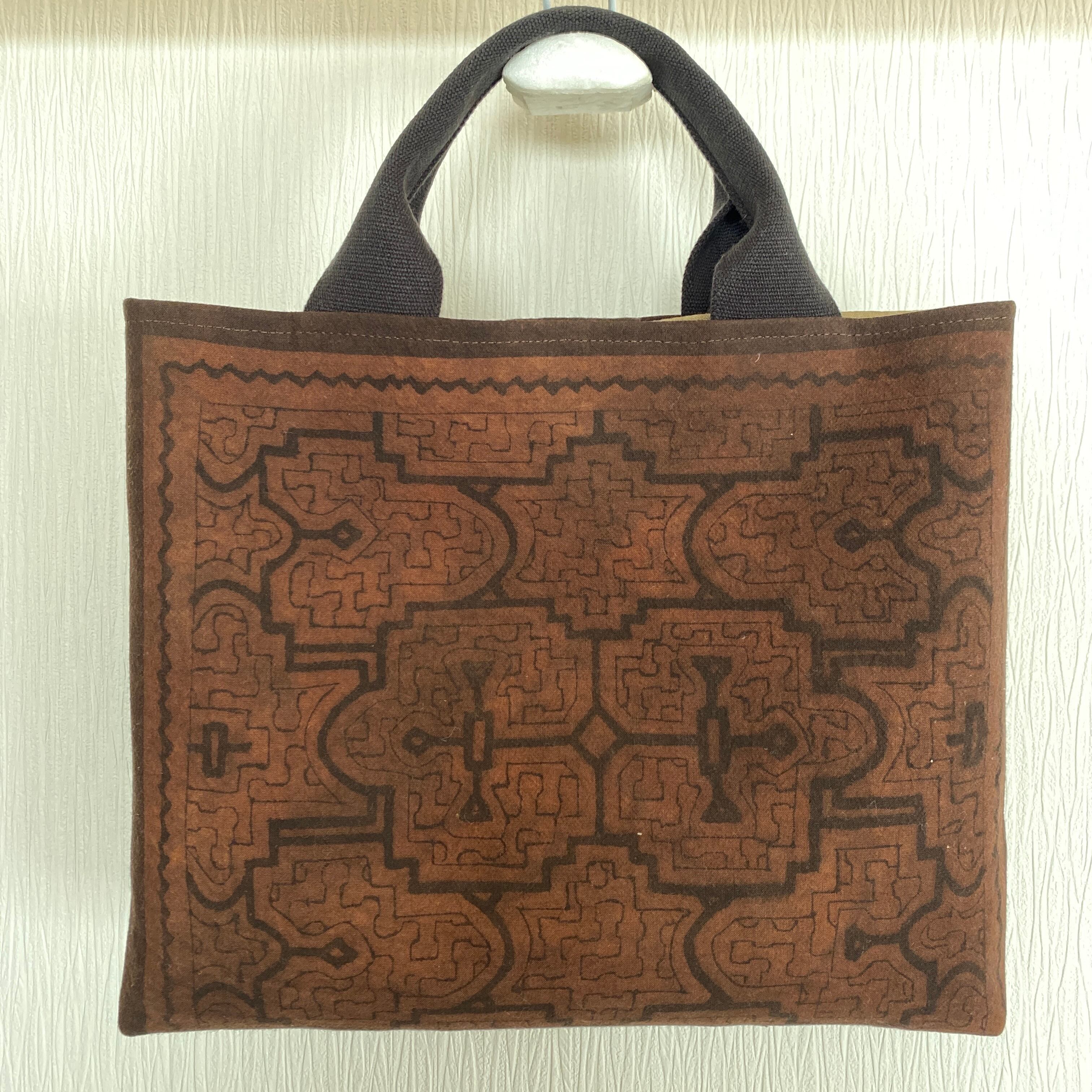 両面に色違いで小型の模様布を配置、このサイズで両面に色違いを使うのは貴重なデザインです。一番硬い芯を挟みパリッとしっかり目のサイドバッグで、持ち手は太く安心感のあるコットンテープを使いました。パソコンや書類など重いものをいれたりサイドバッグとしても使いやすいかなと思います。