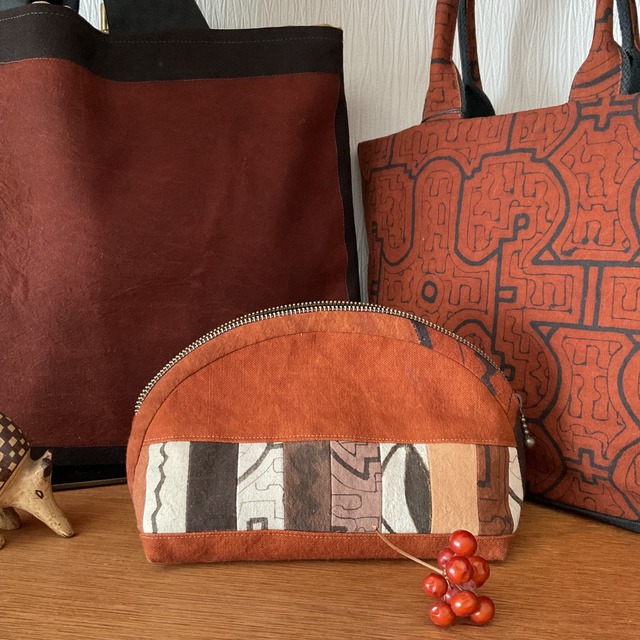 丸ポーチ59 横20cm厚み7cm シピボ族の泥染め キルト綿パッチワーク 草木染め