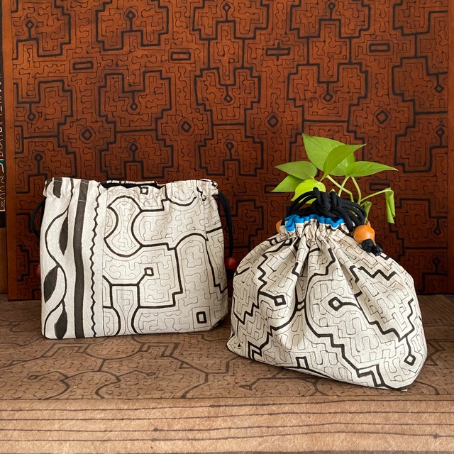 アマゾンの泥染めは、先住民族シピボ族の伝統工芸で、フリーハンドの幾何学模様を染める、希少価値の高い手工芸です。この布を使ってオーナー(AYACHI S)がバッグや布雑貨を手作りしています。 貴重な伝統工芸を少しでも長く作り続けて欲しいという想いから続けている活動です。