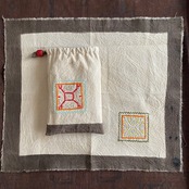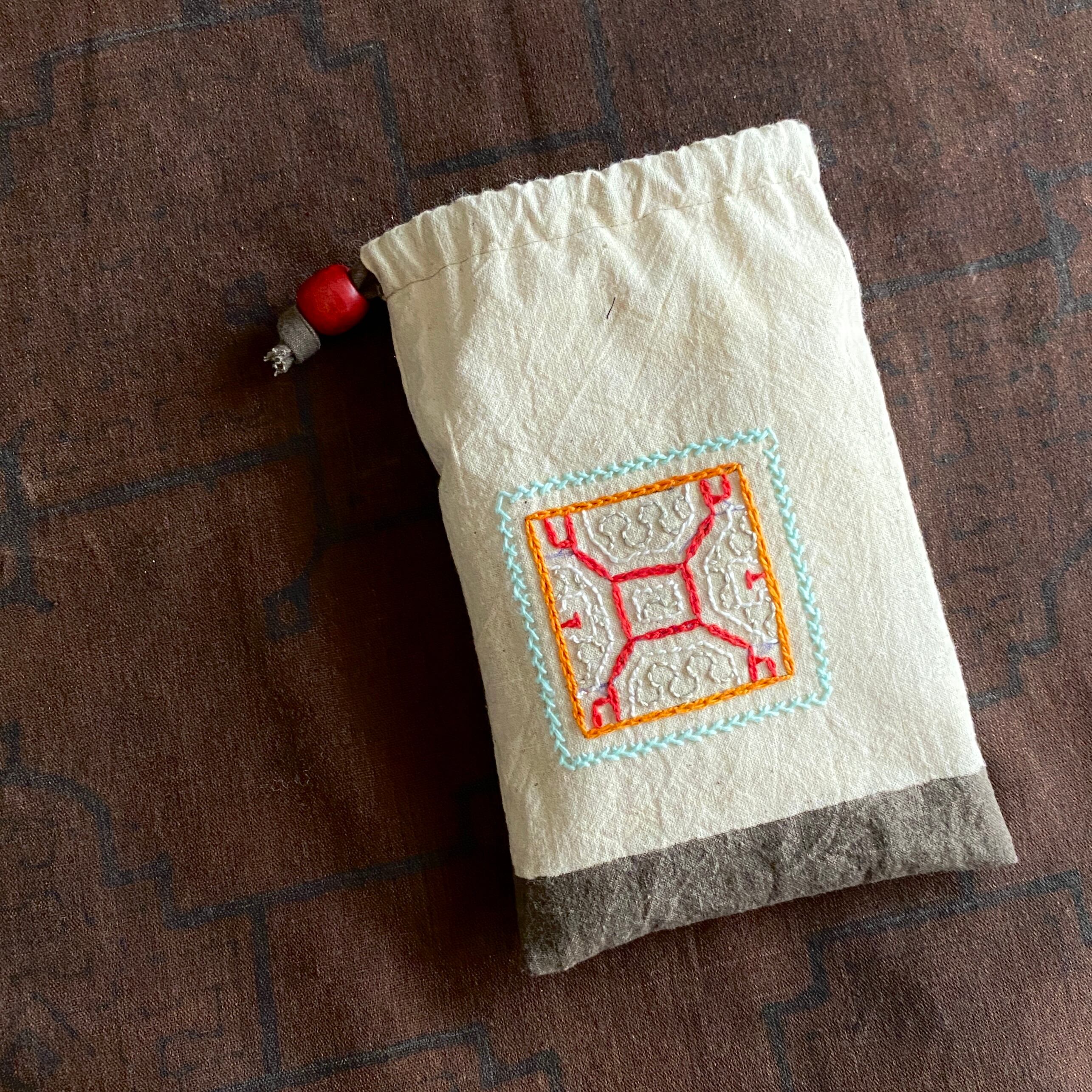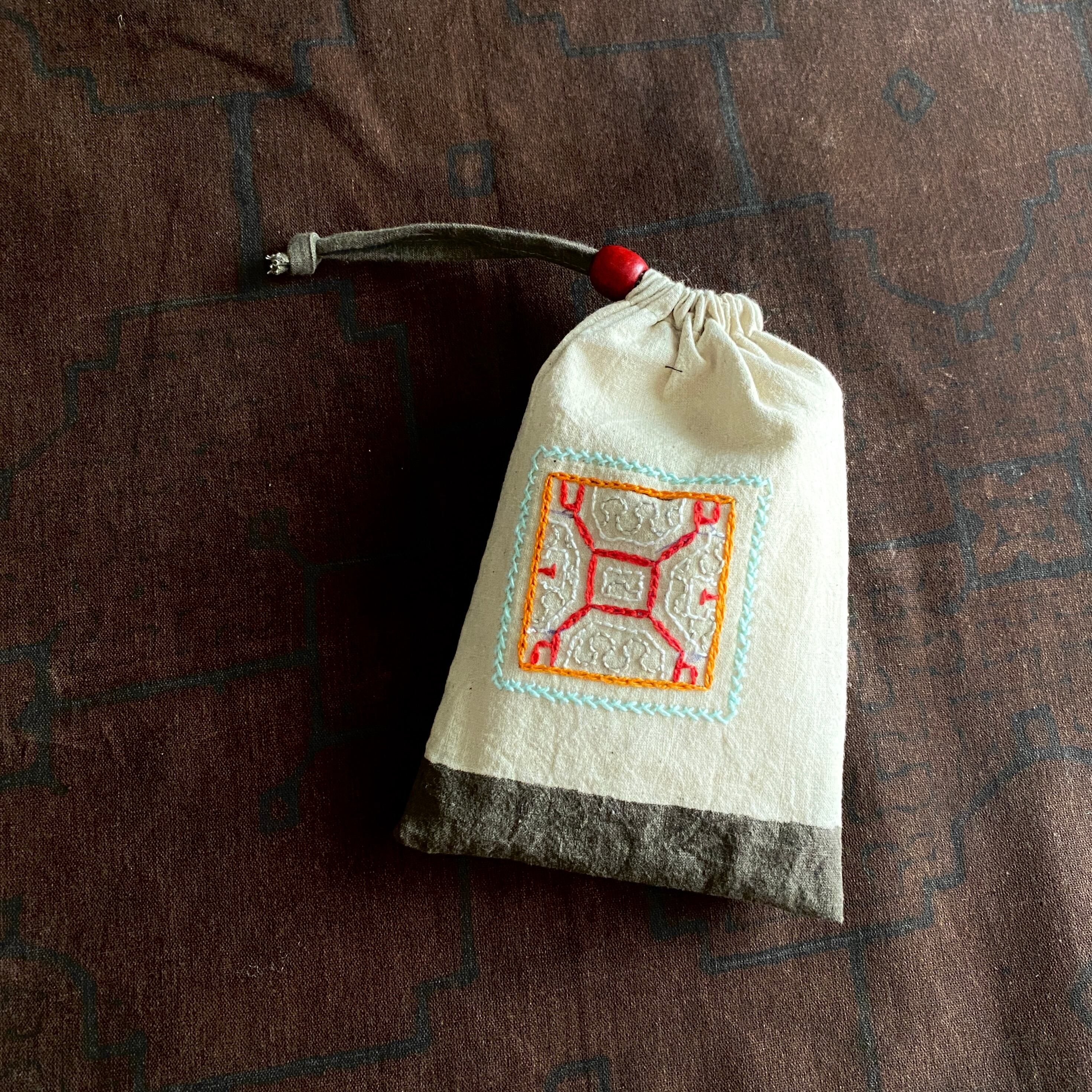 巾着袋 ワンポ刺繍白2 シピボ族の泥染め 赤刺繍シャーベットカラー
