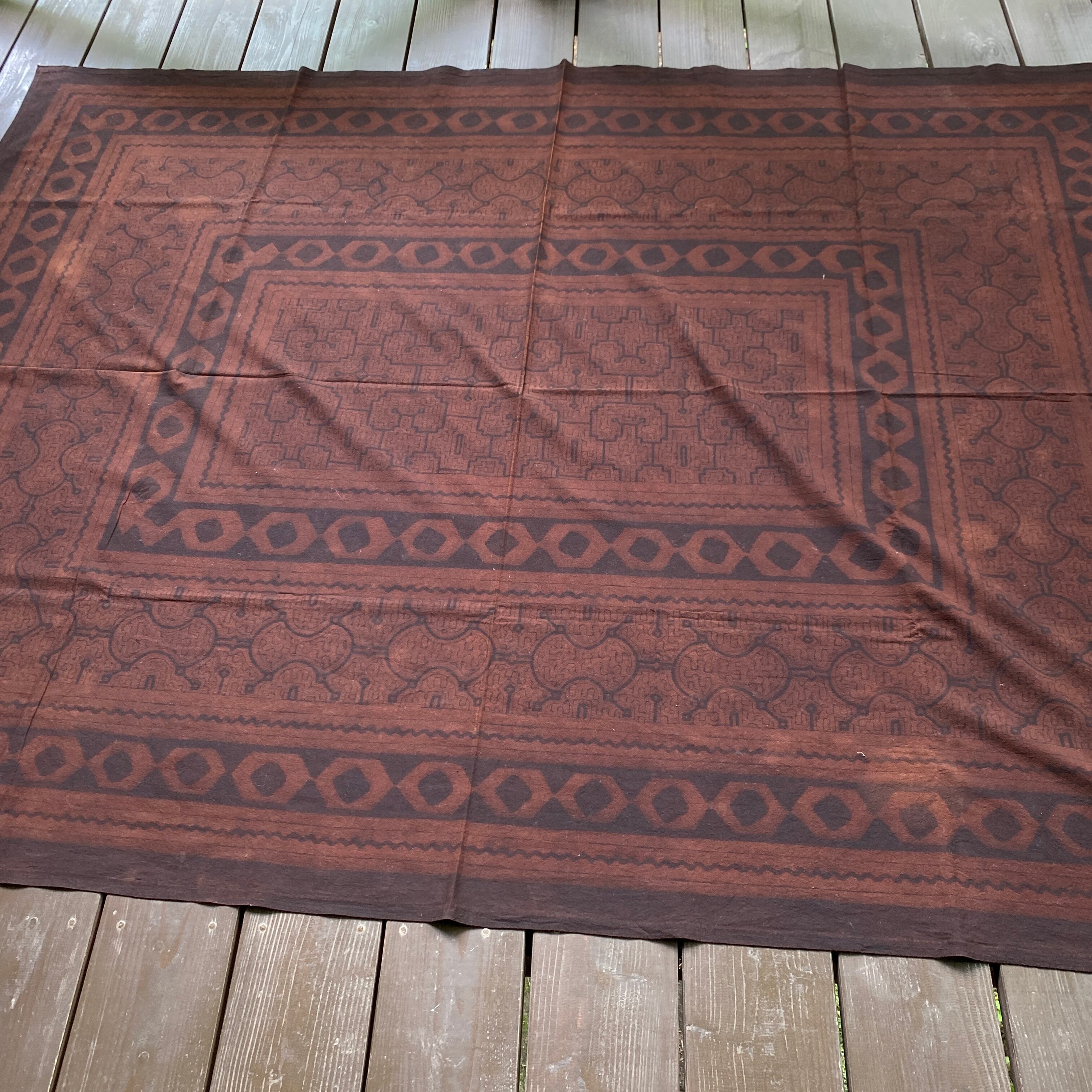 茶色と白地の二種類あり、どちらも「タンニン」を含む樹皮を煮出した染料と、森の奥地から採取する「鉄分」の強い特別な泥の化合を利用した染色方法で、フリーハンドで描かれる幾何学模様のデザインの部分だけが黒く染まることが特徴です。