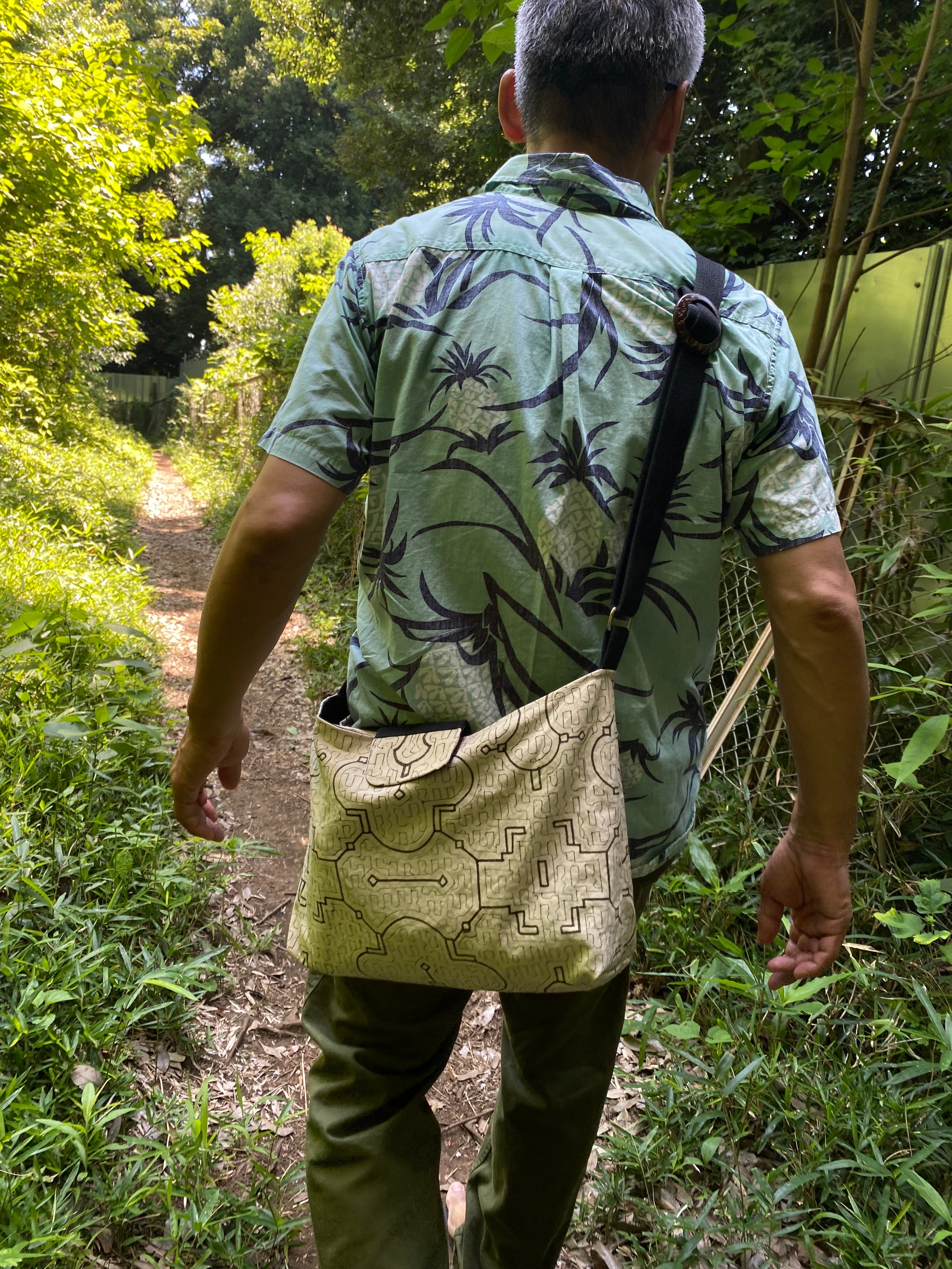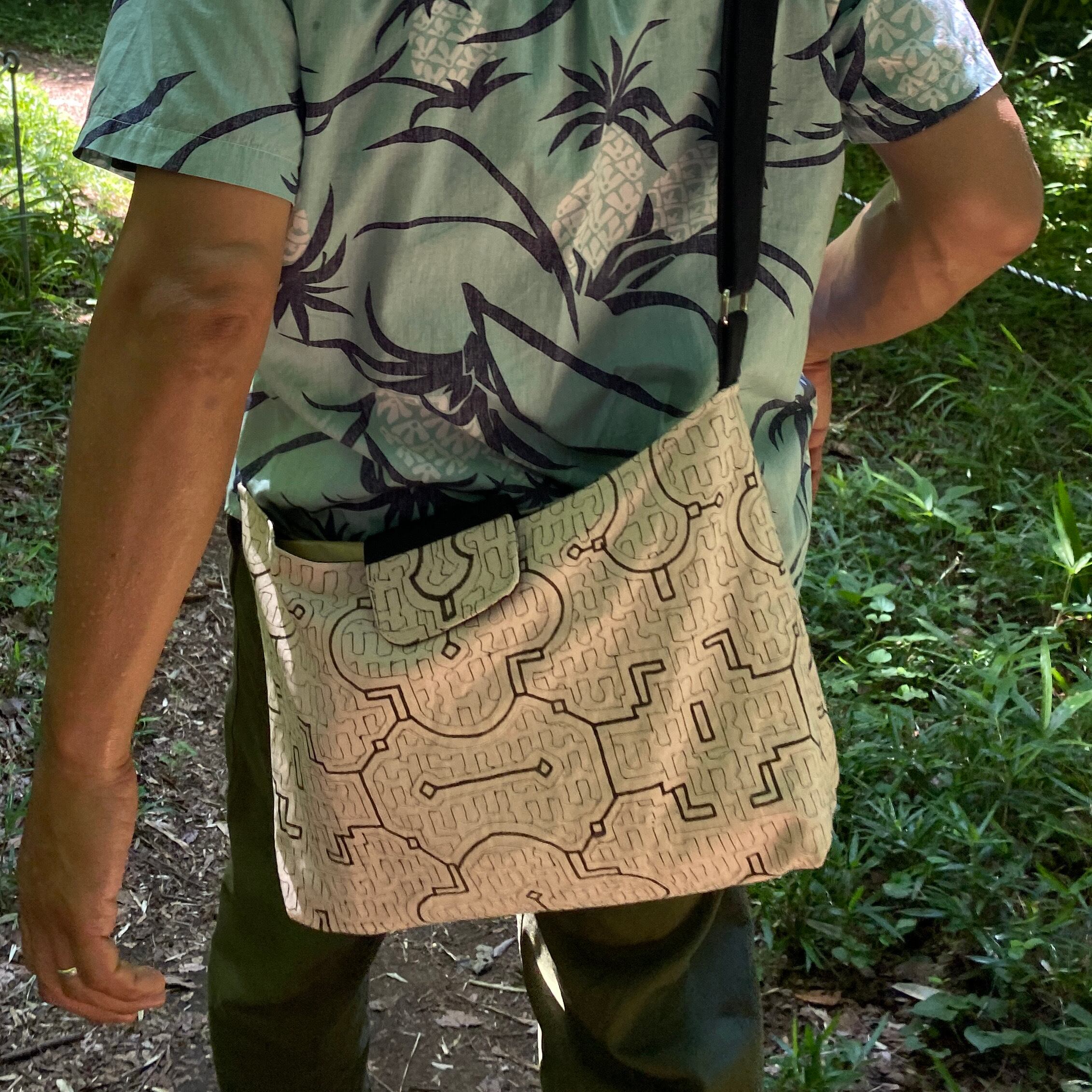 シピボ族の女性たちが染めた泥染め布を生かすため、アマゾン屋が日本で、ひとつひとつの布に合わせた小物を手作りしています。