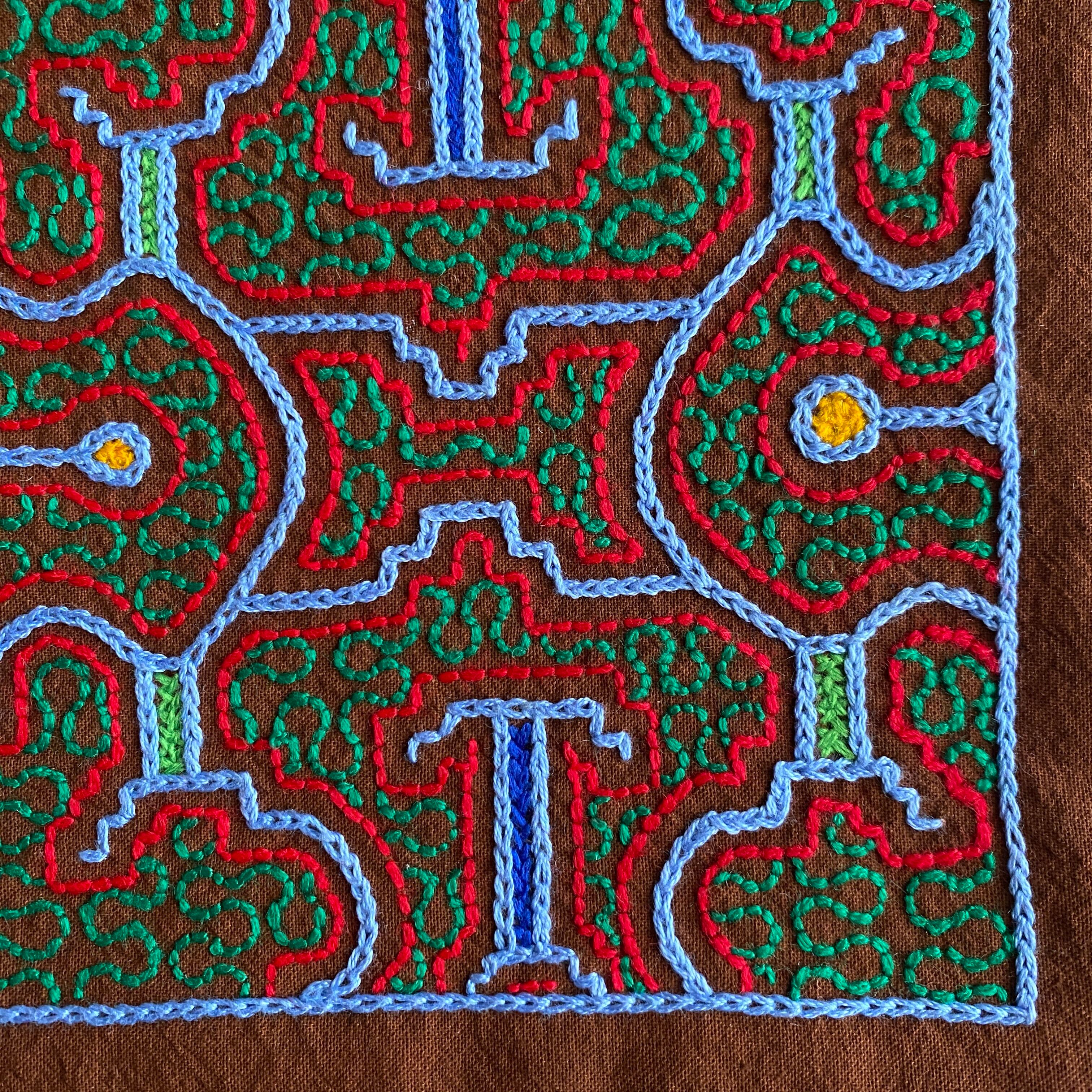 額装用のゴージャス刺繍を、キルト芯を入れて分厚いマットにしました。不思議な幾何学模様はシピボ族の精神世界を表すと言われる不思議な模様です。