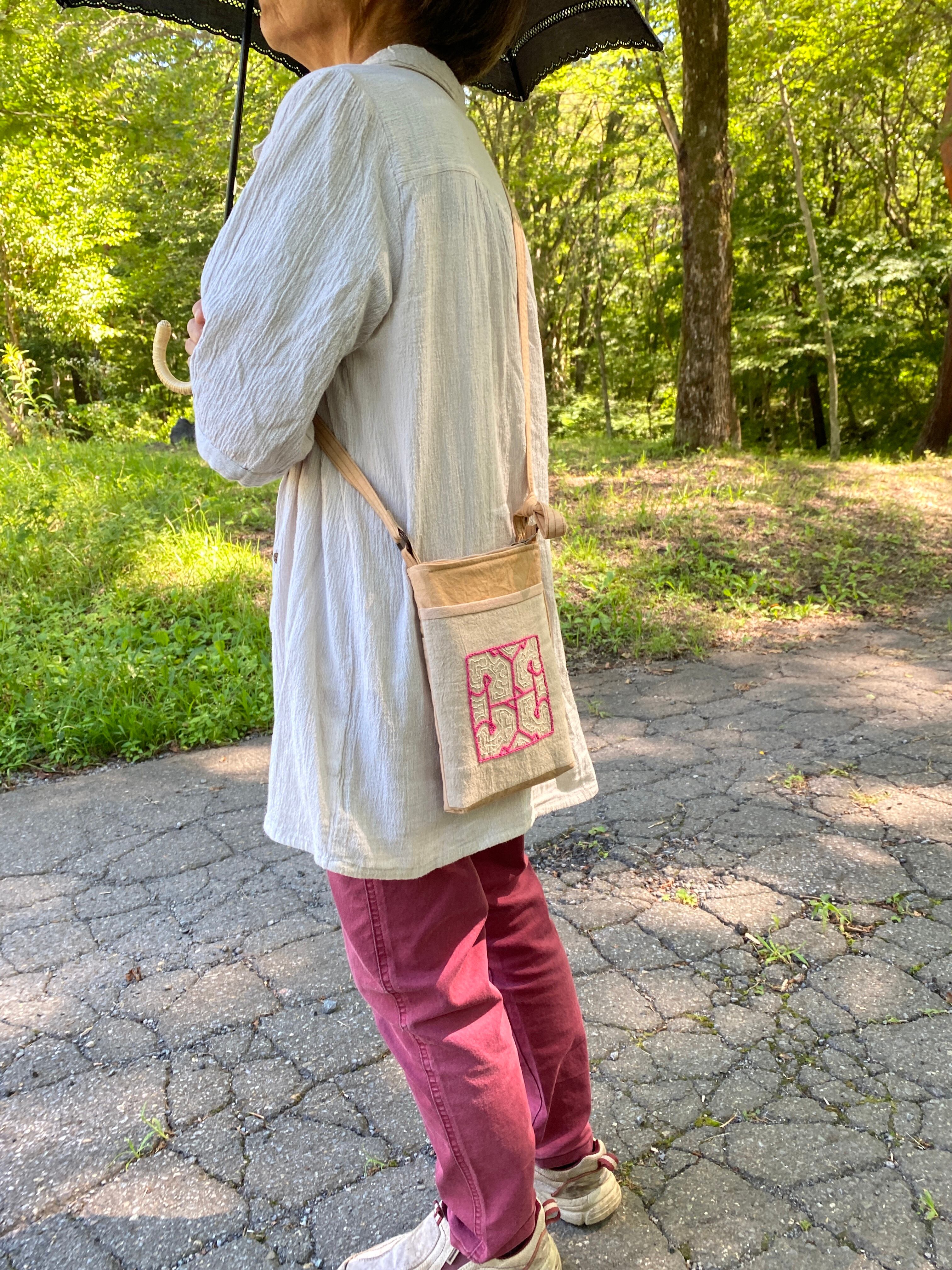 ポシェット77 ピンク刺繍4ポケット付き 16.50x22cm ファスナー草木染めパッチワーク シピボ族の手刺繍 縦長ポシェット