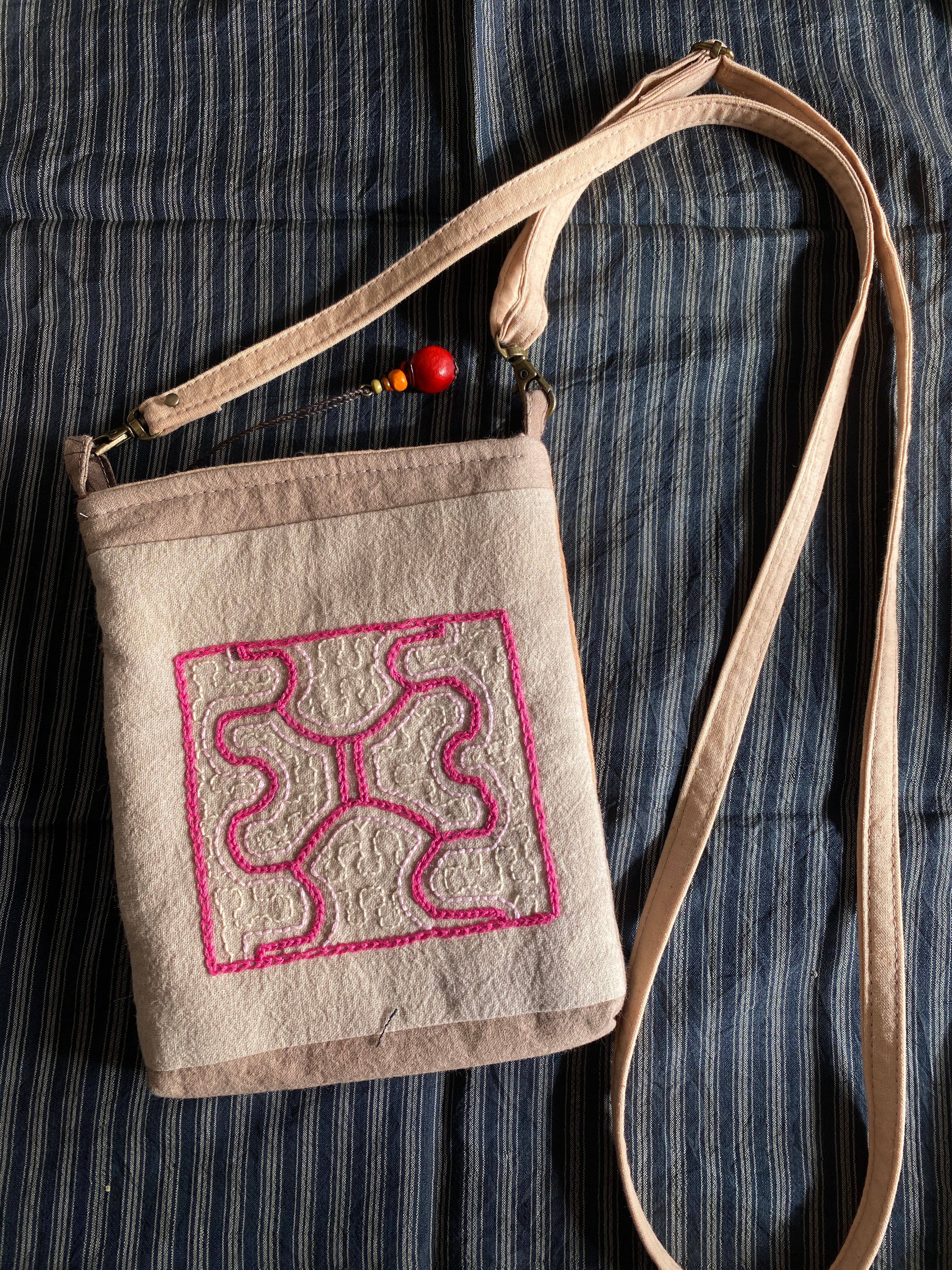 シピボ族としては珍しい色の組み合わせで可愛らしい仕上がりです。刺繍糸は濃いピンク、薄いピンク、クリーム色の3色